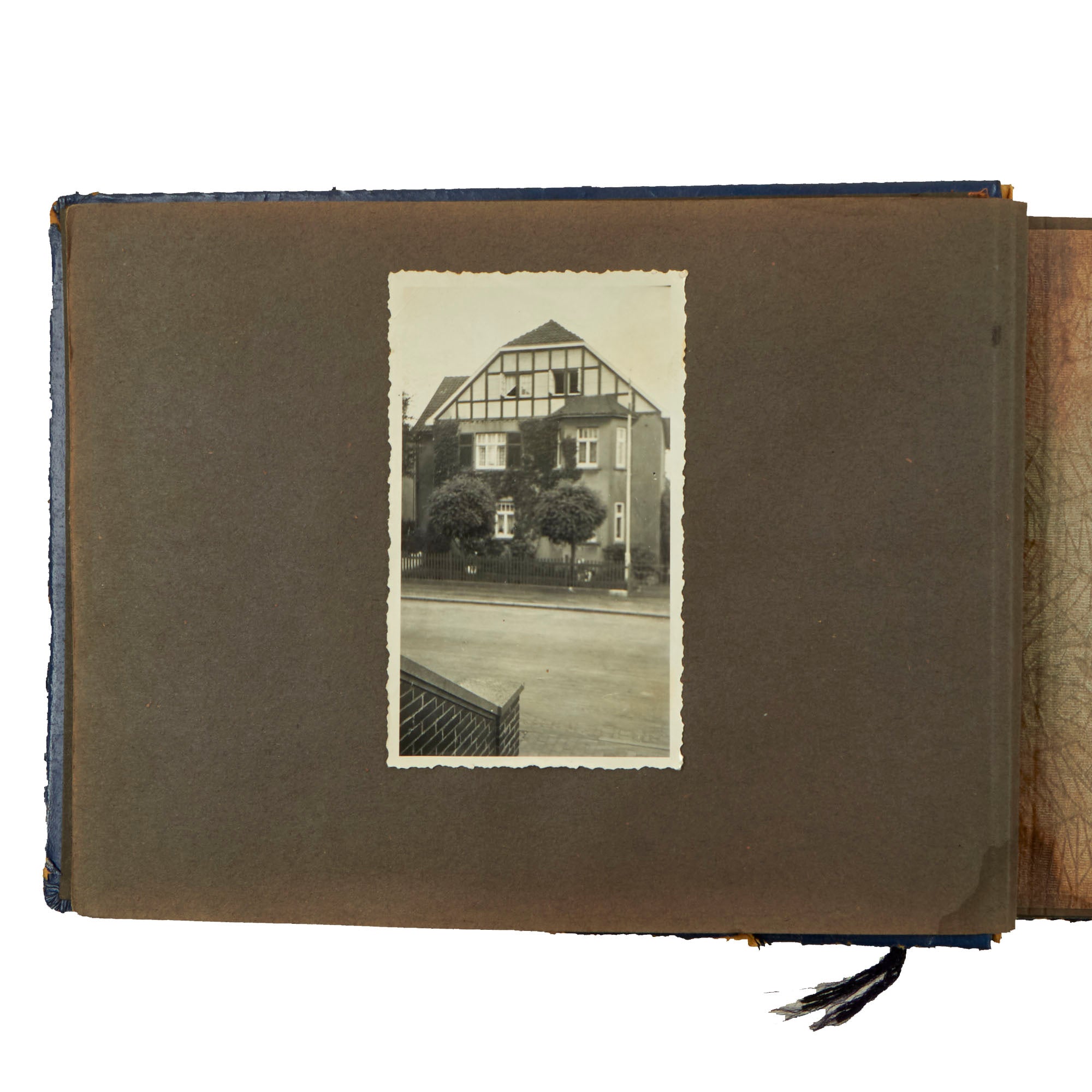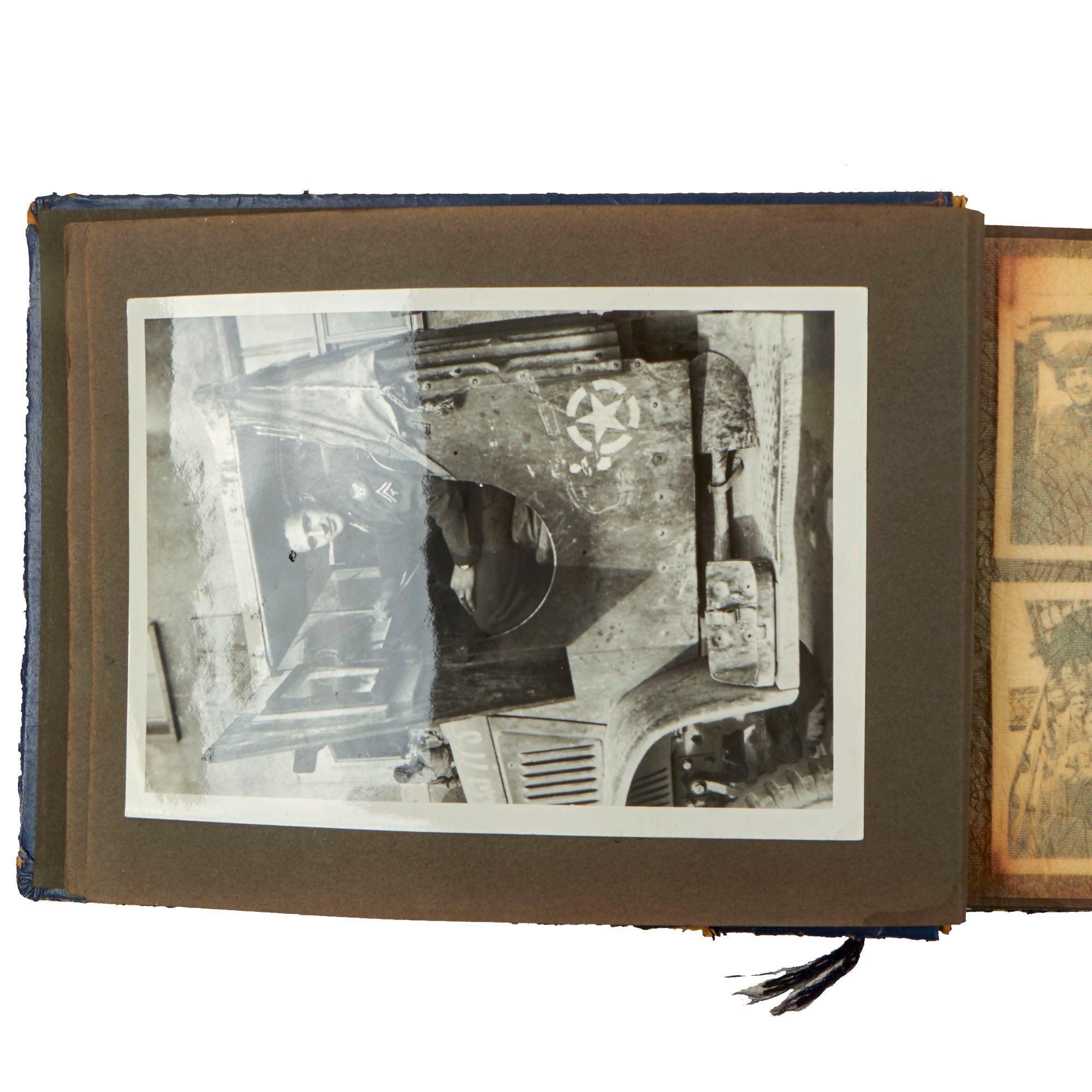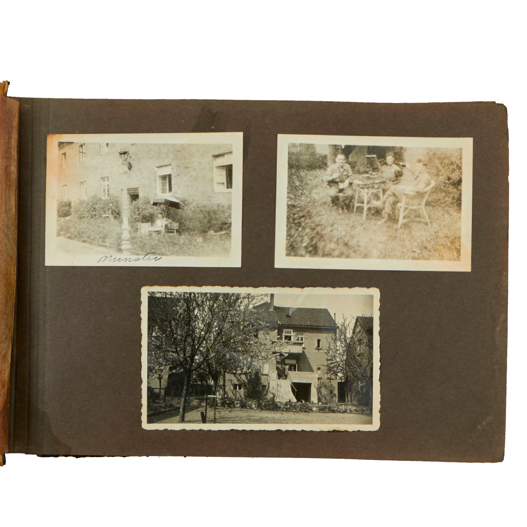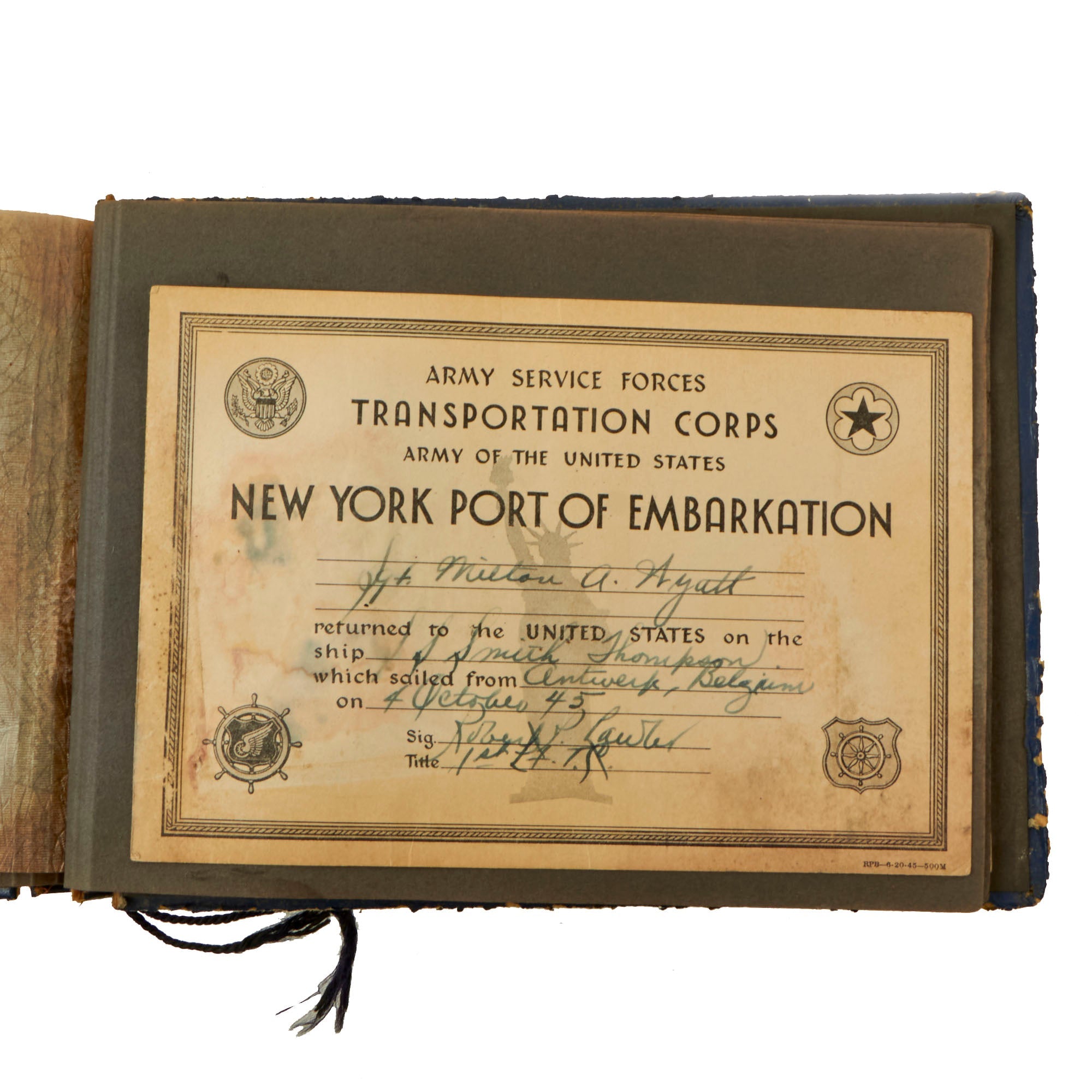 Original Item. One-of-a-Kind. This is a German Luftwaffe photo album that was captured by Technical Sergeant Milton A. Wyatt, 332nd Engineer General Service Regiment, 9th Army. While with the 9th Army, Wyatt served alongside many soldiers of the 29th Infantry Division, and a great many of his photographs are of men from the 29th, with a gorgeous patch of the 29th affixed to the interior cover. The album measures roughly 7 x 10” and the back cover is close to coming off from heavy wear.