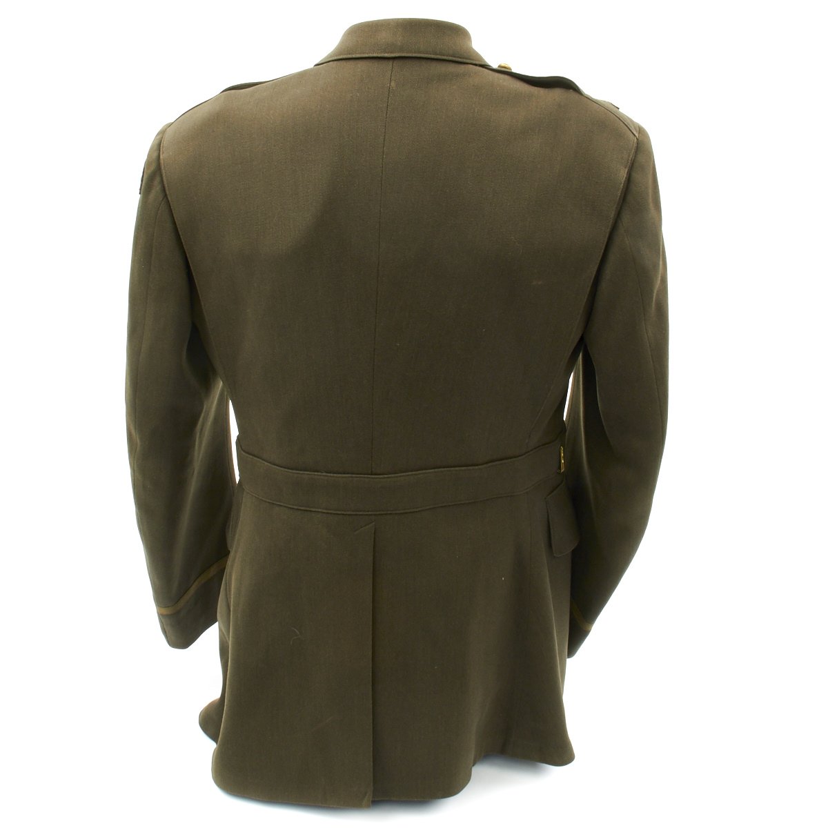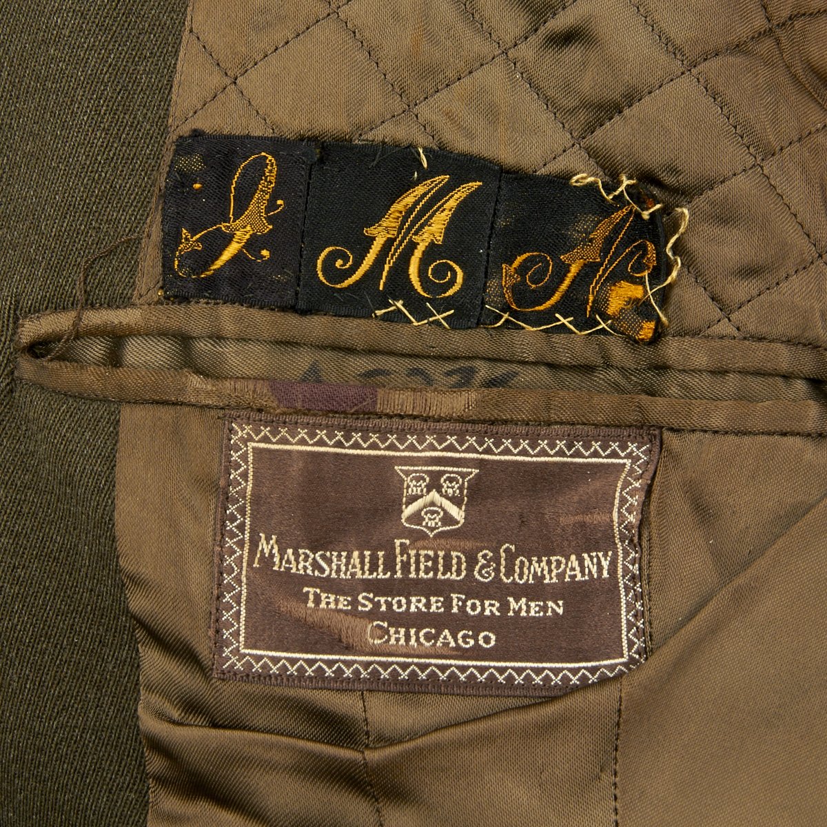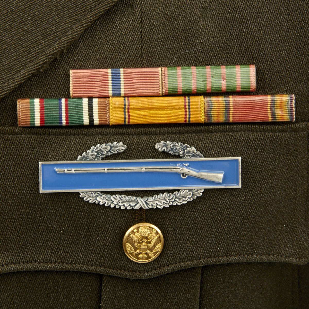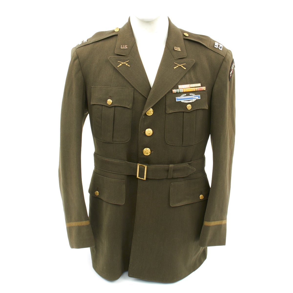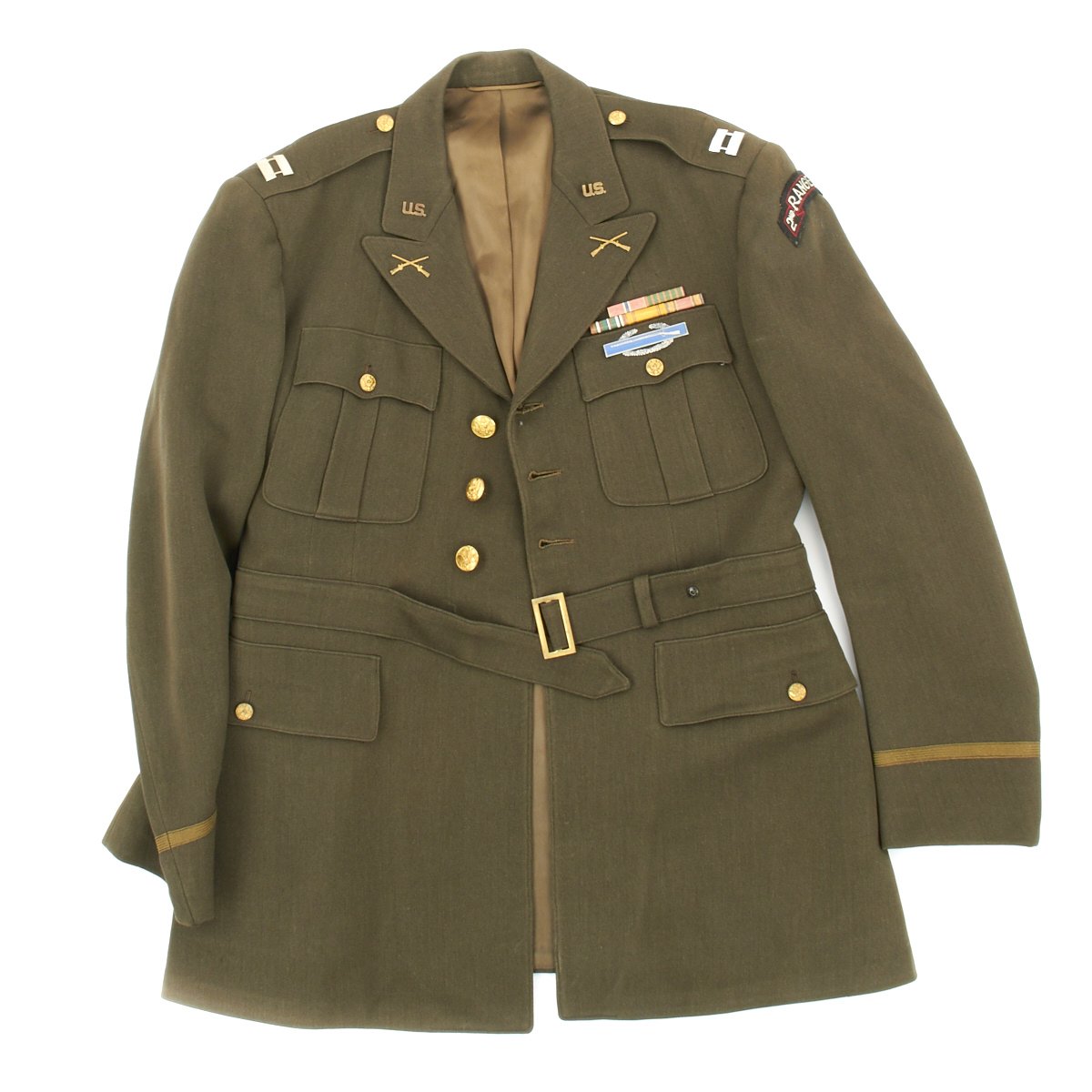This is an original Class A Uniform Jacket named with laundry number to the interior A-3235 and his initials stitched above the inside pocket J.M.A. The left shoulder bears a 2nd RANGER Battalion embroidered badge. Medals ribbons include: Bronze Star, Croix de Guerre, American Campaign Medal, European–African–Middle Eastern Campaign Medal, WWII Victory Medal. The jacket also has his Sterling Silver Combat Infantry Badge. Size is 42R and it is in excellent overall condition.
