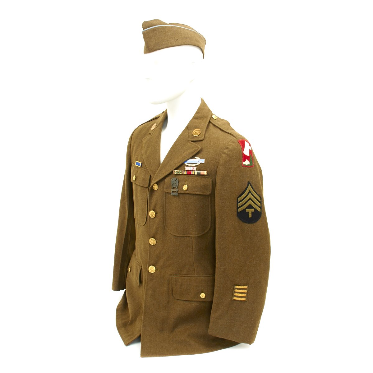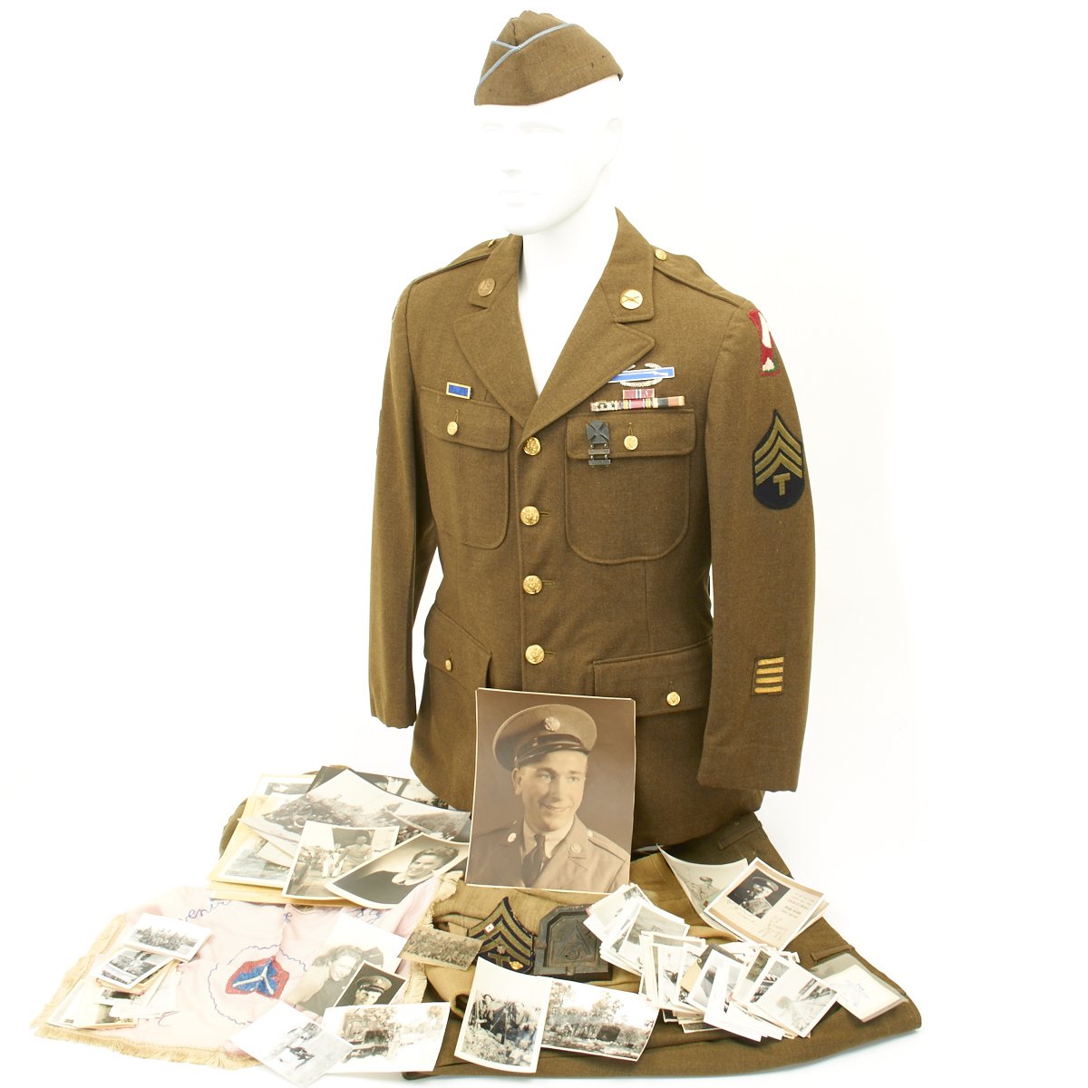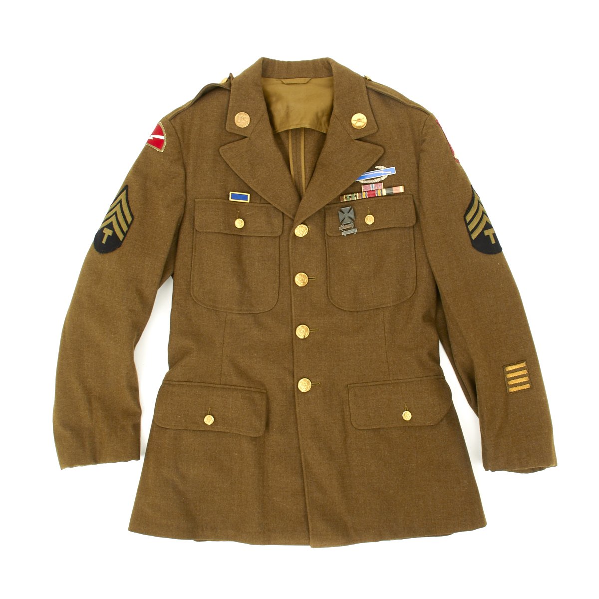 - Class A Uniform four pocket tunic with 78th Infantry Division patch on right shoulder, 70th Infantry Division patch on left shoulder, sterling silver Combat Infantryman's Badge, Medal ribbons (Bronze Star, European-African-Middle Eastern with three battle stars, WWII Victory Medal, Army of Occupation), Presidential Unit Citation, Rifle Expert, Technician 4th Grade Chevrons, infantry lapel pins and 4 overseas service bars on left sleeve indicating 24+ months of overseas service.