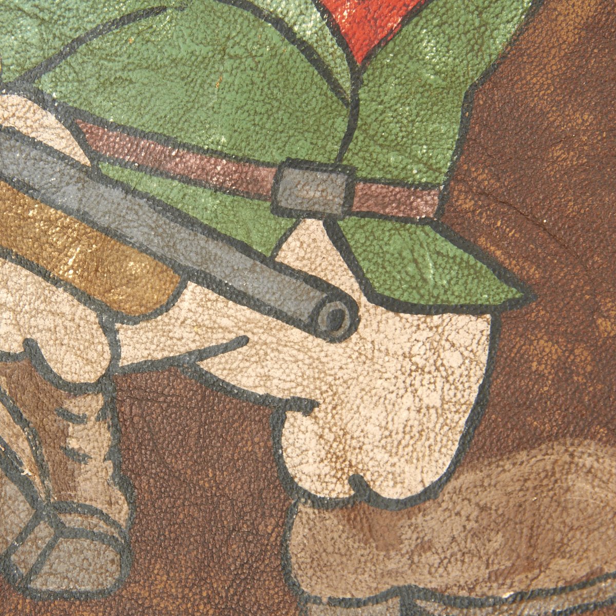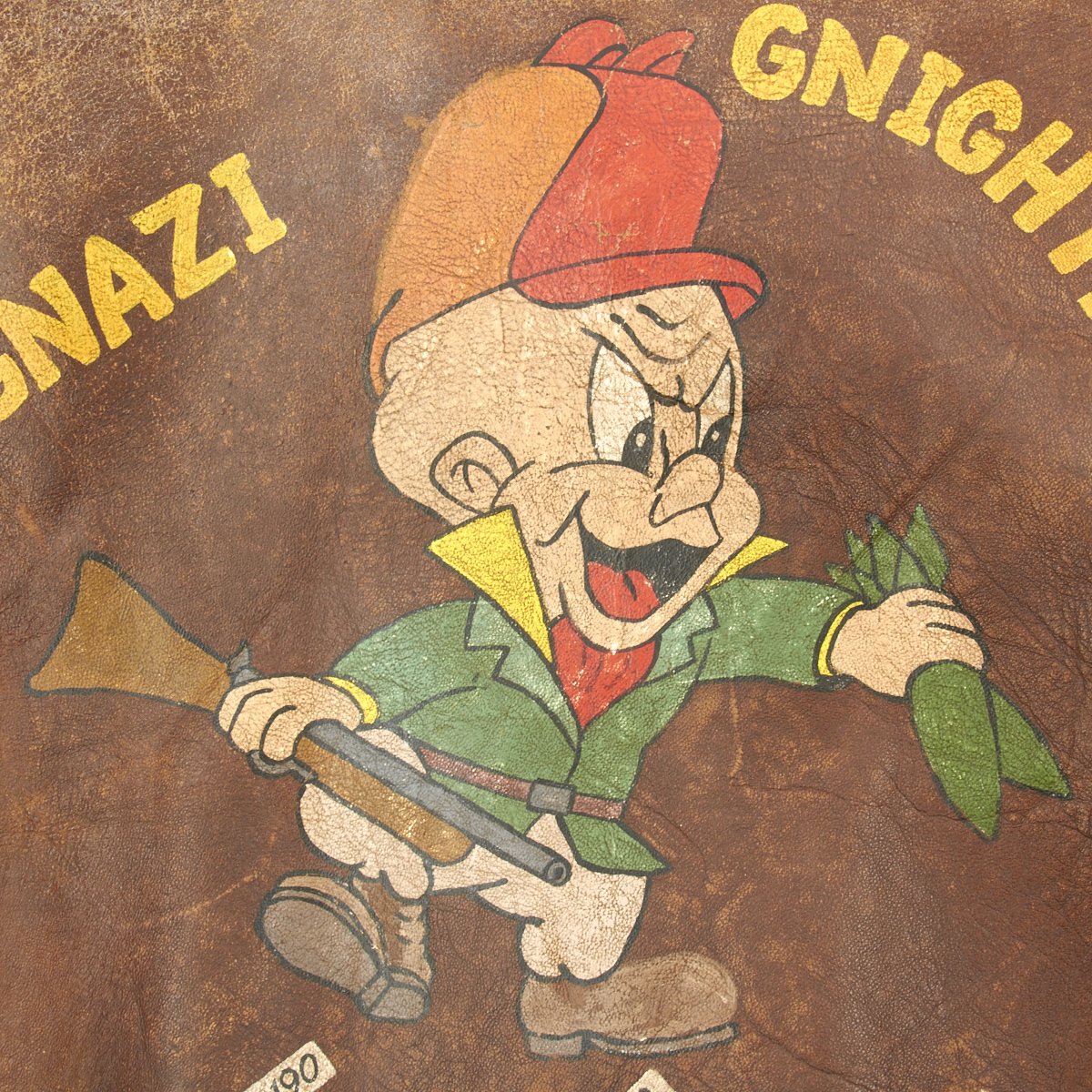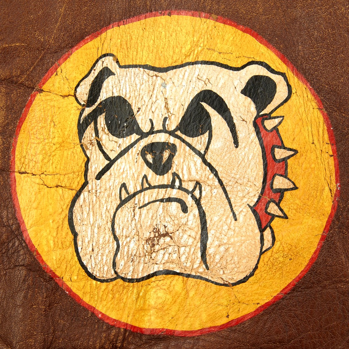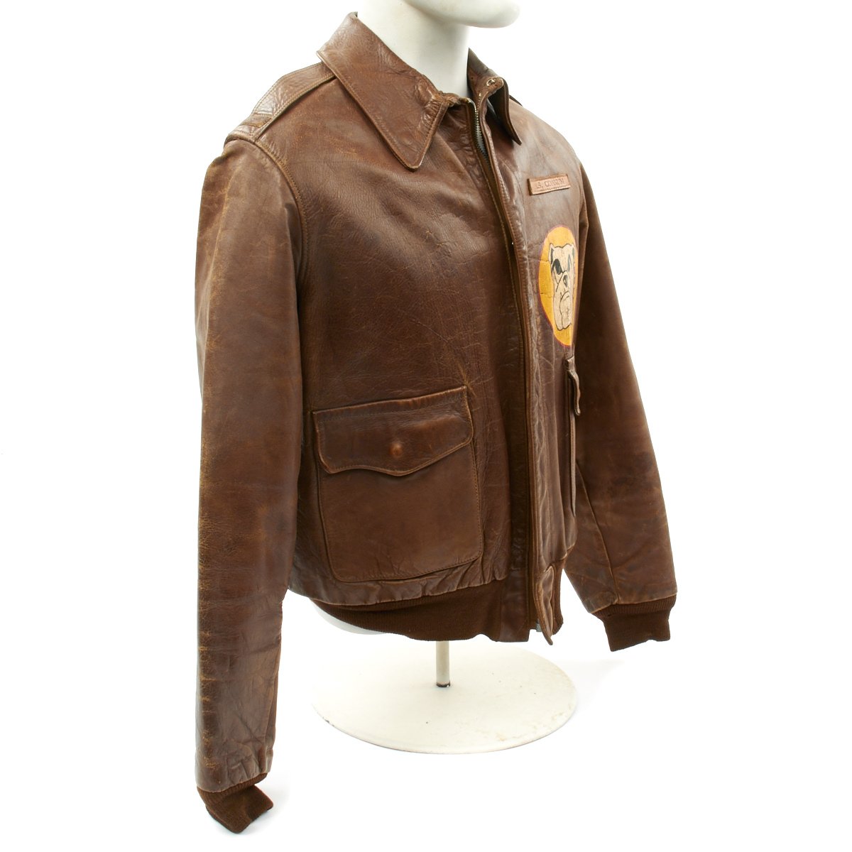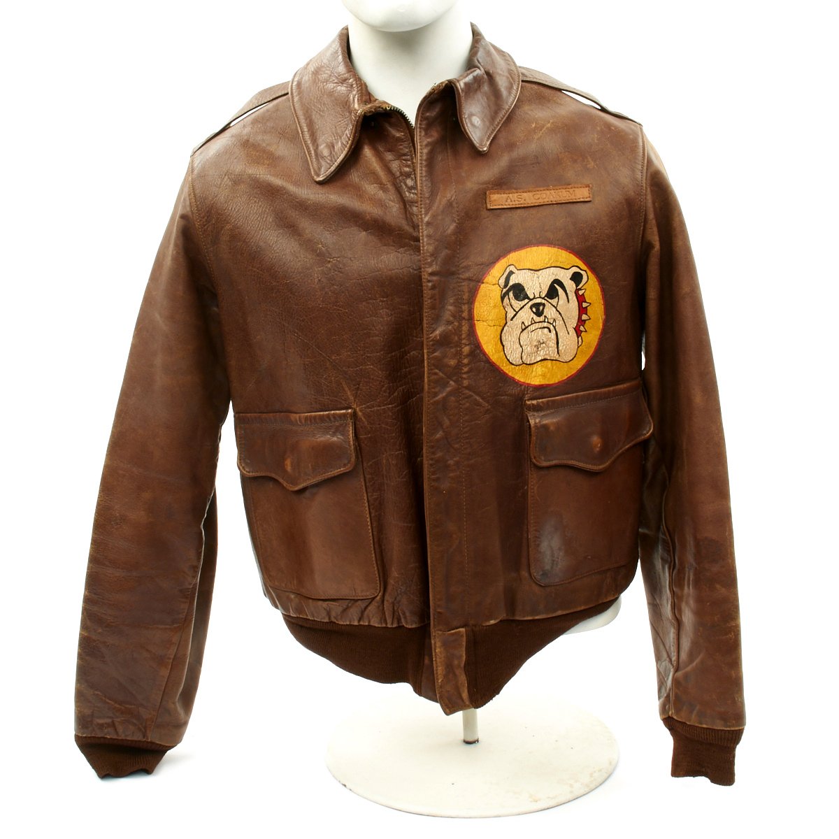 The most notable aspect of this jacket is the exceptional hand painted artwork. The left front chest bears the an incredibly rare 313th Fighter Squadron hand painted bulldog insignia. This patch features original period authentic vibrant colored paint. Above the patch is an embossed leather name tag that reads A.S. COAKUM.