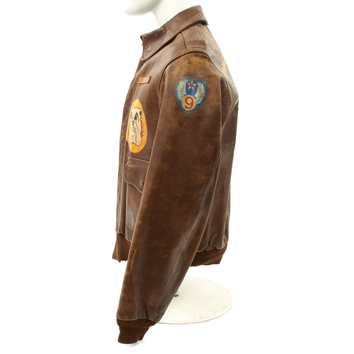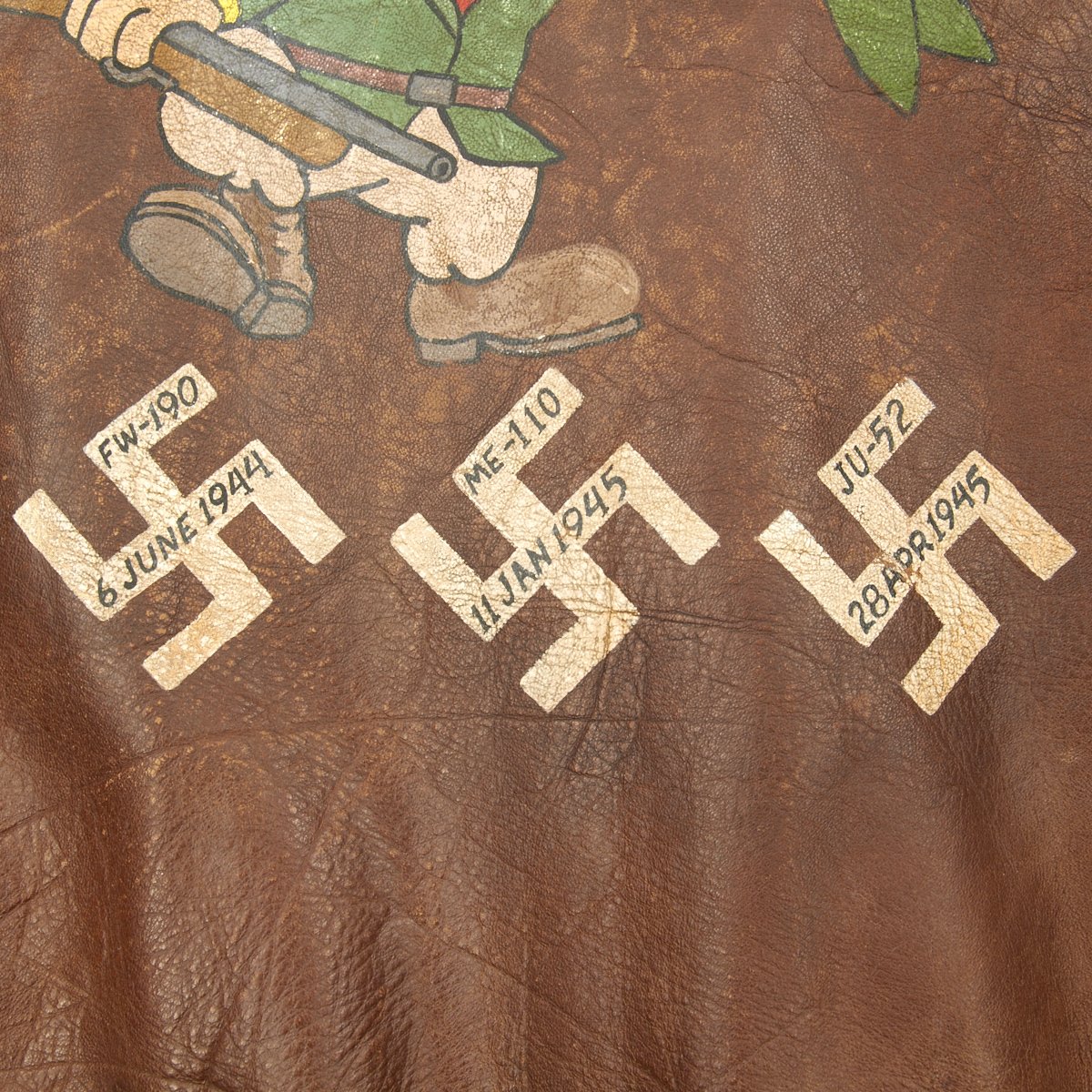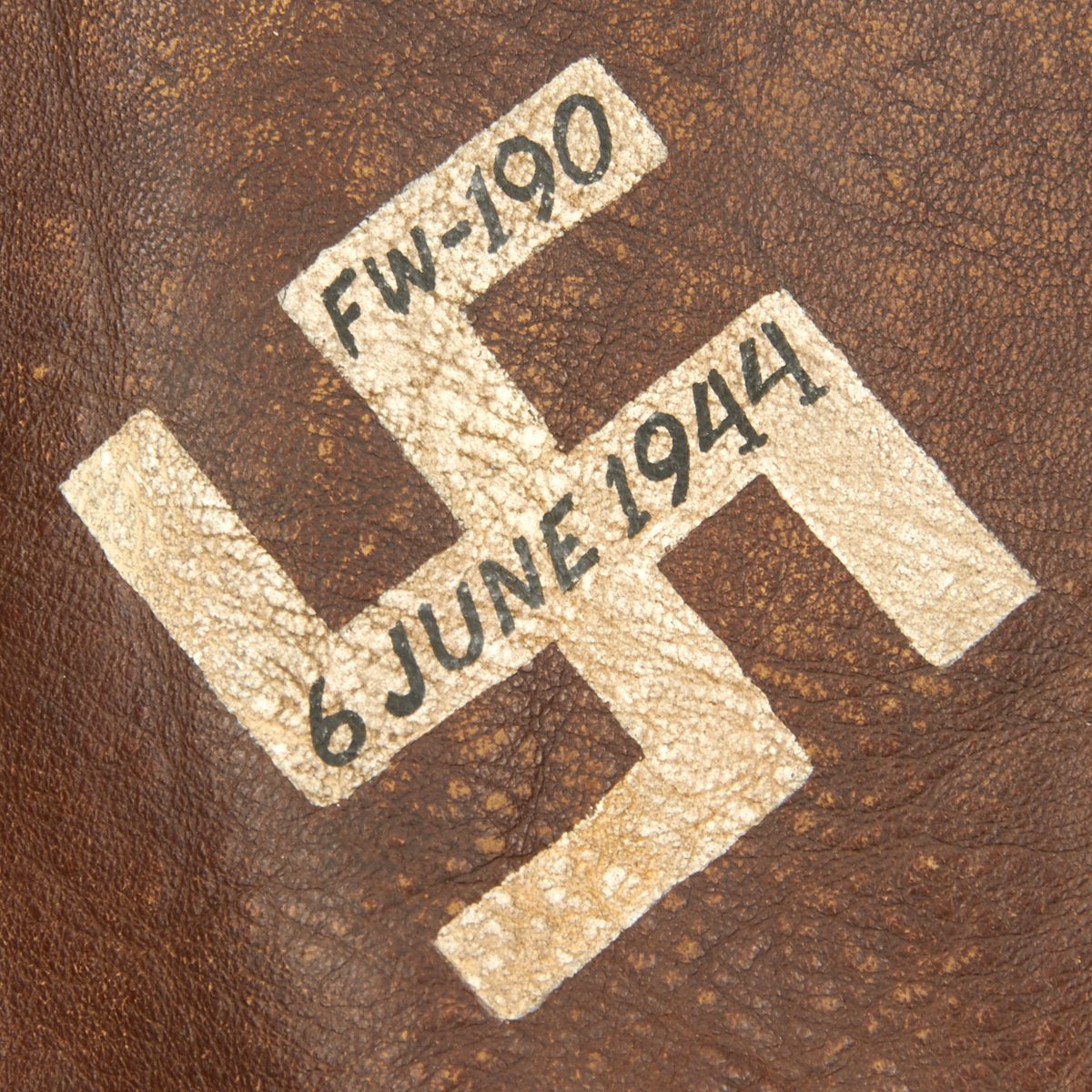 Original Item: One-of-a-kind. This is an exceptional A2 leather flight jacket issued to a Lieutenant A.S. COAKUM who was a pilot in the 9th Air Force, 50th Fighter Group, 313th Fighter Squadron. We have not been able to find research on Coakum, but this fighter group did participate in the D-Day invasion and the jacket credits the owner with a downed Focke-Wulf Fw 190 on June 6th, 1944.