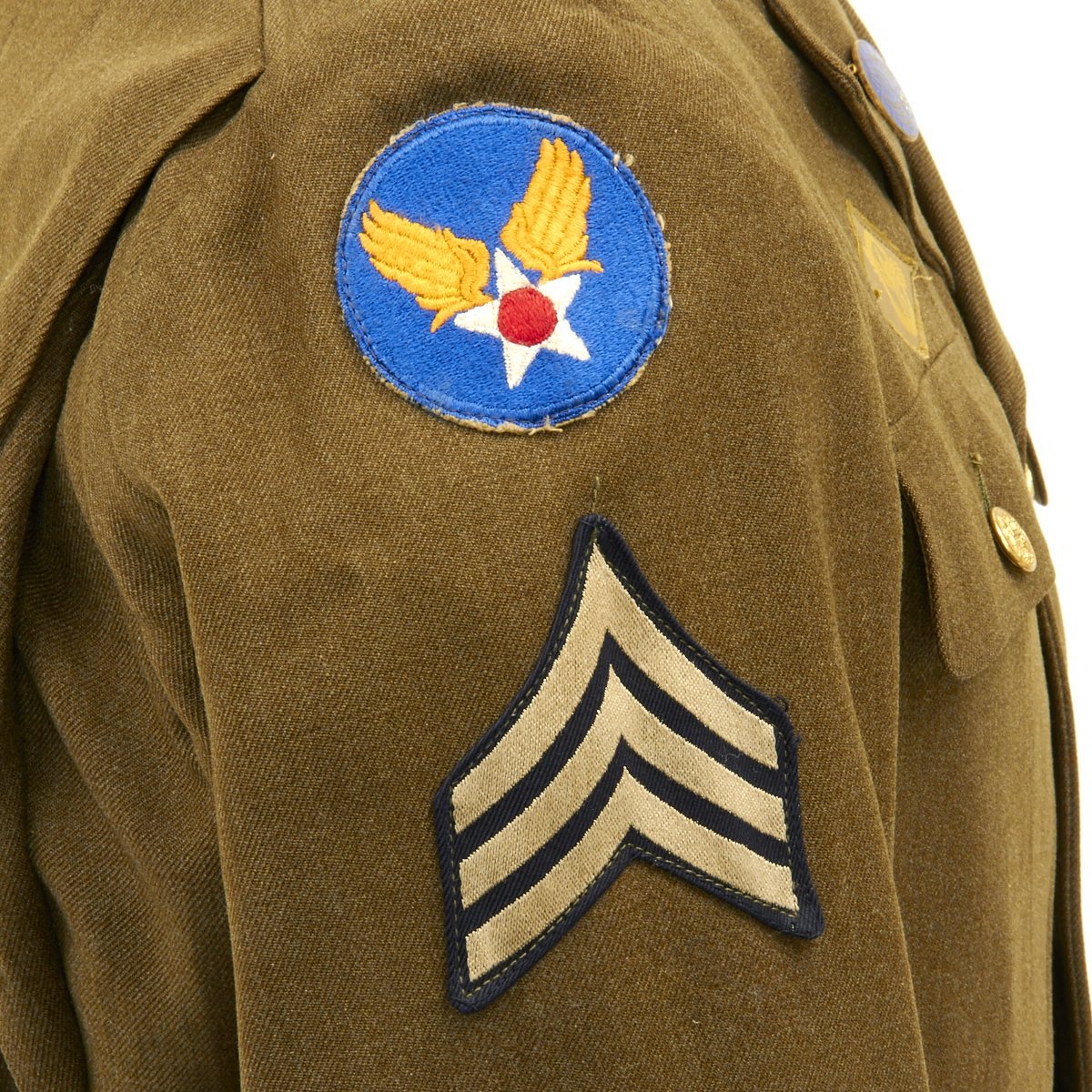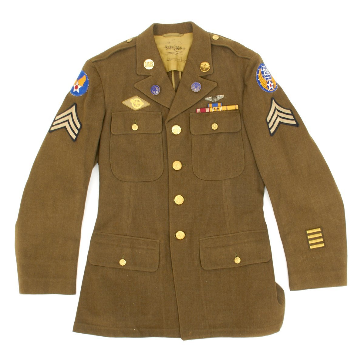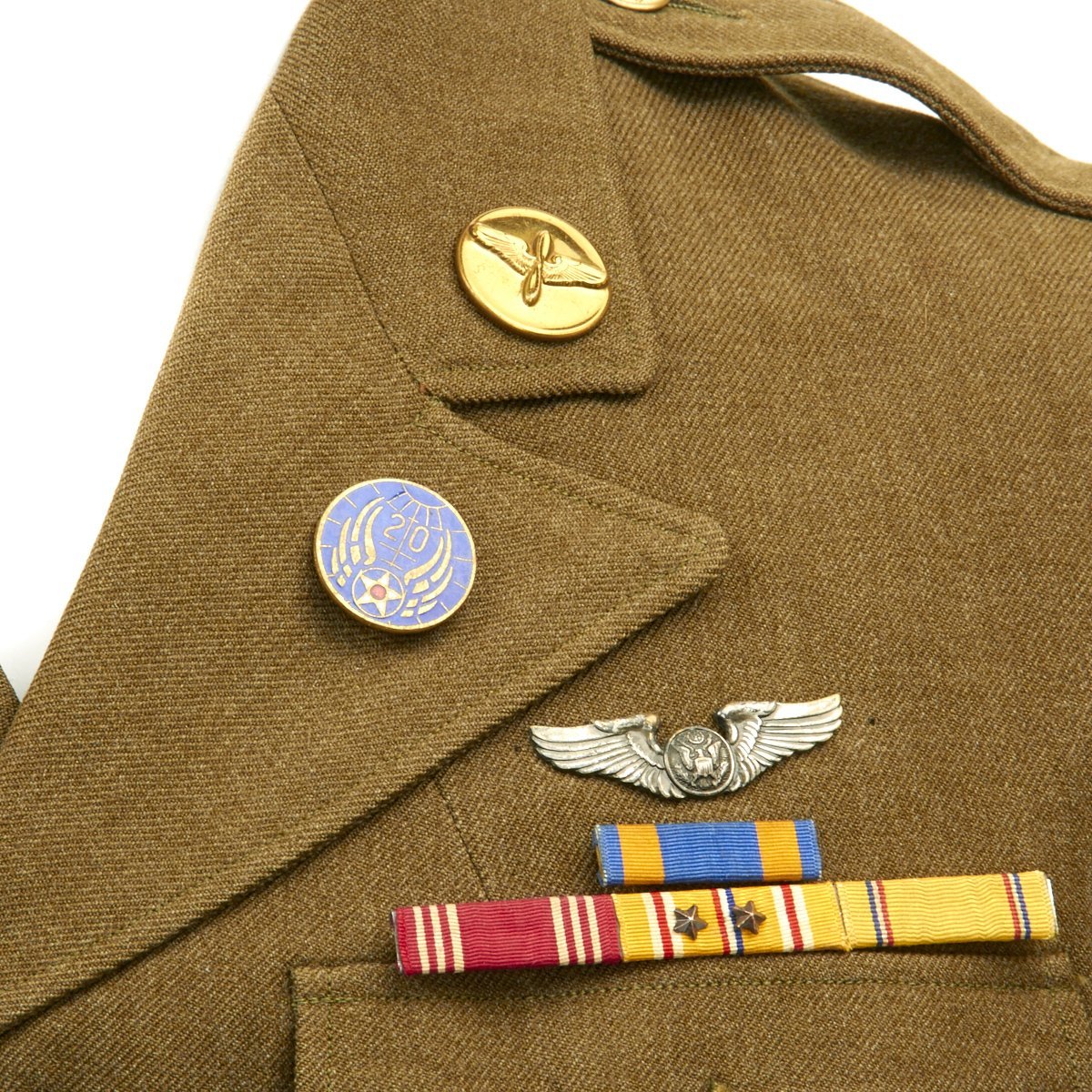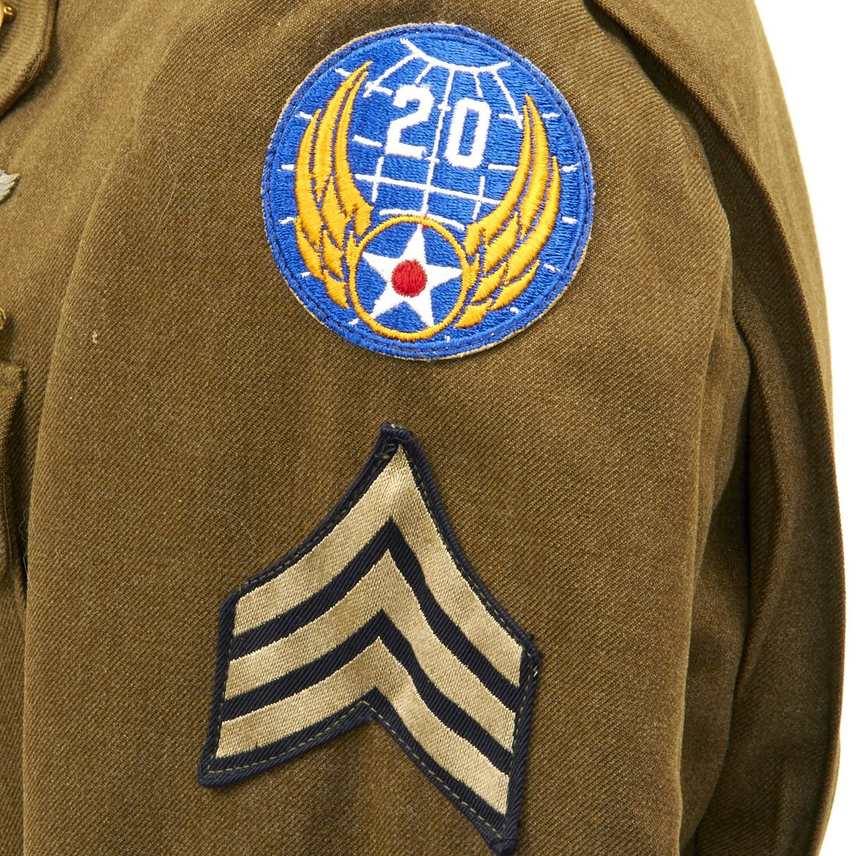 - Original Class A Uniform Jacket in excellent condition which is named in the interior (armpit) to McFarland. Features medal ribbons that include: air Medal, Good Conduct, Asiatic–Pacific Campaign Medal with 2 battle stars and a American Defense medal. The jacket also features Sterling Silver Wings, 20th AAF enameled Distinctive Insignias (pin back), a 20th Air Force patch on left shoulder, Allied Air Force patch on the right shoulder and a ruptured duck patch. Both sleeves bear Sergeant Chevrons and the the cuff has 4 service bars for 24+ months of overseas service.