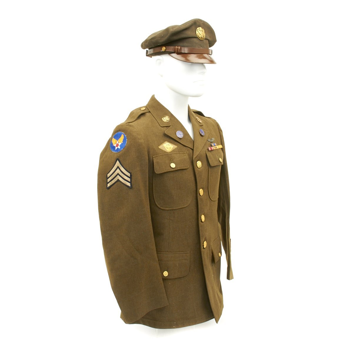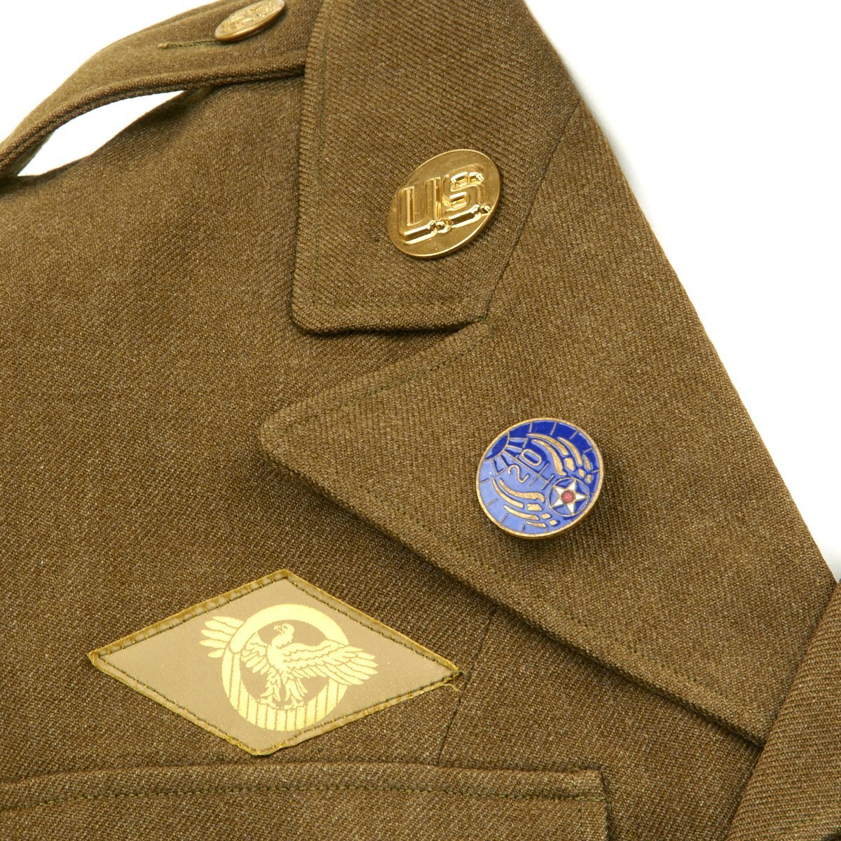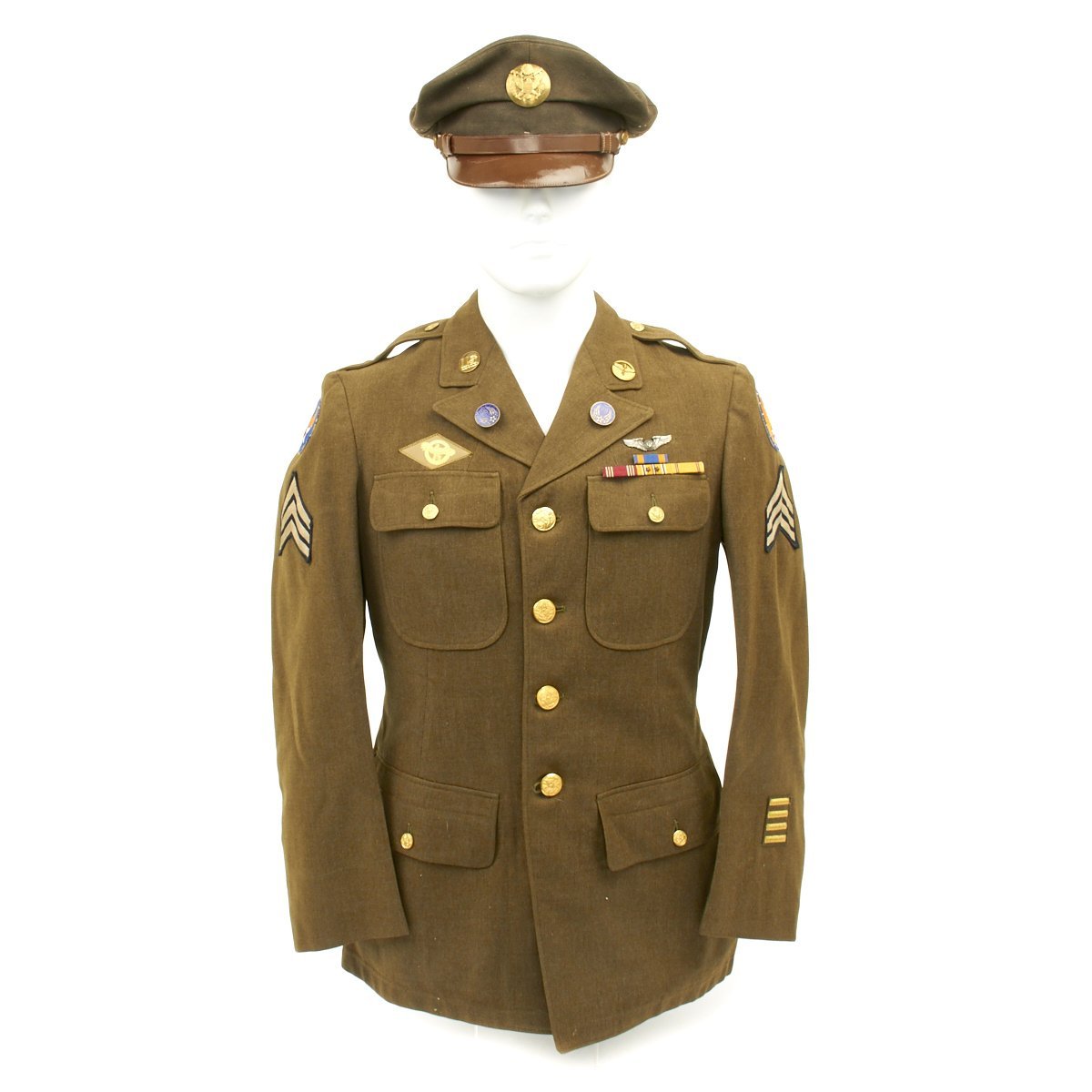 - Original Class A Uniform Jacket in excellent condition which is named in the interior (armpit) to McFarland. Features medal ribbons that include: air Medal, Good Conduct, Asiatic–Pacific Campaign Medal with 2 battle stars and a American Defense medal. The jacket also features Sterling Silver Wings, 20th AAF enameled Distinctive Insignias (pin back), a 20th Air Force patch on left shoulder, Allied Air Force patch on the right shoulder and a ruptured duck patch. Both sleeves bear Sergeant Chevrons and the the cuff has 4 service bars for 24+ months of overseas service.