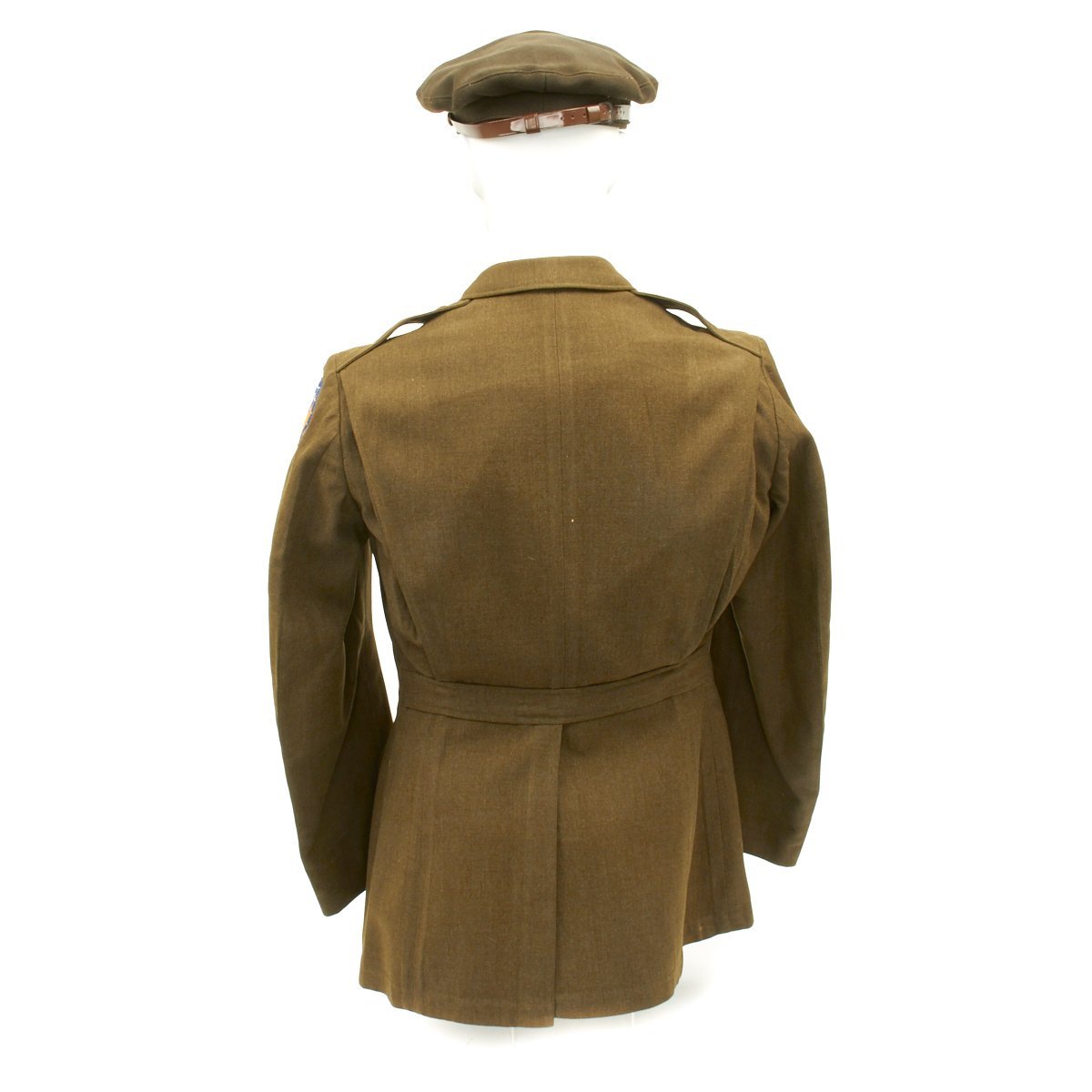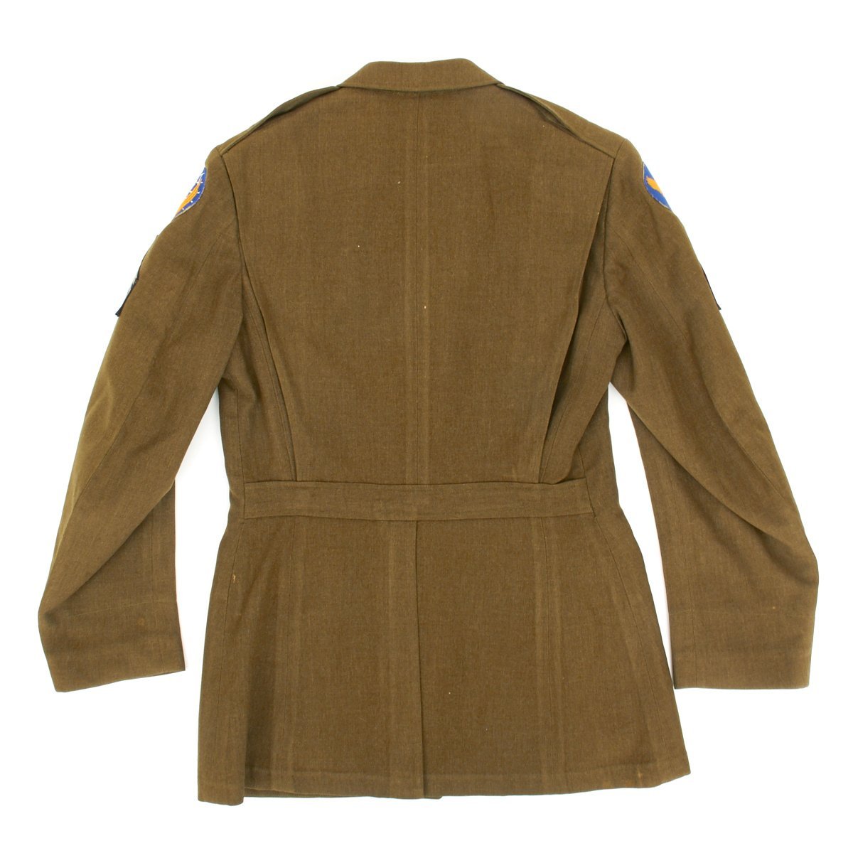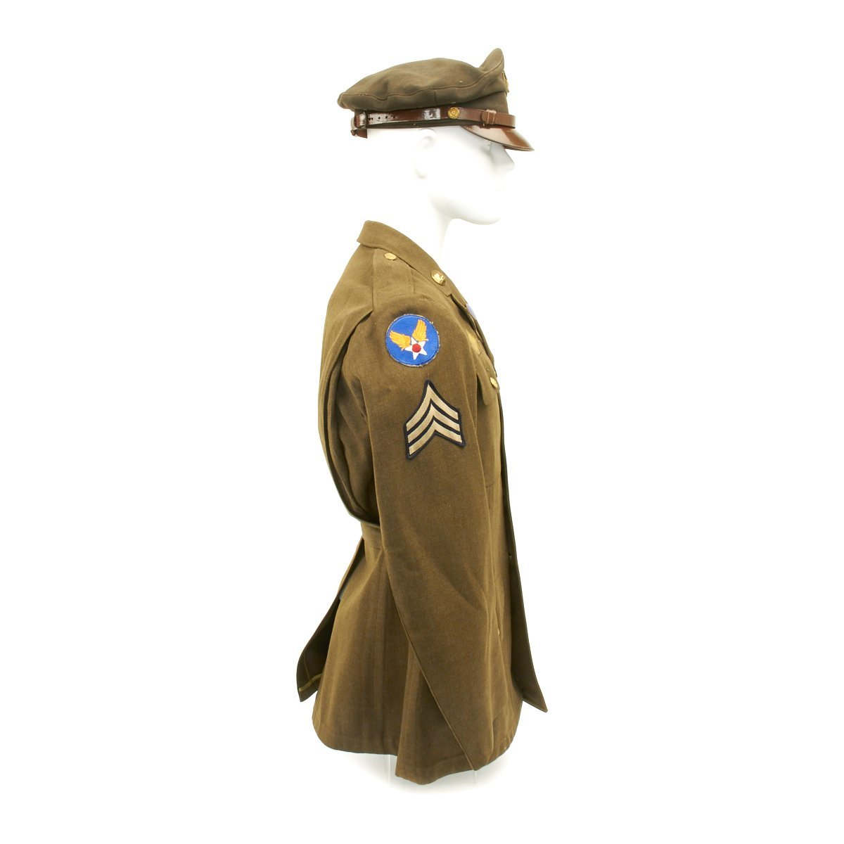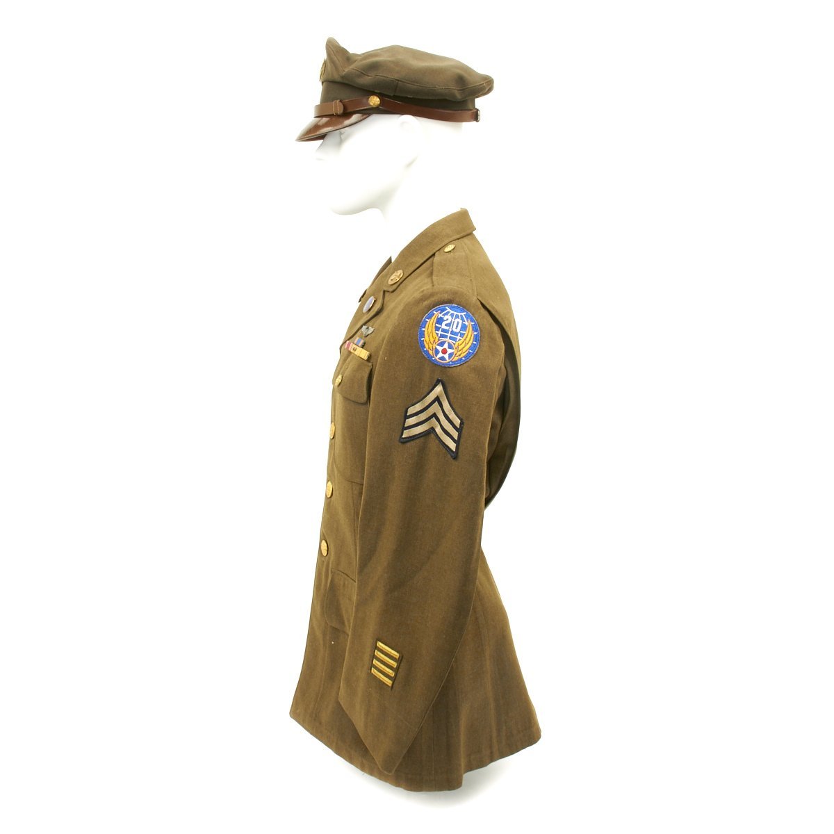 - Original Class A Uniform Jacket in excellent condition which is named in the interior (armpit) to McFarland. Features medal ribbons that include: air Medal, Good Conduct, Asiatic–Pacific Campaign Medal with 2 battle stars and a American Defense medal. The jacket also features Sterling Silver Wings, 20th AAF enameled Distinctive Insignias (pin back), a 20th Air Force patch on left shoulder, Allied Air Force patch on the right shoulder and a ruptured duck patch. Both sleeves bear Sergeant Chevrons and the the cuff has 4 service bars for 24+ months of overseas service.