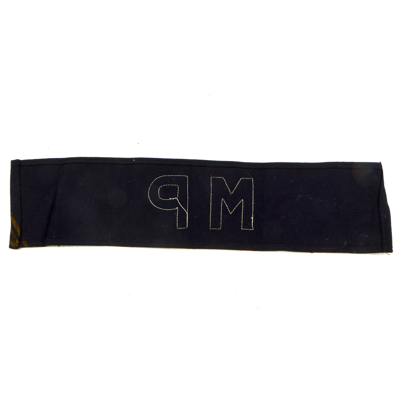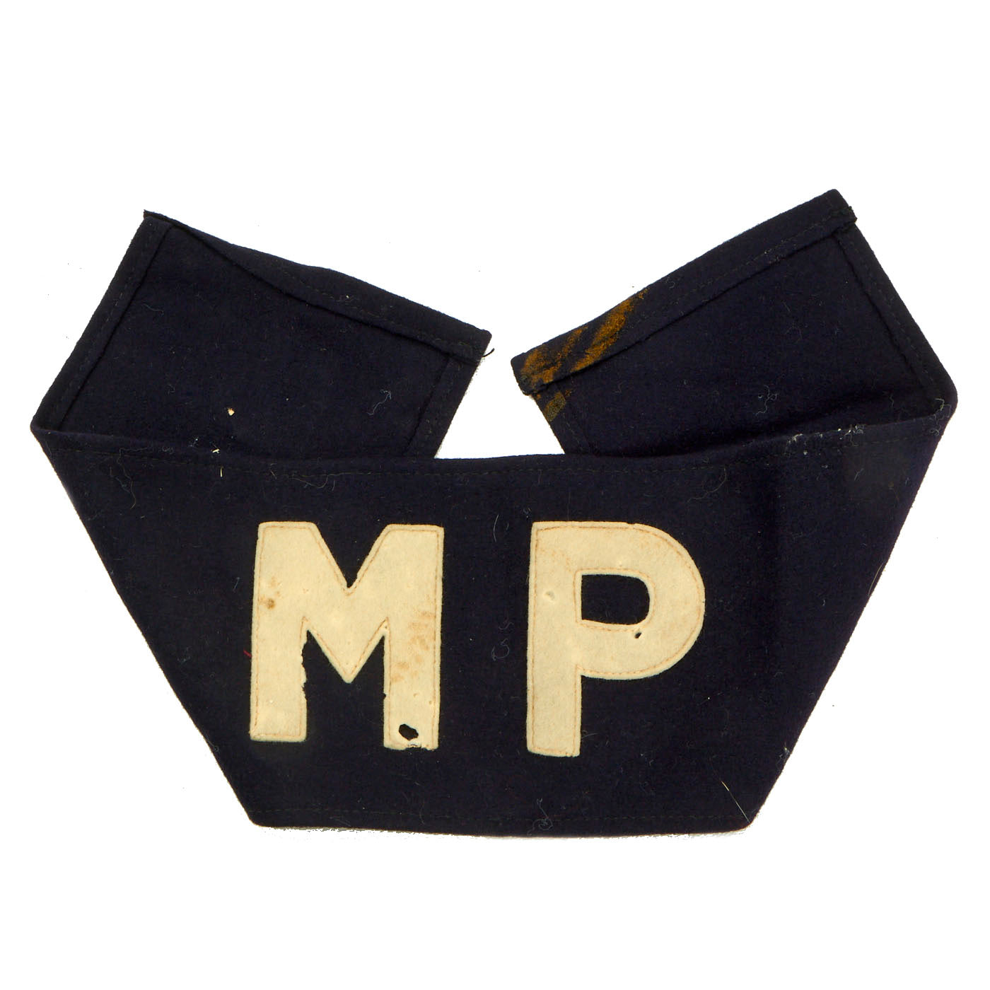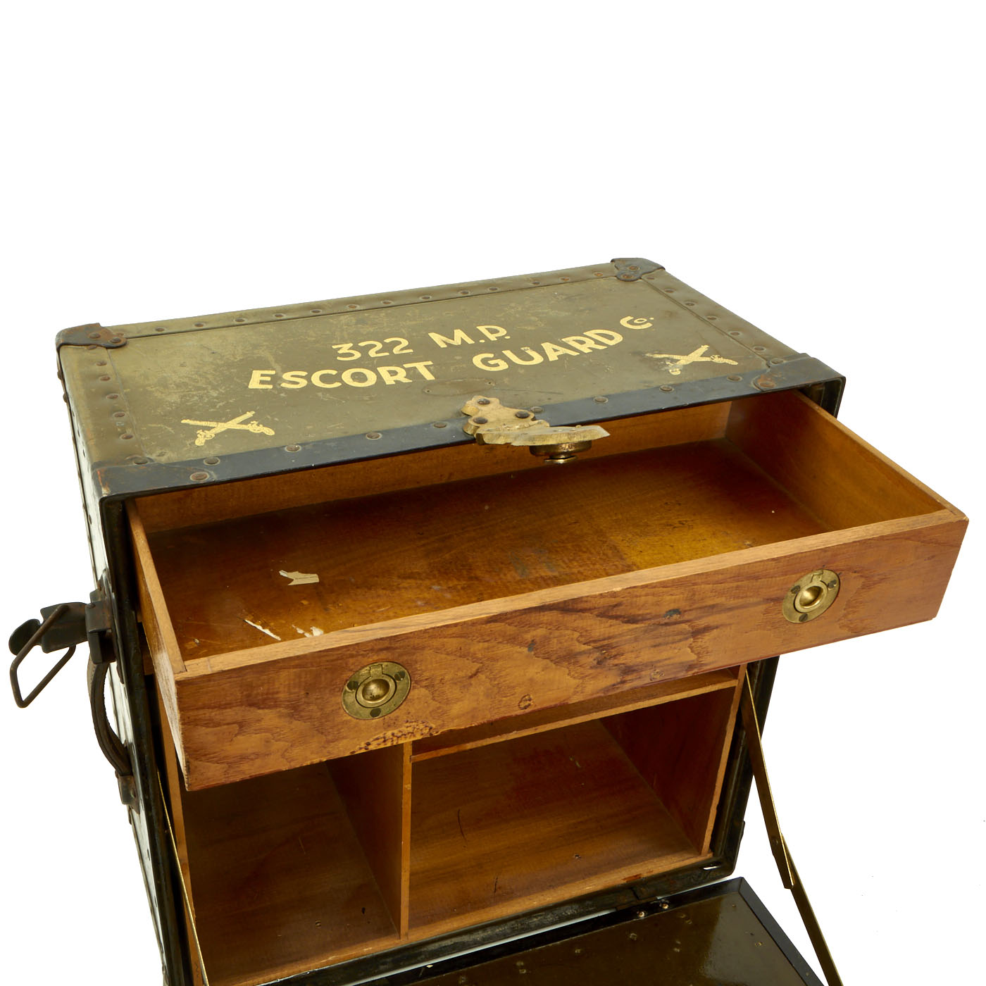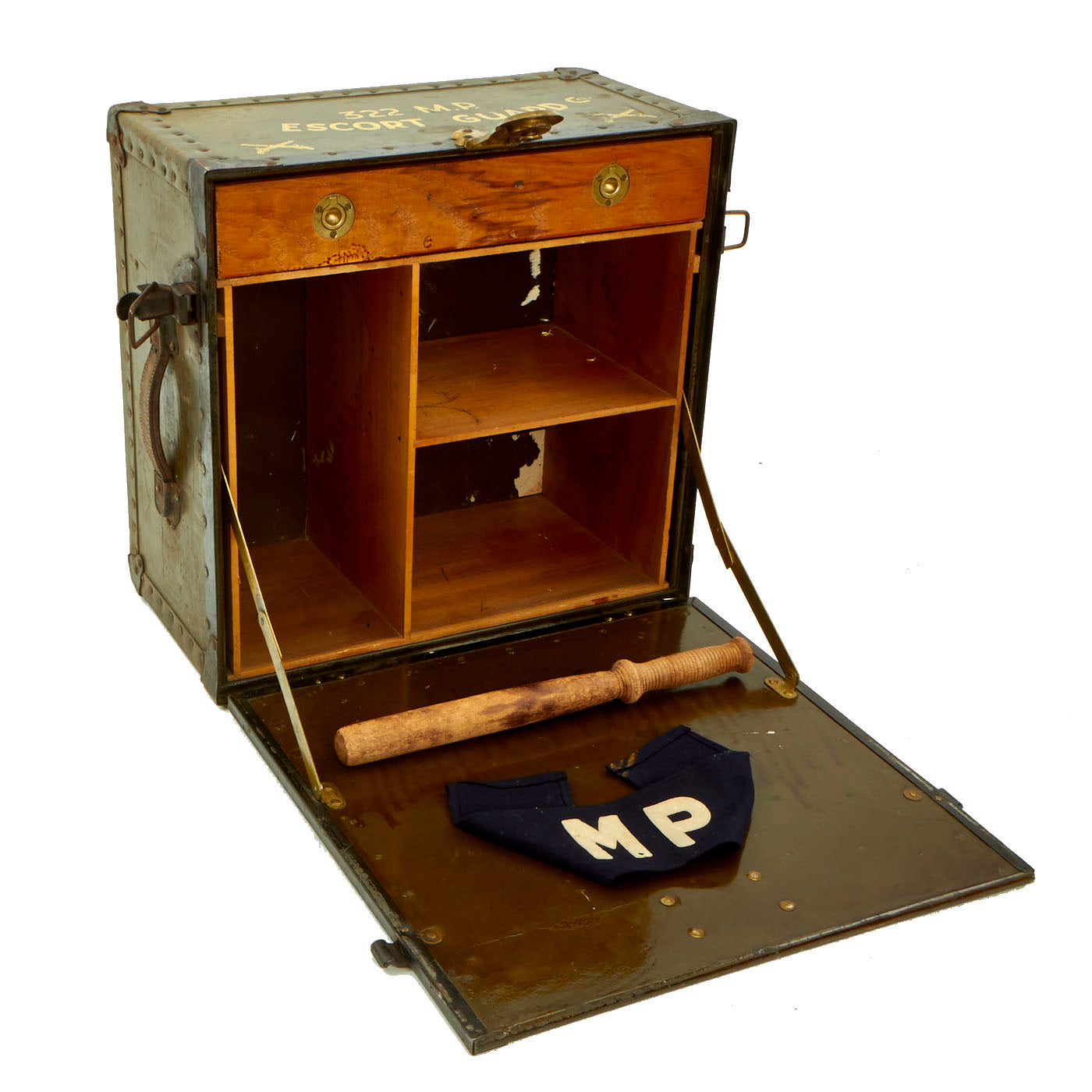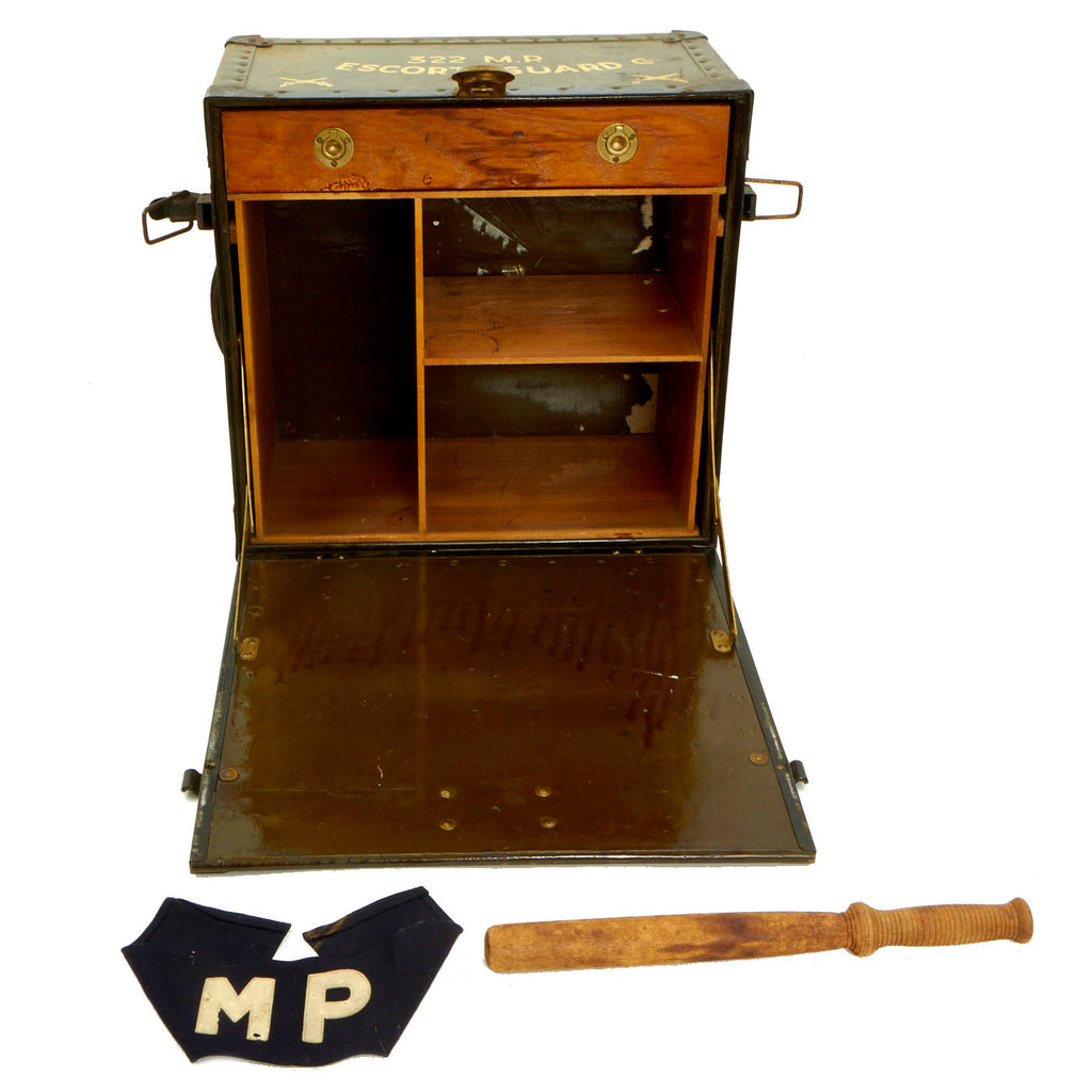 The desk, which measures 20 x 20 x 11 when closed, belonged to an officer of the 322nd M.P. Escort Guard Co which is how the stenciling is on the top of the desk. Below the stenciling is two crossed flintlock pistols. The desk is in lovely,fully functioning condition with almost all paint still intact. There is minor wear present but that is expected with these field desks. There is no significant damage present. The blue wool armband features a white MP designator stitched in white on the face. The band appears to have never been stitched together but there is minimal mothing present on the lettering. The wood nightstick bludgeon is in solid condition with minimal cracking and no significant damage.