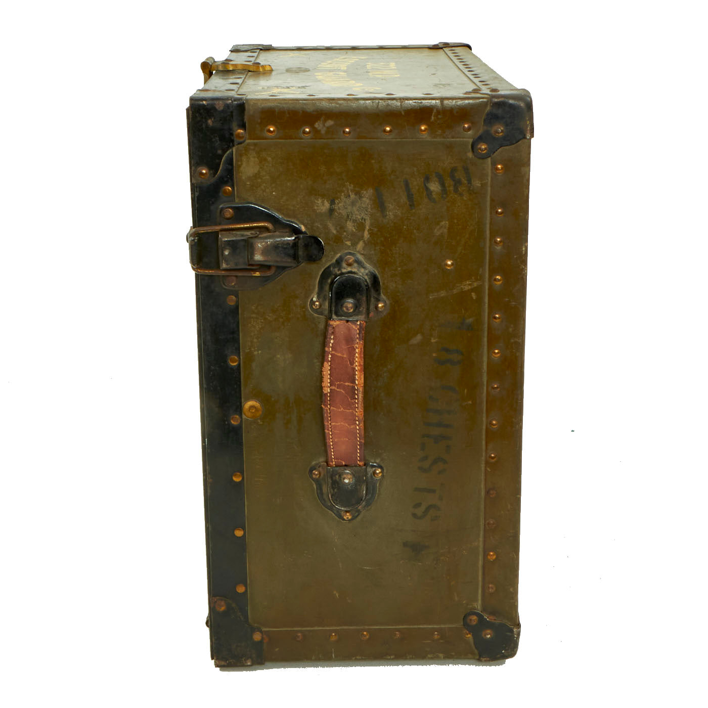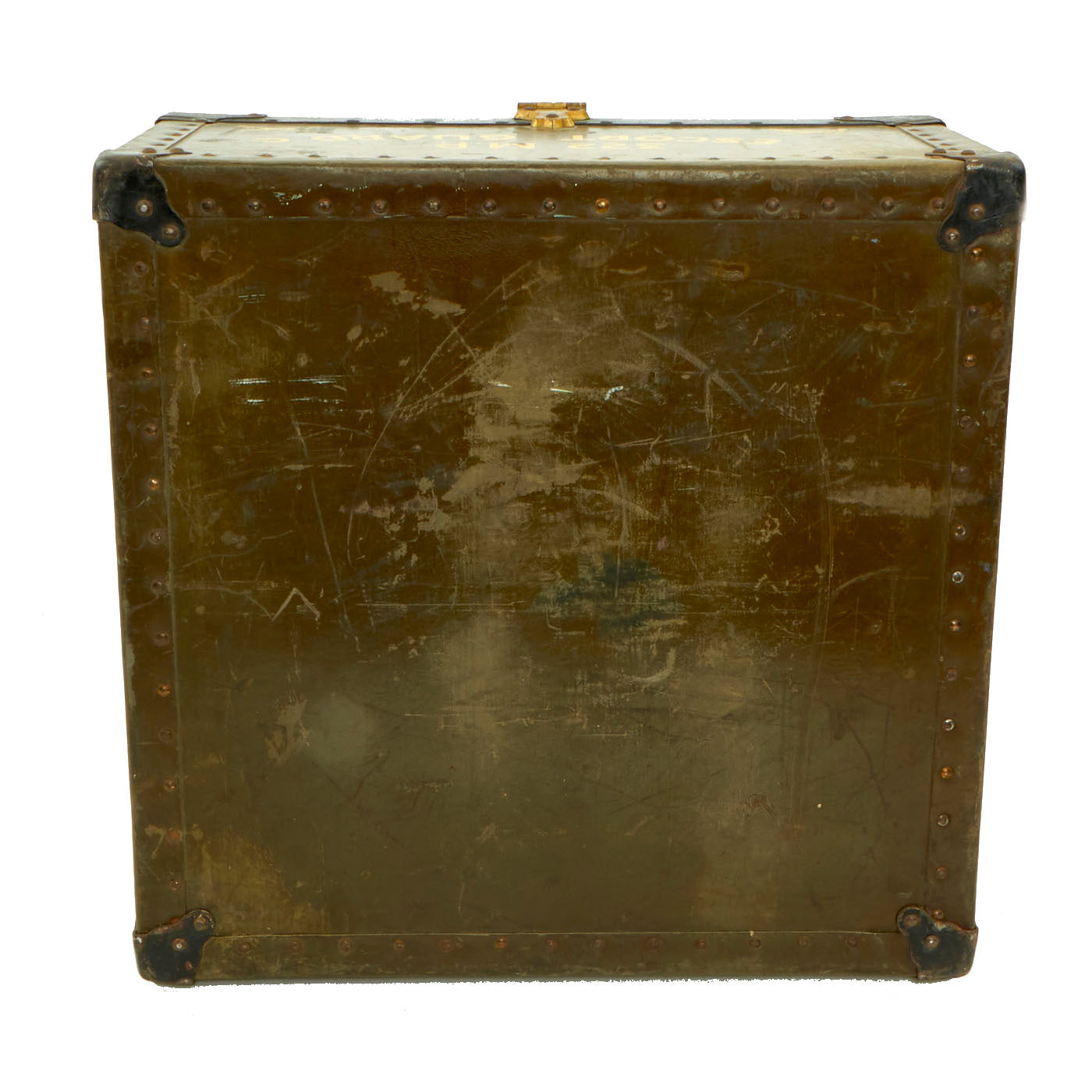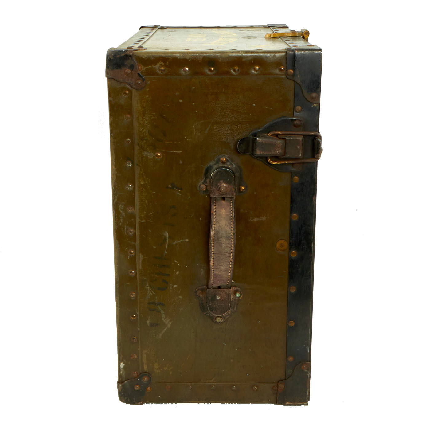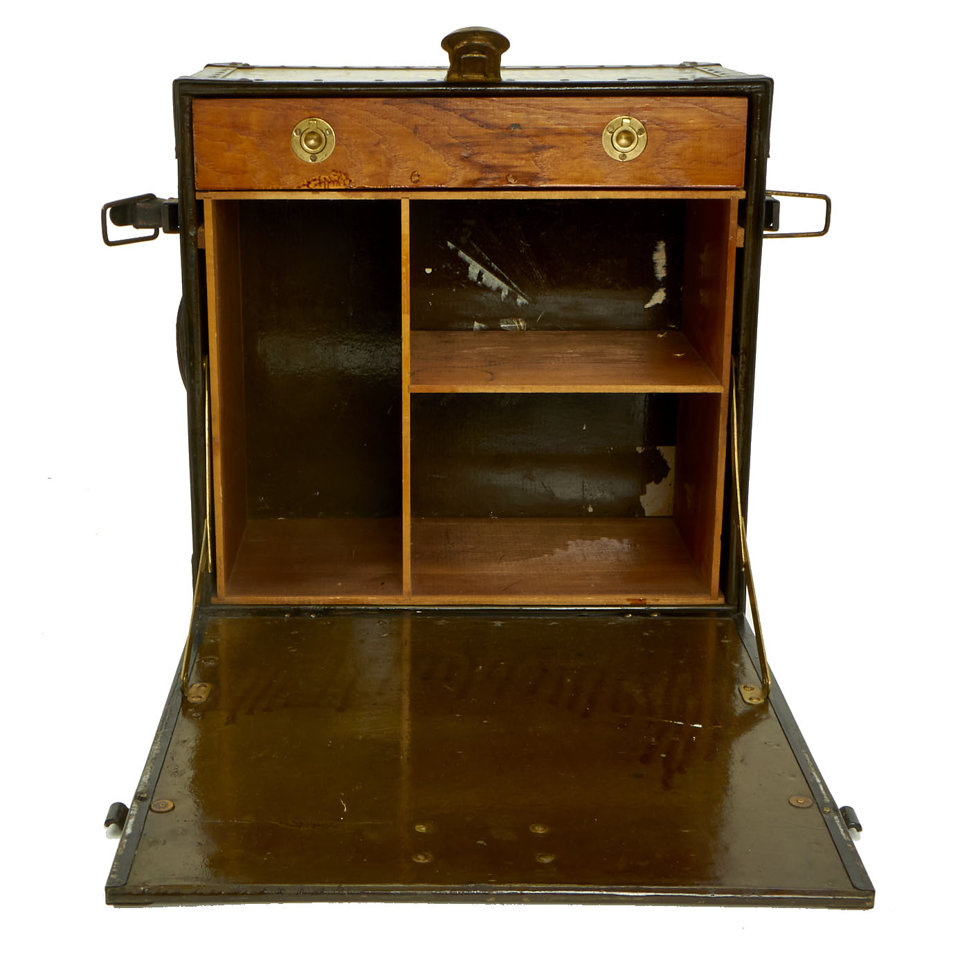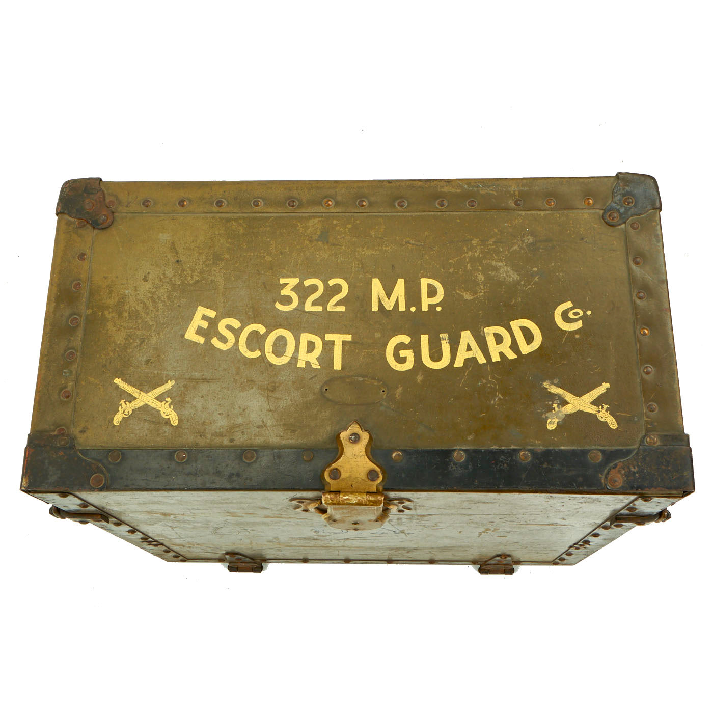 The desk, which measures 20 x 20 x 11 when closed, belonged to an officer of the 322nd M.P. Escort Guard Co which is how the stenciling is on the top of the desk. Below the stenciling is two crossed flintlock pistols. The desk is in lovely,fully functioning condition with almost all paint still intact. There is minor wear present but that is expected with these field desks. There is no significant damage present. The blue wool armband features a white MP designator stitched in white on the face. The band appears to have never been stitched together but there is minimal mothing present on the lettering. The wood nightstick bludgeon is in solid condition with minimal cracking and no significant damage.