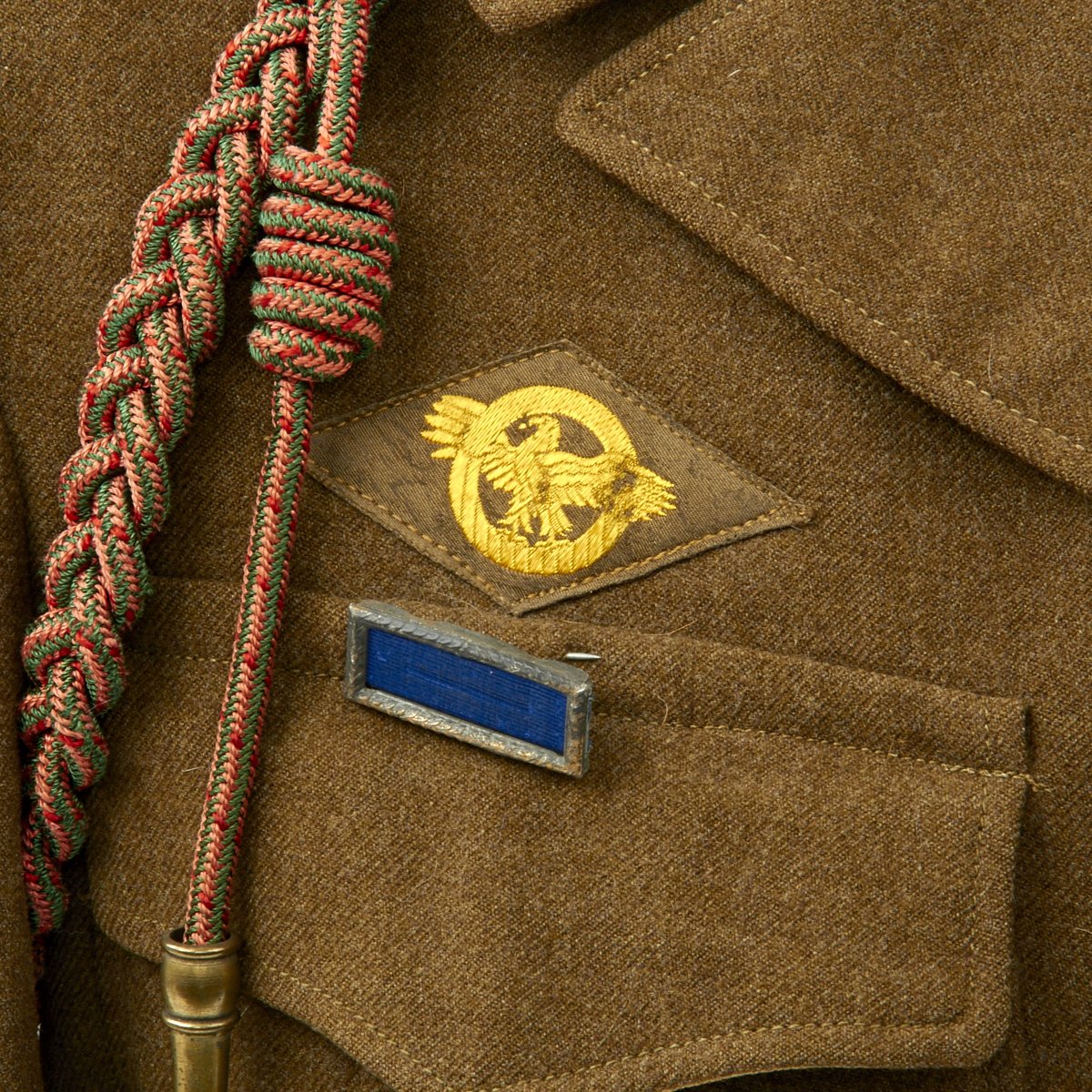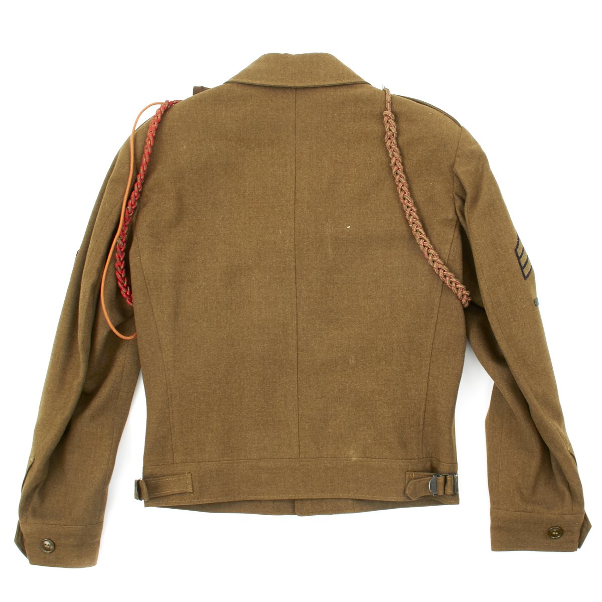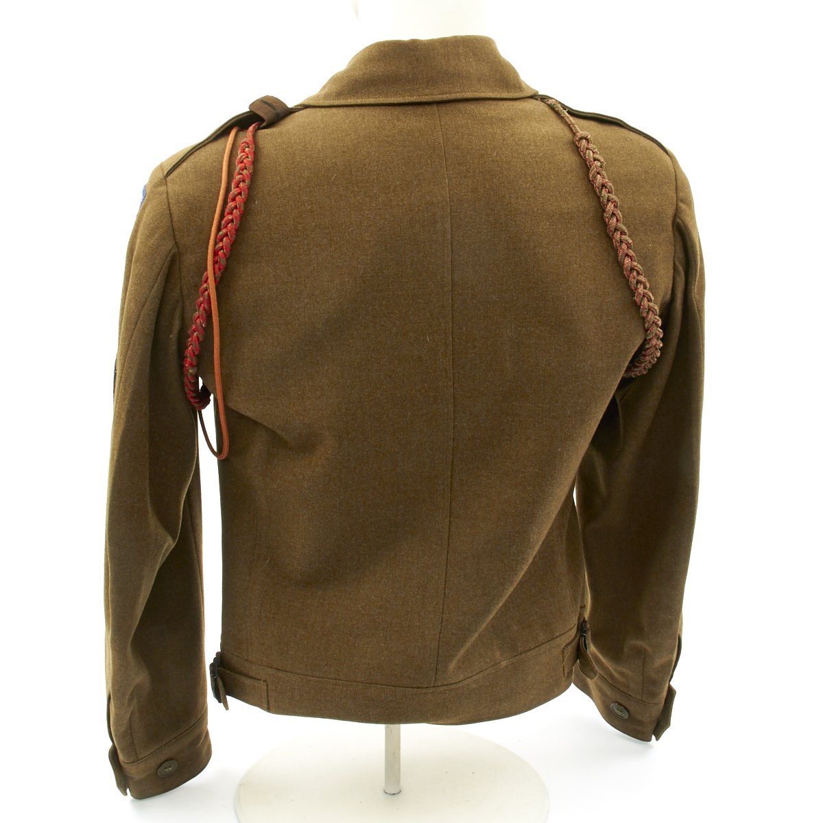 - Two "Belgian Fourragère 1940" (he should only be wearing one but two came with the jacket). The decoration is composed of one round smooth cord, partially braided, and of two other cords, of which one is terminated by a knot and a brass ferret - it is made of wool and cotton for NCOs and EM, and of silk for Officers - all threads are tinted in colors resembling the ribbon of the Belgian Croix de Guerre 1940 (i.e. basic red, dotted with green threads) - the Fourragère encircles the shoulder and passes under the armpit, and is fixed by 2 tiny loops onto the button of the shoulder loop.