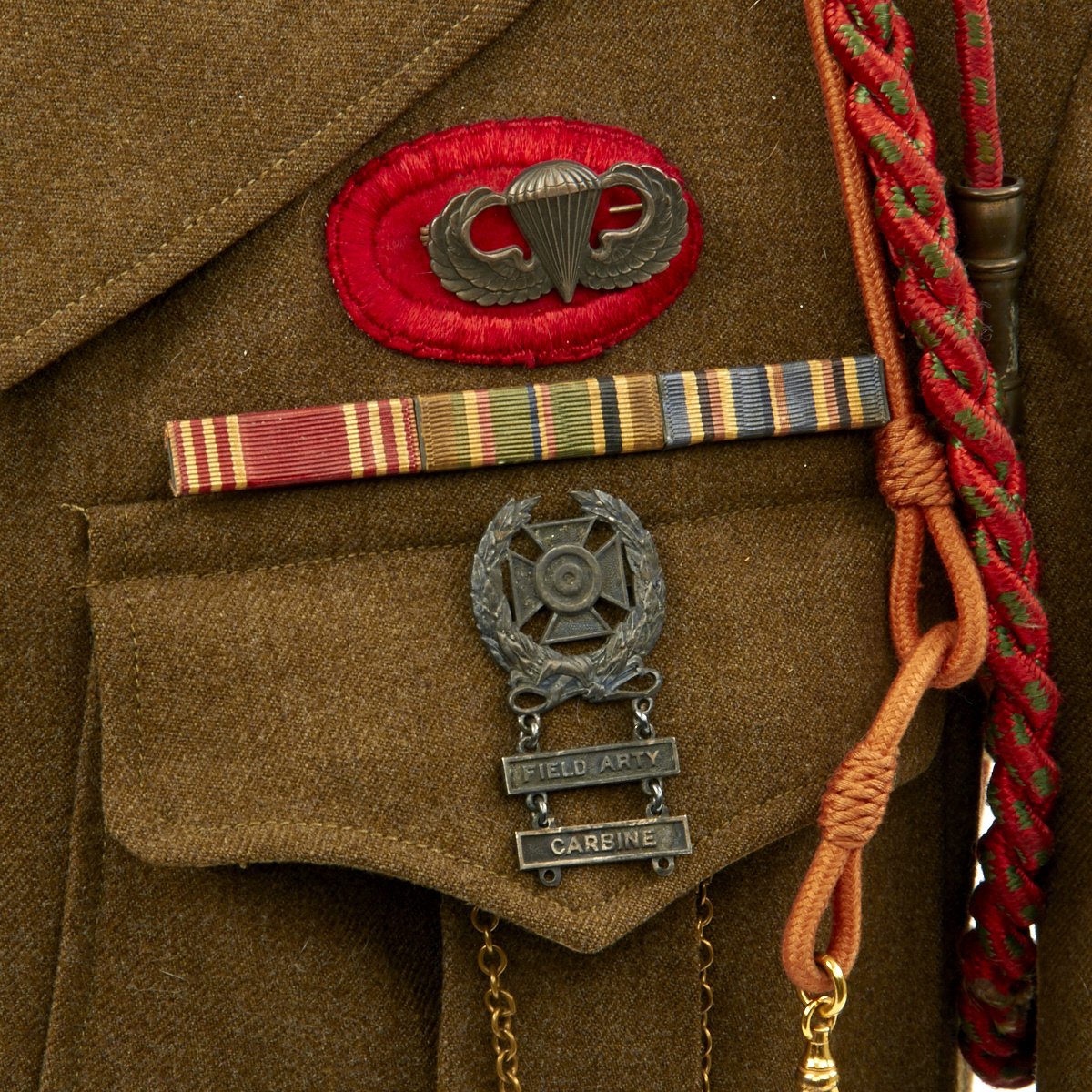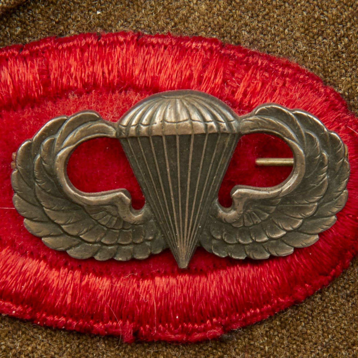 - Sterling silver paratrooper badge backed in red with embroidered surround. Apparently he was transferred out of the 327th and sent to Airborne artillery at some point during the war.
