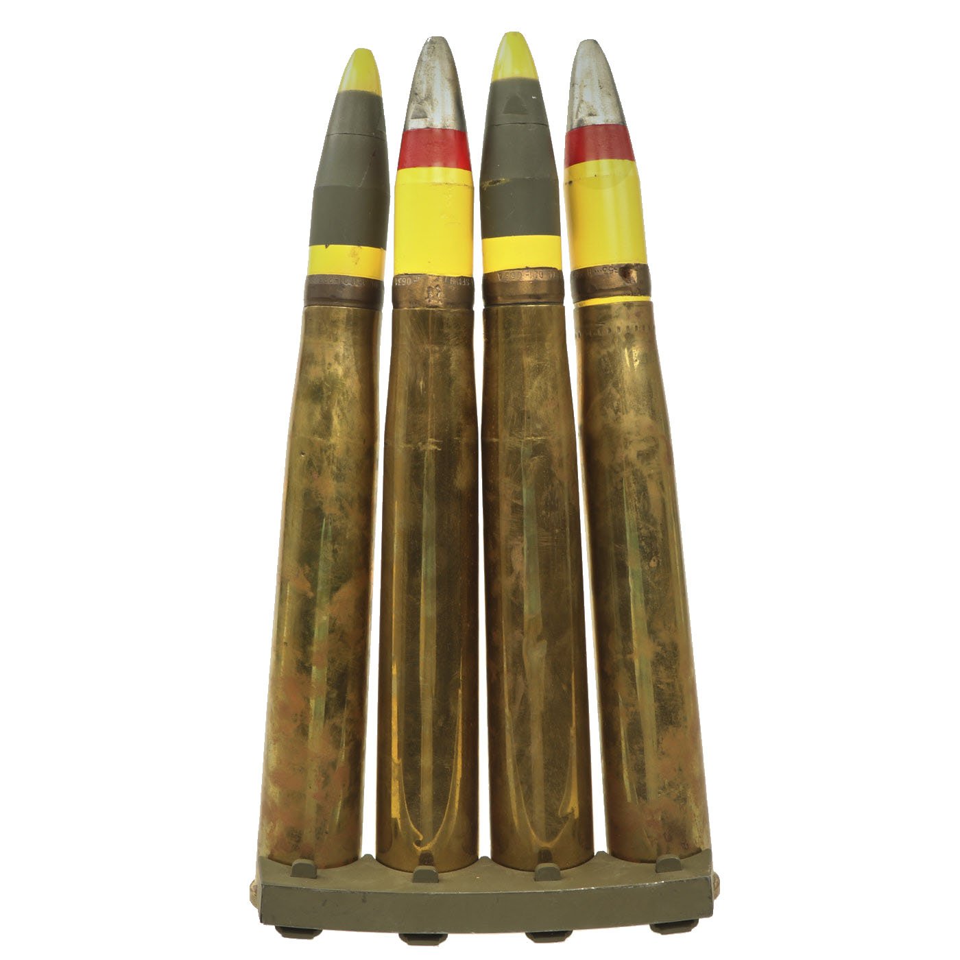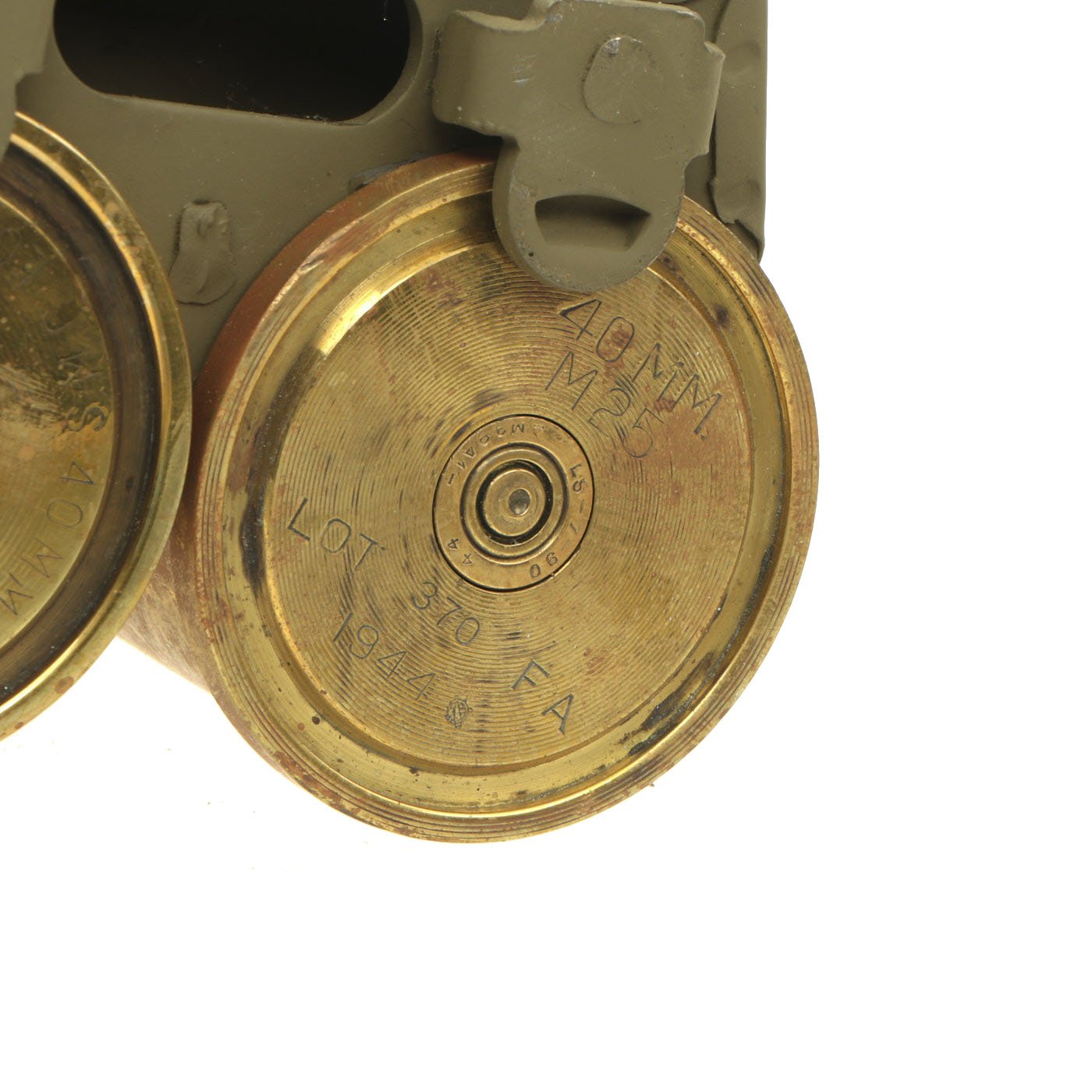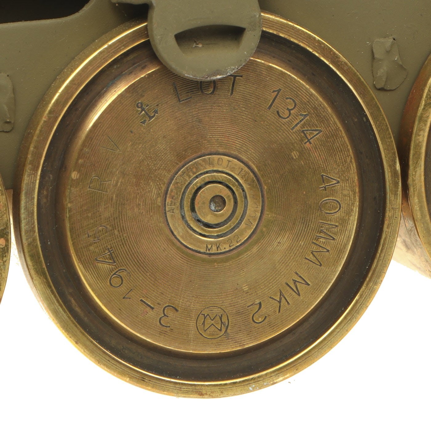 These are genuine World War Two dated 40mm Bofors gun rounds in a clip. Each round bears a 1944 or 1945 date and are offered in very good condition.
