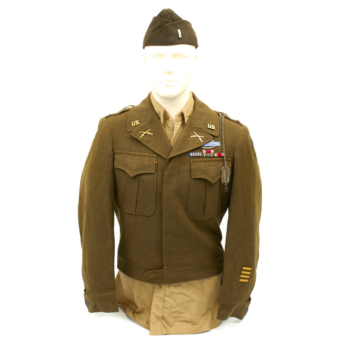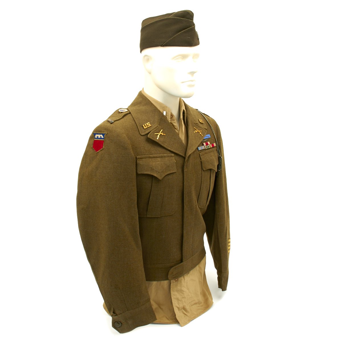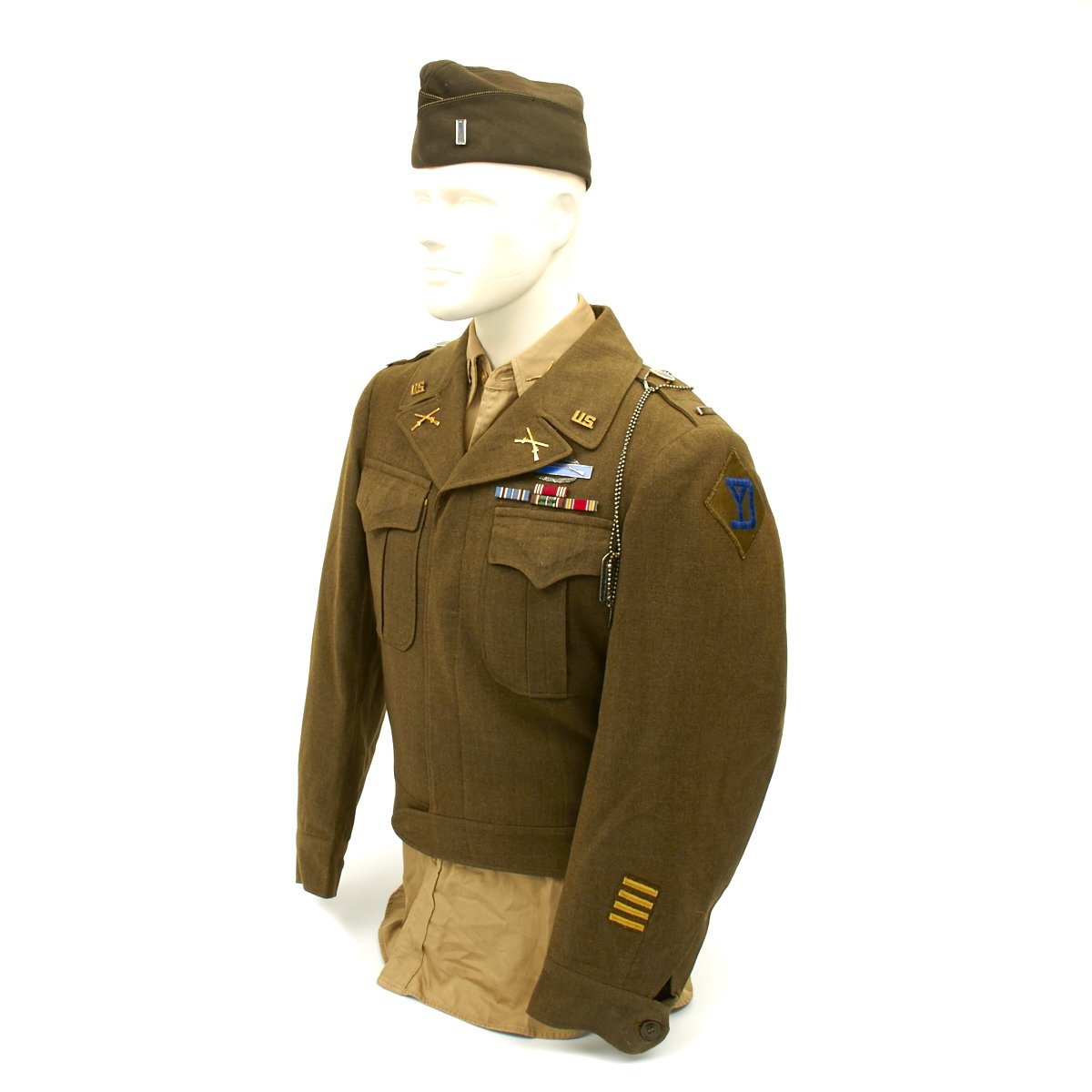 - Ike Jacket with 76th Infantry Division patch on right shoulder, 26th Infantry Division patch on left shoulder, sterling silver Combat Infantryman's Badge, Medal ribbons (Good Conduct, American Campaign, European-African-Middle Eastern with four battle stars and WWII Victory Medal). Enamel Distinctive Unit Insignias for the 471th Infantry Regiment, Lieutenant bars, infantry lapel pins and 4 overseas service bars on left sleeve.