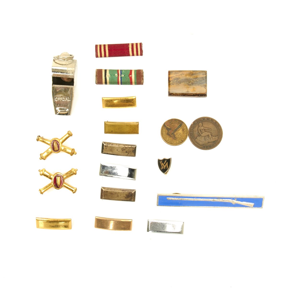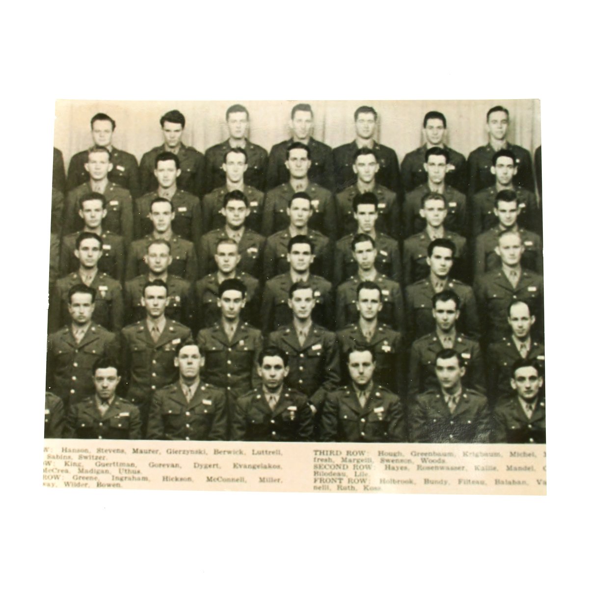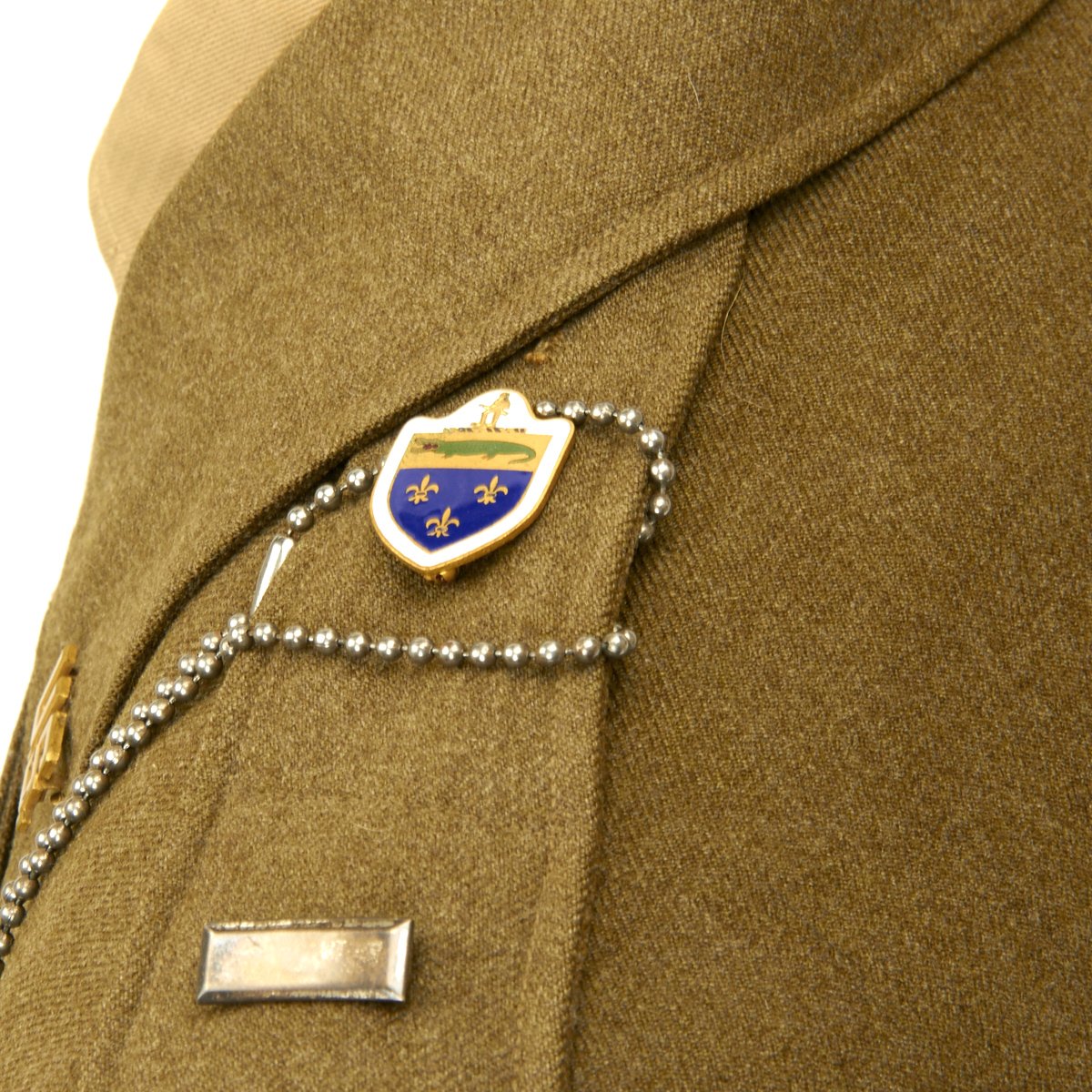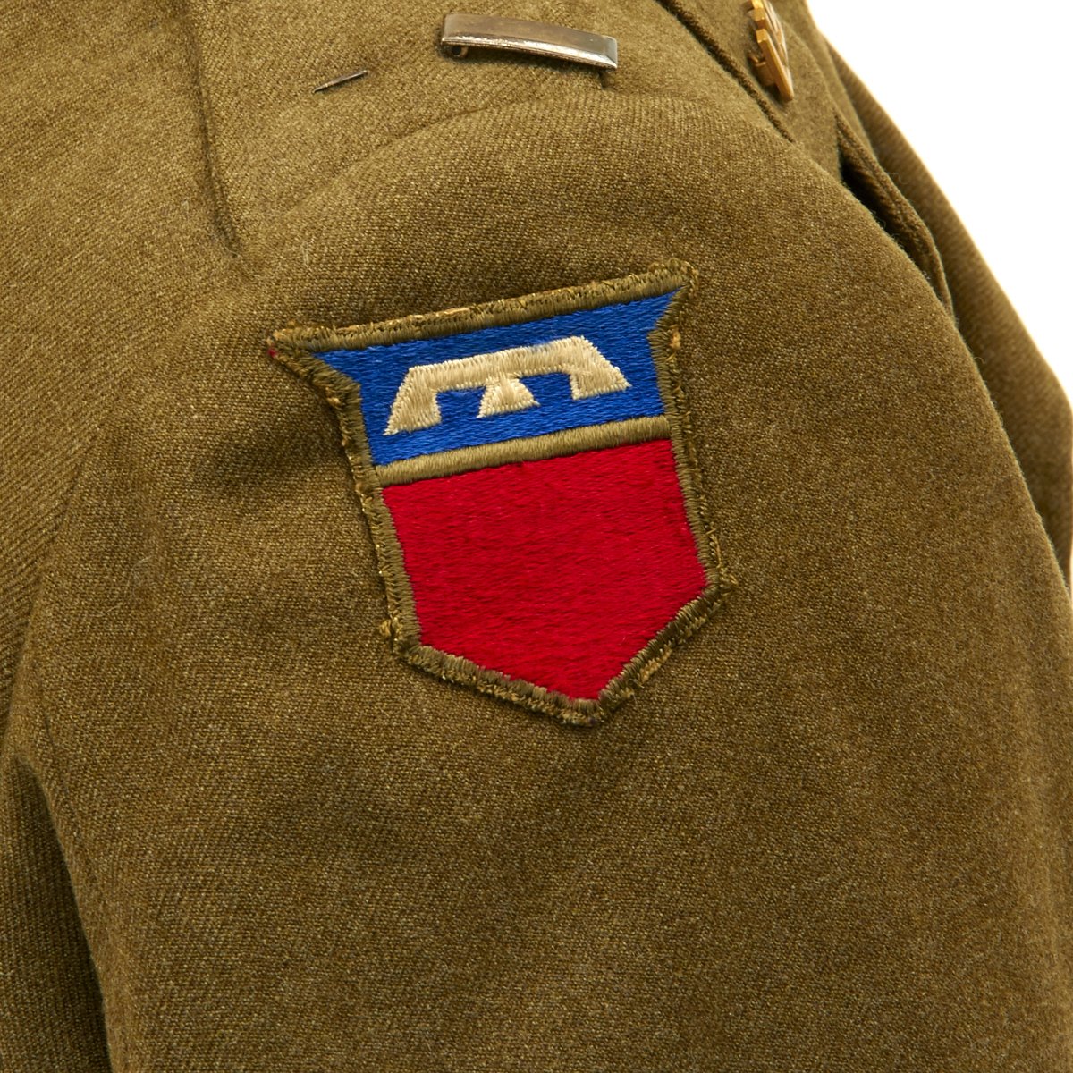 - Ike Jacket with 76th Infantry Division patch on right shoulder, 26th Infantry Division patch on left shoulder, sterling silver Combat Infantryman's Badge, Medal ribbons (Good Conduct, American Campaign, European-African-Middle Eastern with four battle stars and WWII Victory Medal). Enamel Distinctive Unit Insignias for the 471th Infantry Regiment, Lieutenant bars, infantry lapel pins and 4 overseas service bars on left sleeve.