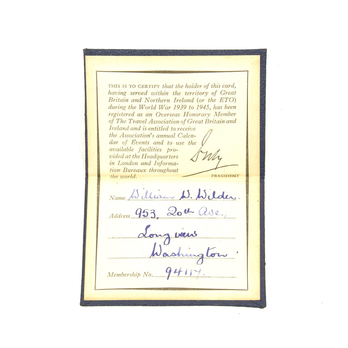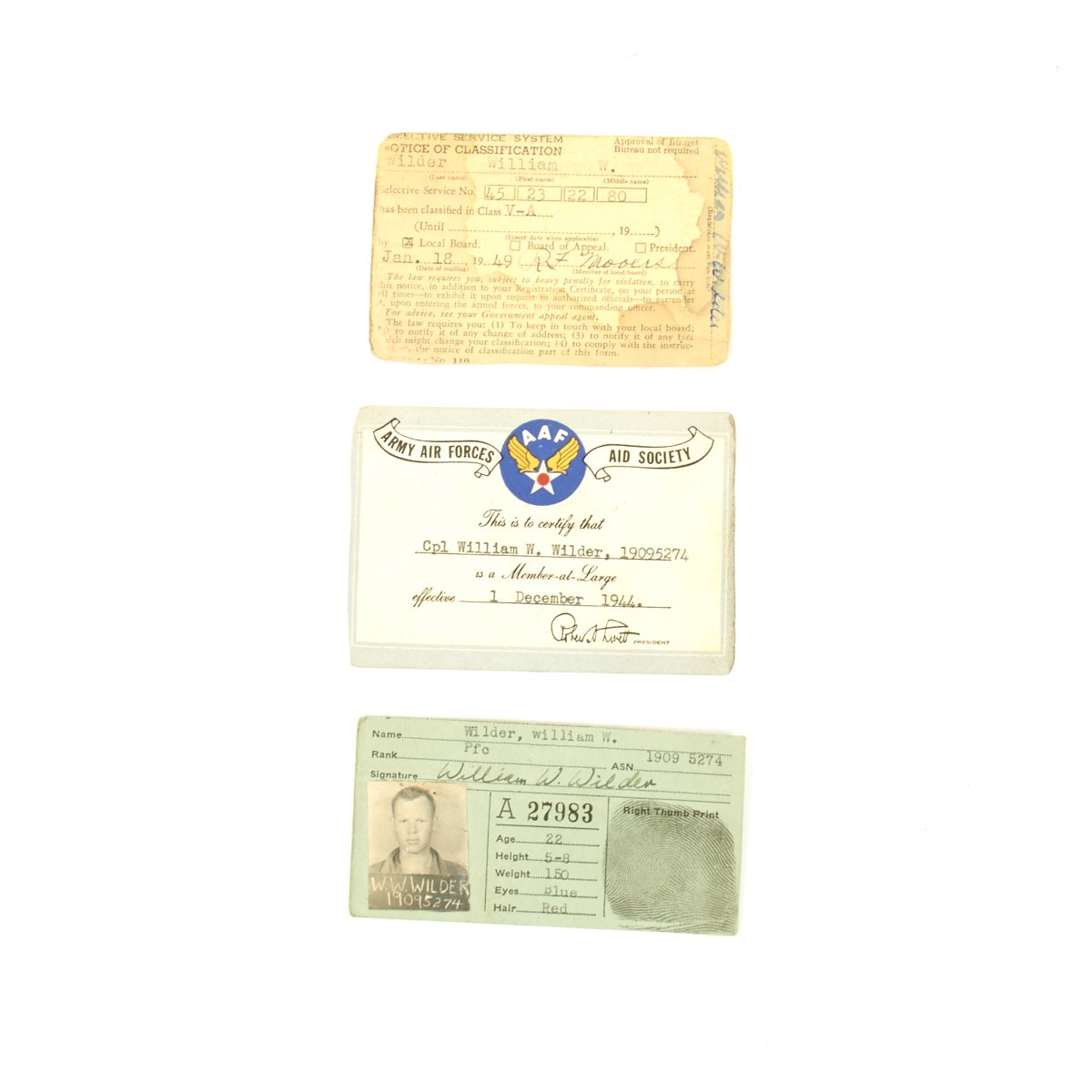 - Army Air Force Aid Society membership card dated December 1st, 1944.