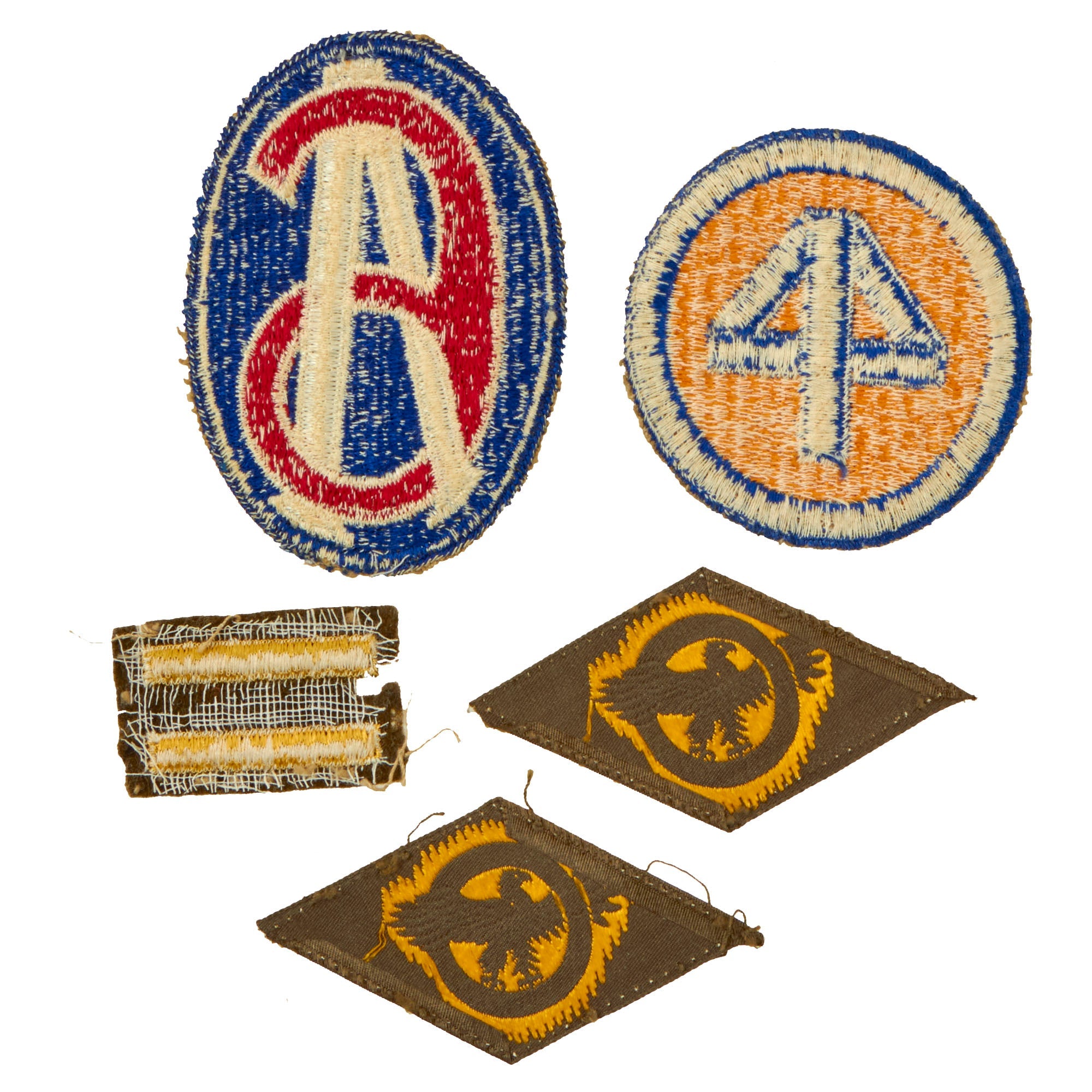 - Collar discs and two Ruptured duck patches, along with overseas stripes.