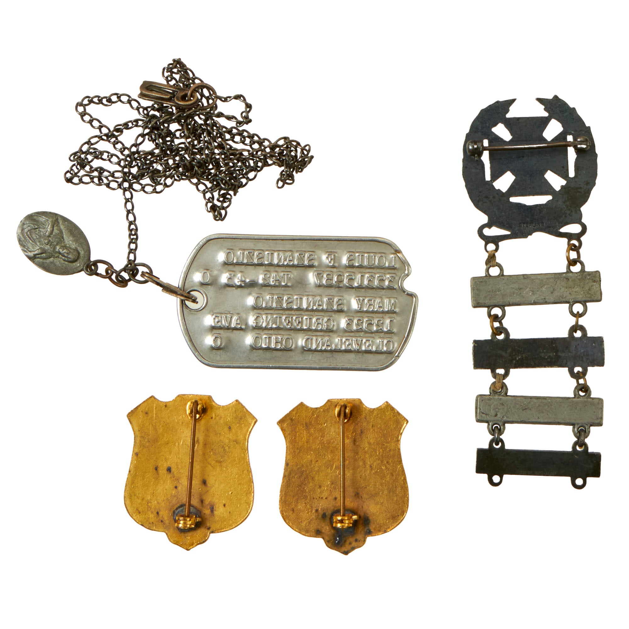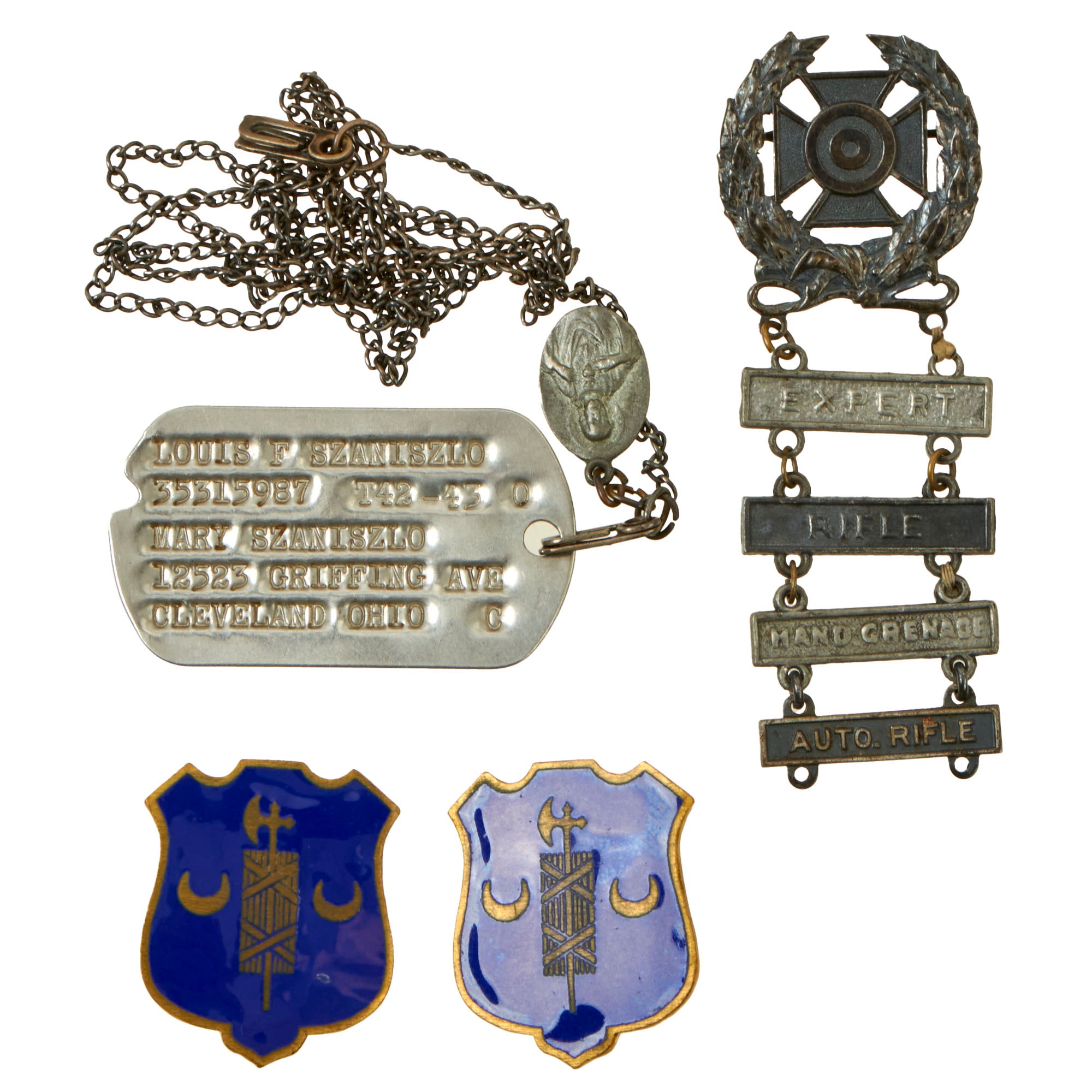 Original Items. One-of-a-Kind Group. This is the lovely grouping of Louis Frank Szaniszlo, 71st Infantry Regiment, 44th Infantry Division, who was wounded by shrapnel on November 18th, 1944. The grouping includes his dog tag, his medals, patches, and insignia.