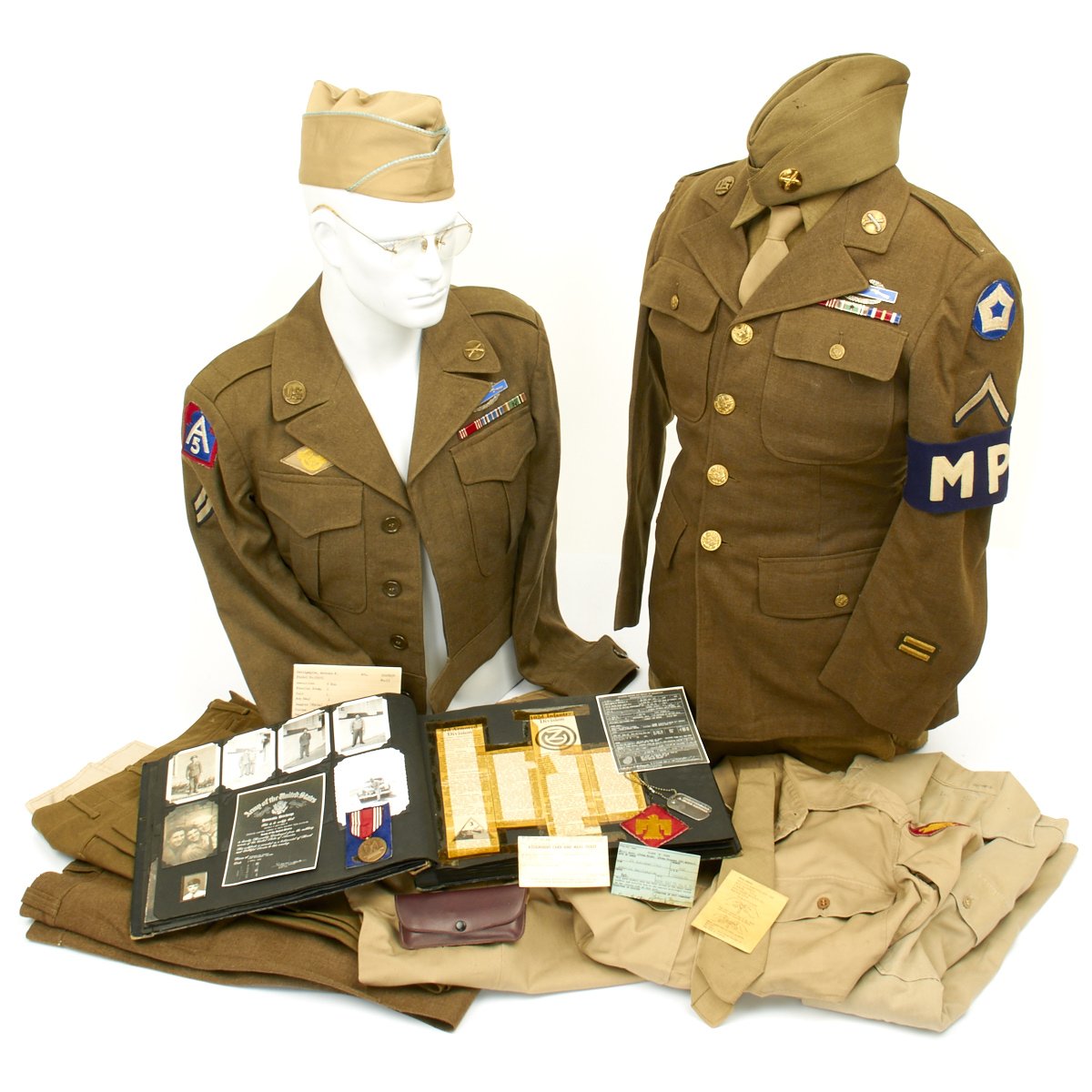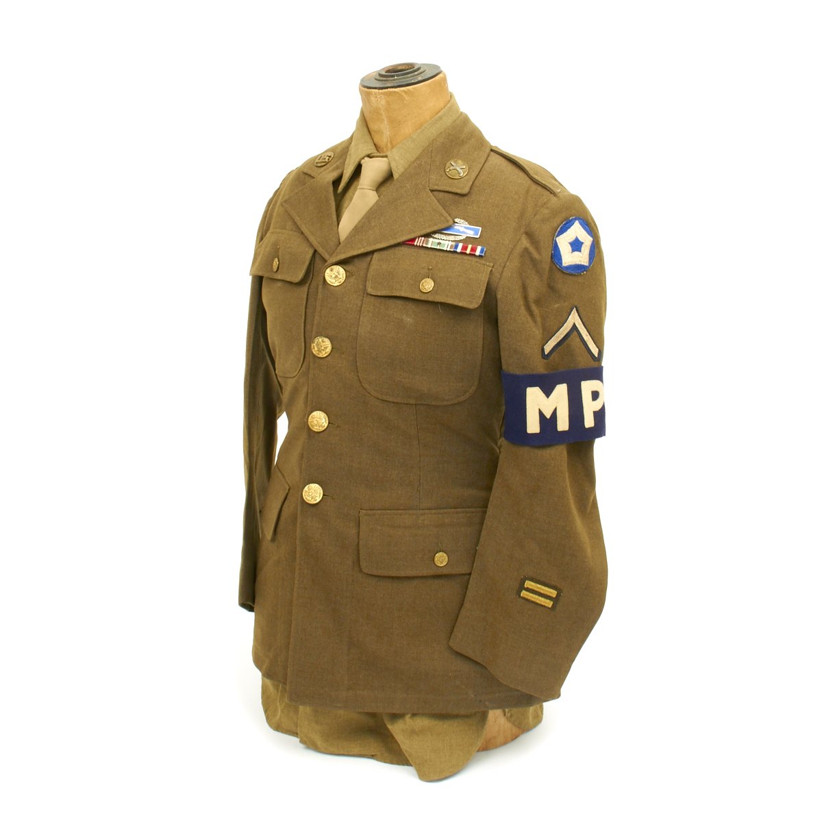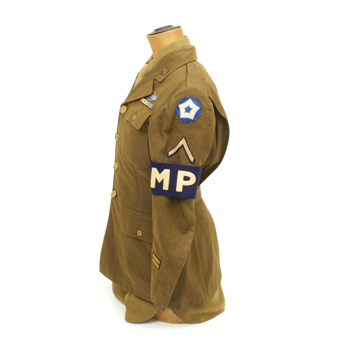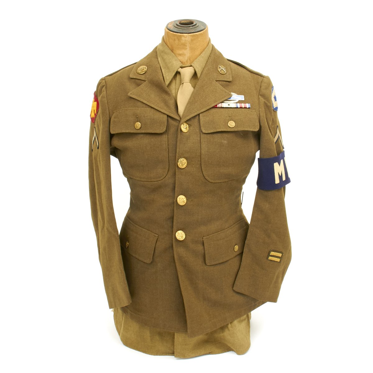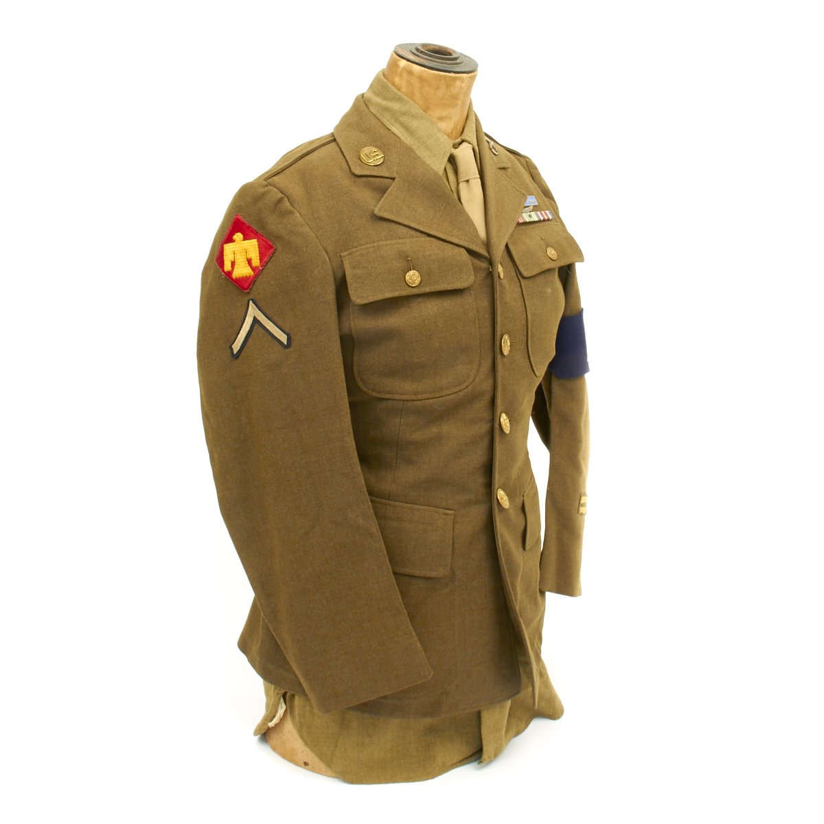 - OD wool 4-pocket coat with all original insignia including 1st Service Command, 45th Division, sterling CIB, 3 ribbon bars including ETO with 1 campaign star, US/MP collar discs, and PFC chevrons. This uniform appears in several photos in his scrapbook.
