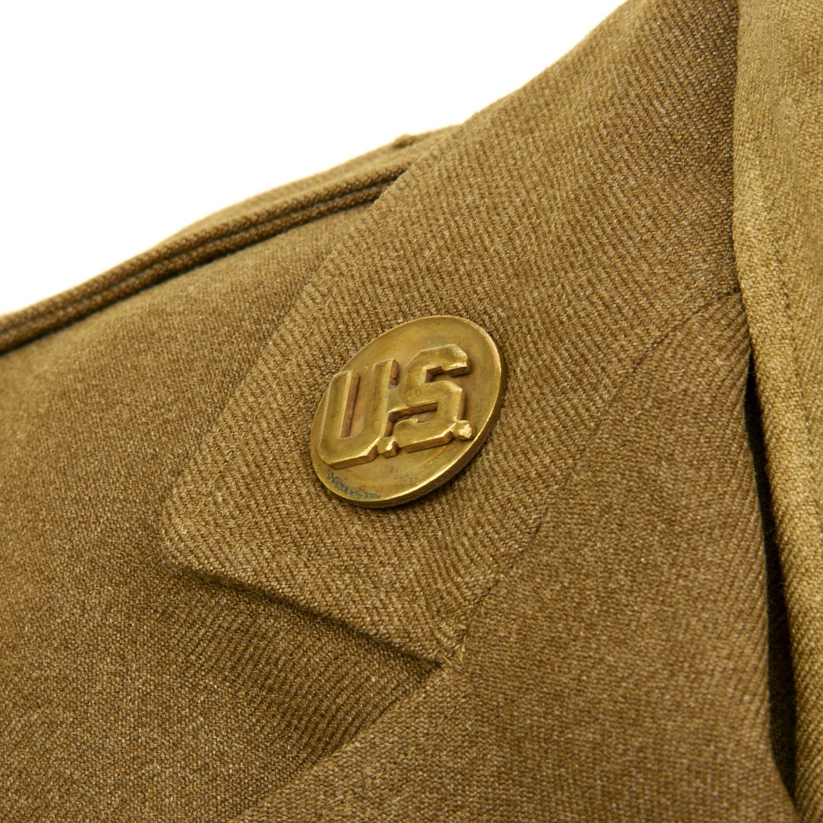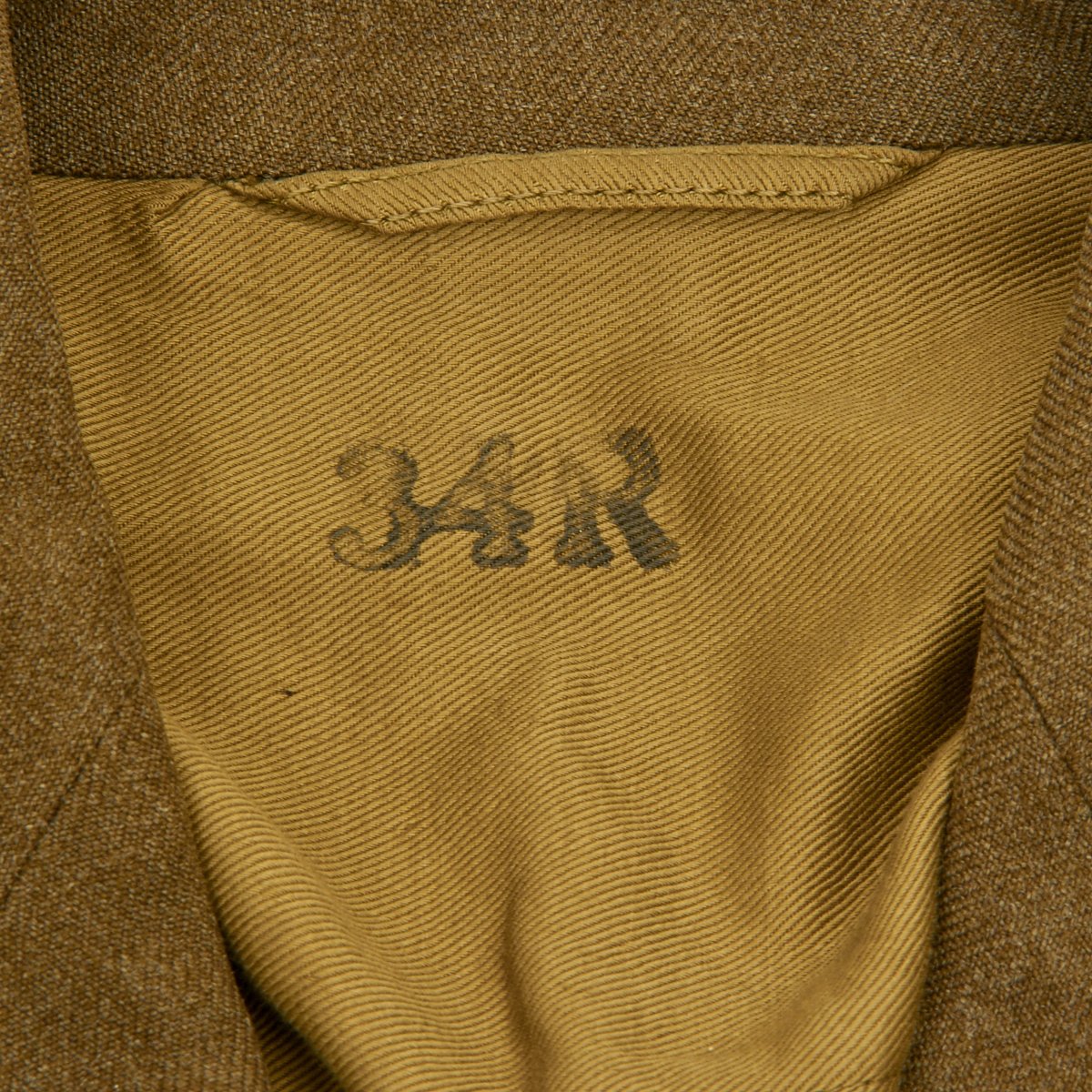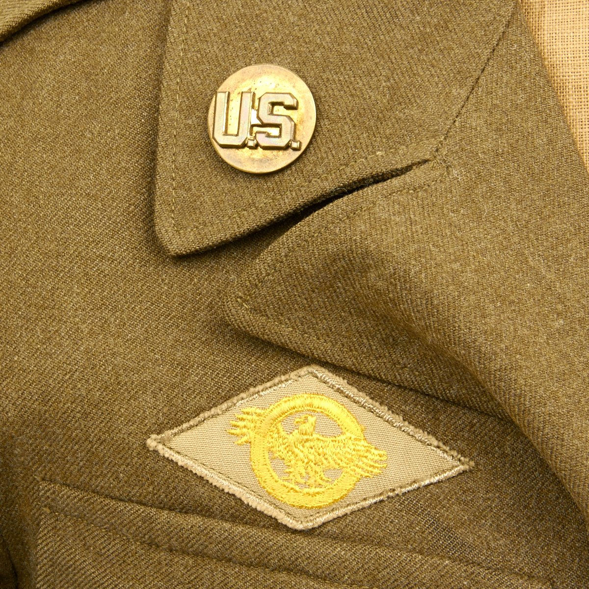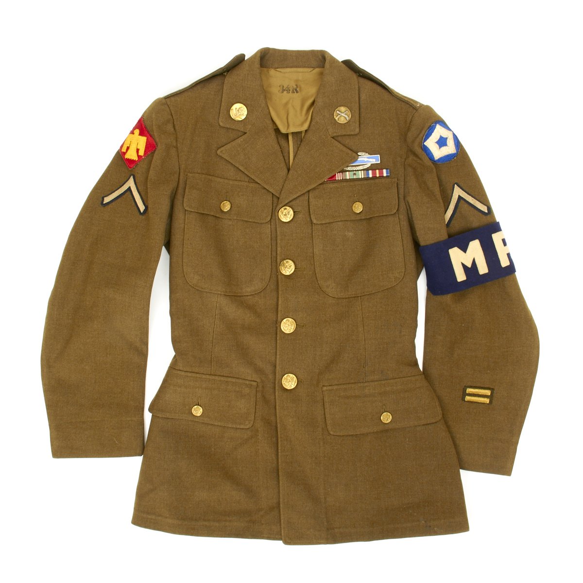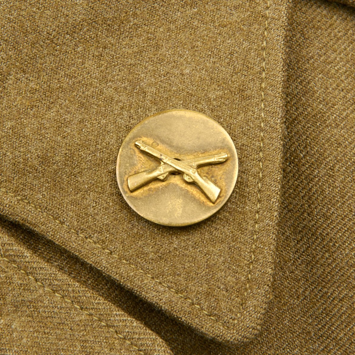 - OD wool 4-pocket coat with all original insignia including 1st Service Command, 45th Division, sterling CIB, 3 ribbon bars including ETO with 1 campaign star, US/MP collar discs, and PFC chevrons. This uniform appears in several photos in his scrapbook.