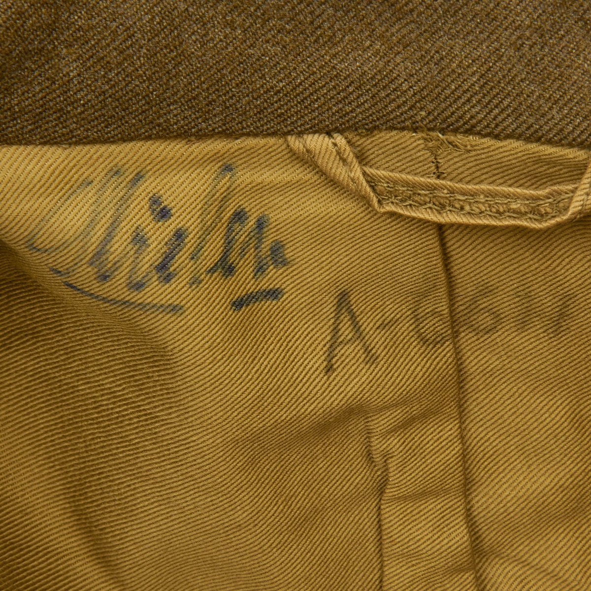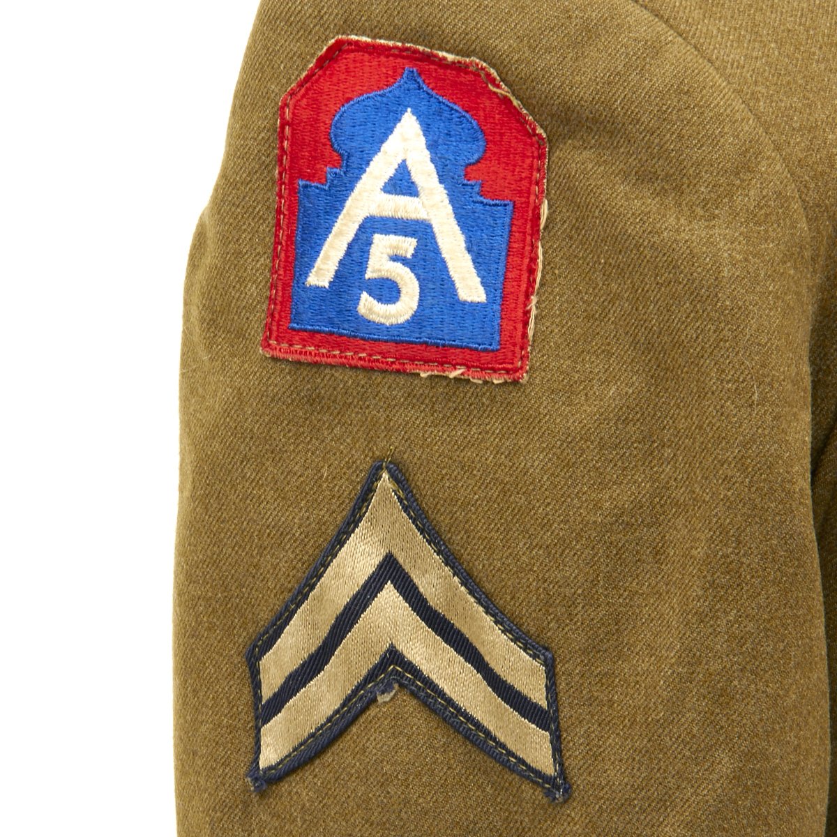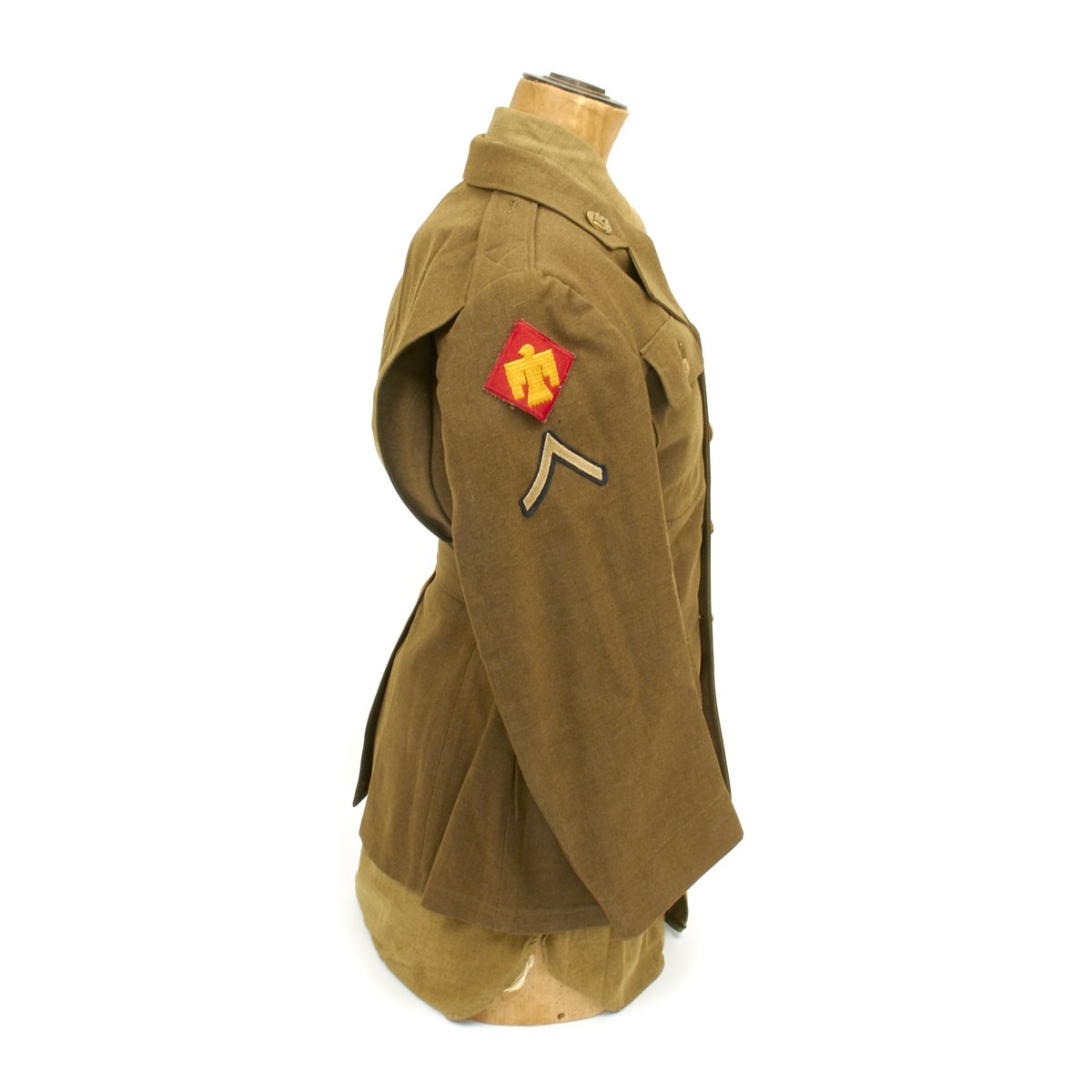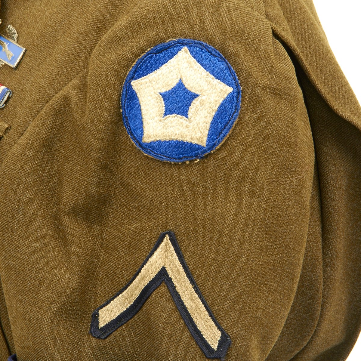 - OD wool 4-pocket coat with all original insignia including 1st Service Command, 45th Division, sterling CIB, 3 ribbon bars including ETO with 1 campaign star, US/MP collar discs, and PFC chevrons. This uniform appears in several photos in his scrapbook.