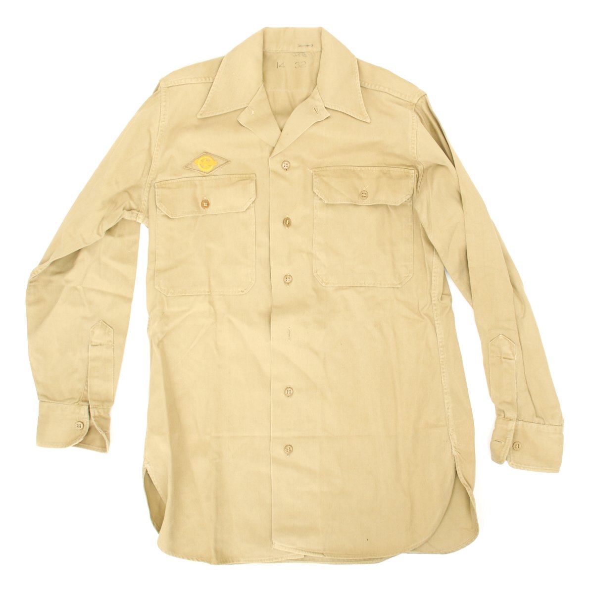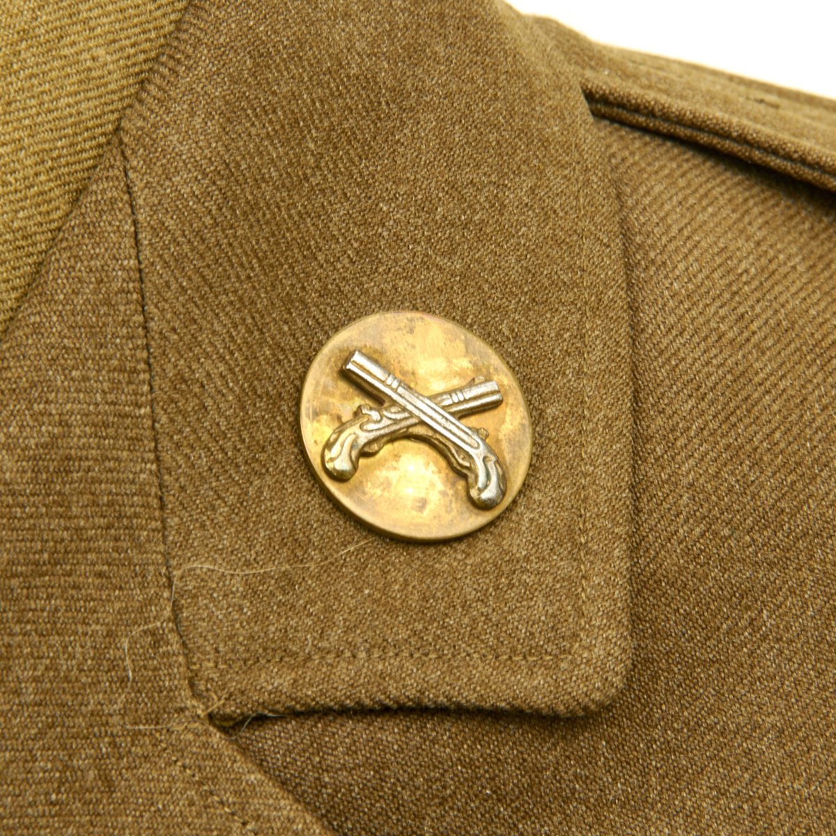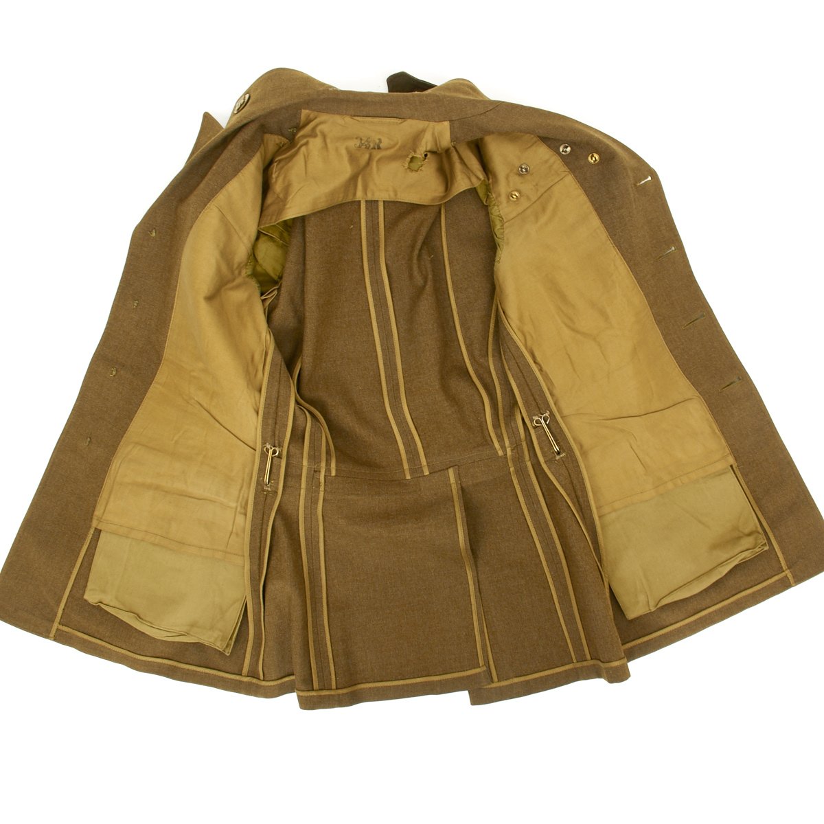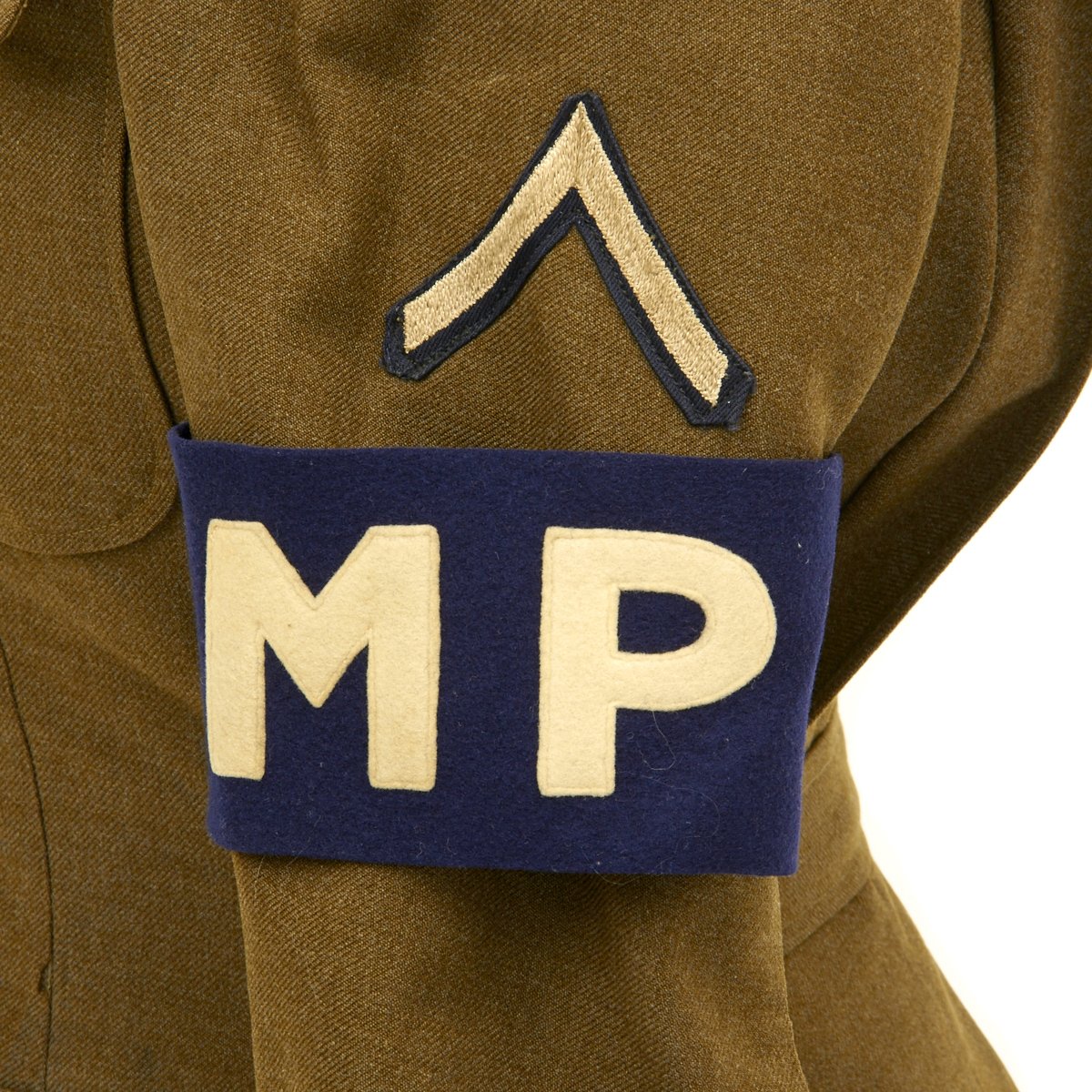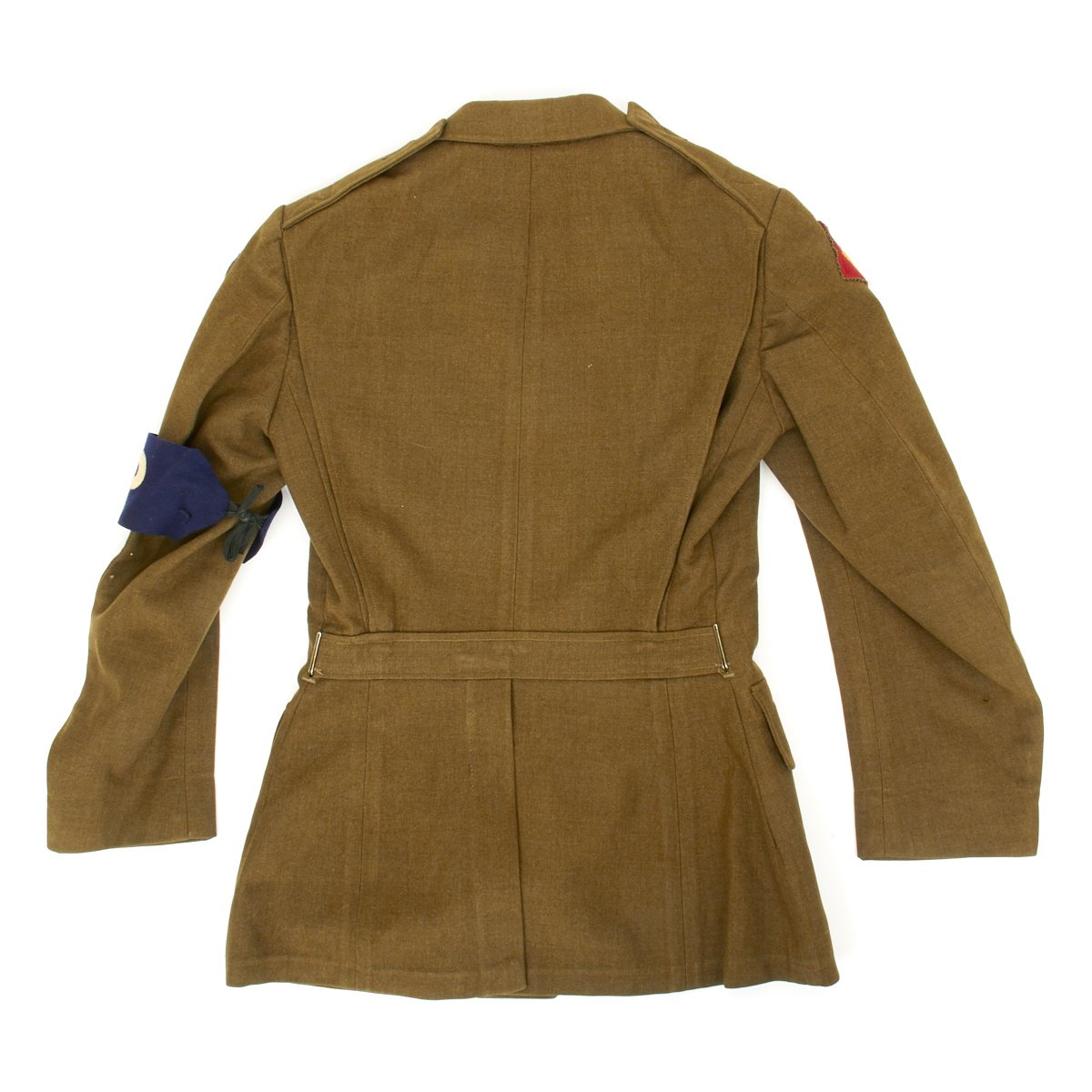 - OD wool 4-pocket coat with all original insignia including 1st Service Command, 45th Division, sterling CIB, 3 ribbon bars including ETO with 1 campaign star, US/MP collar discs, and PFC chevrons. This uniform appears in several photos in his scrapbook.