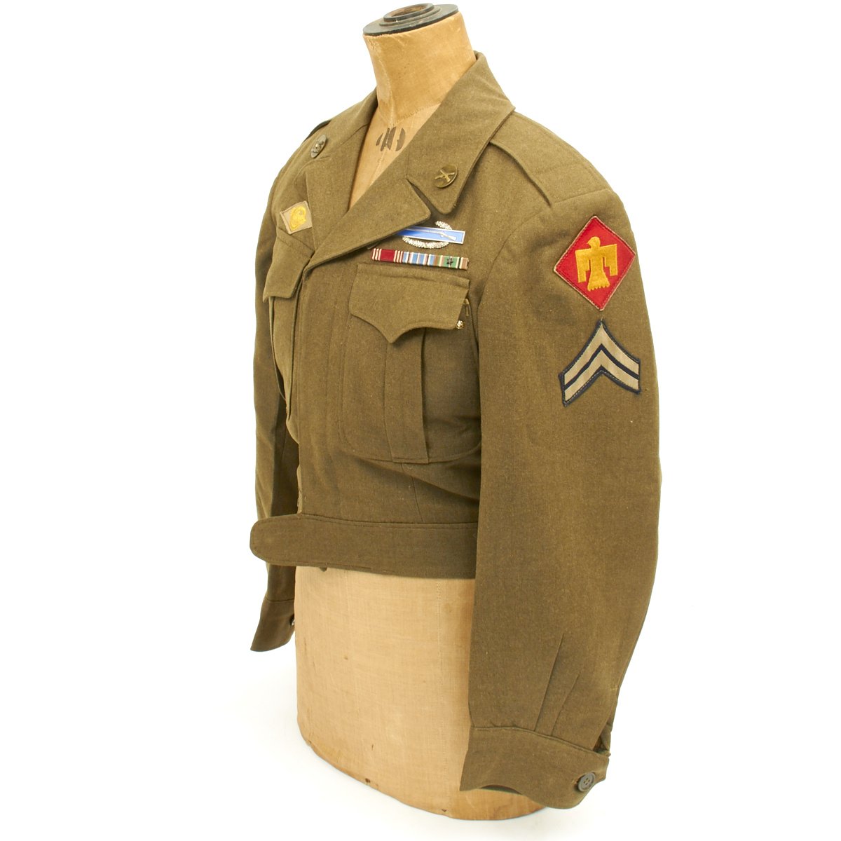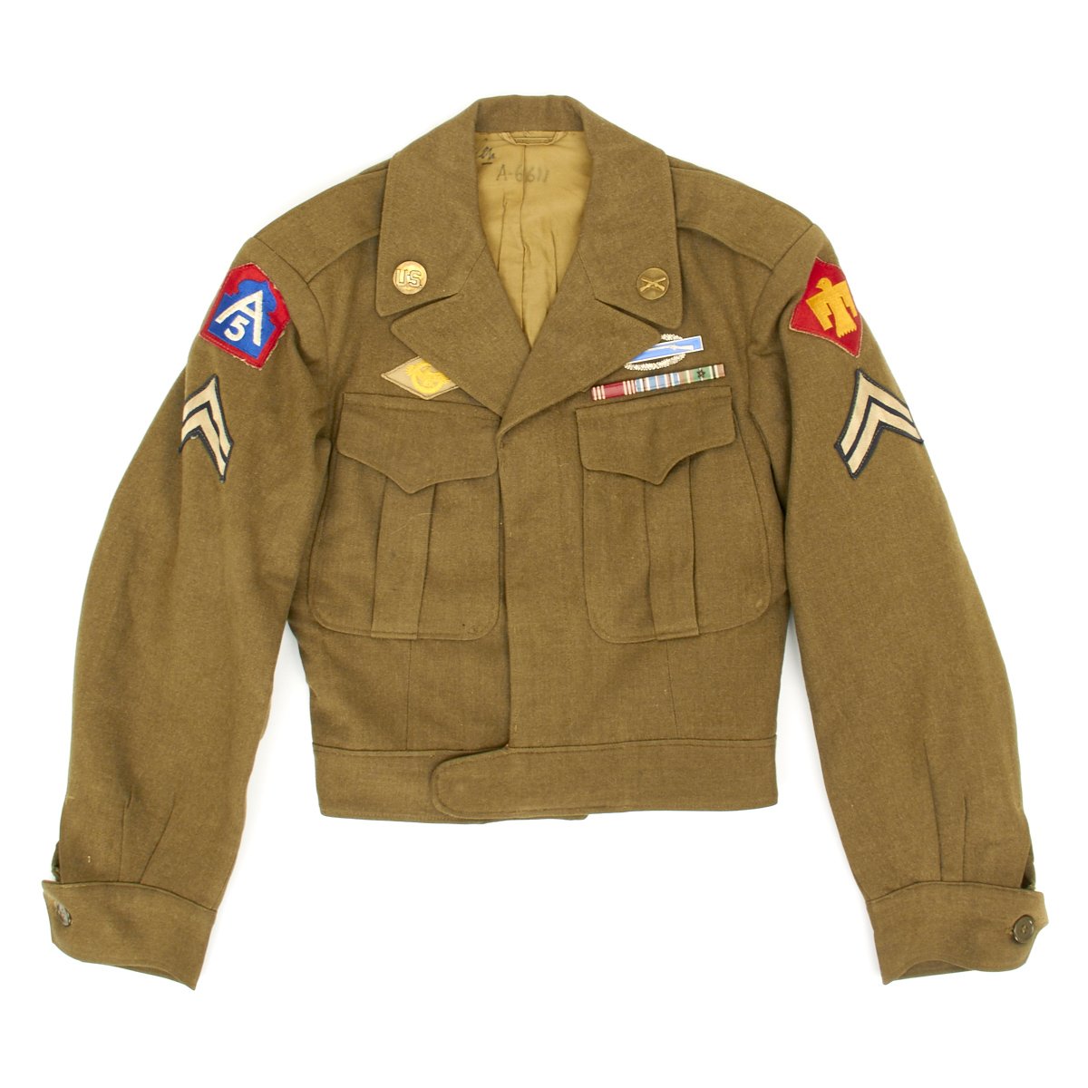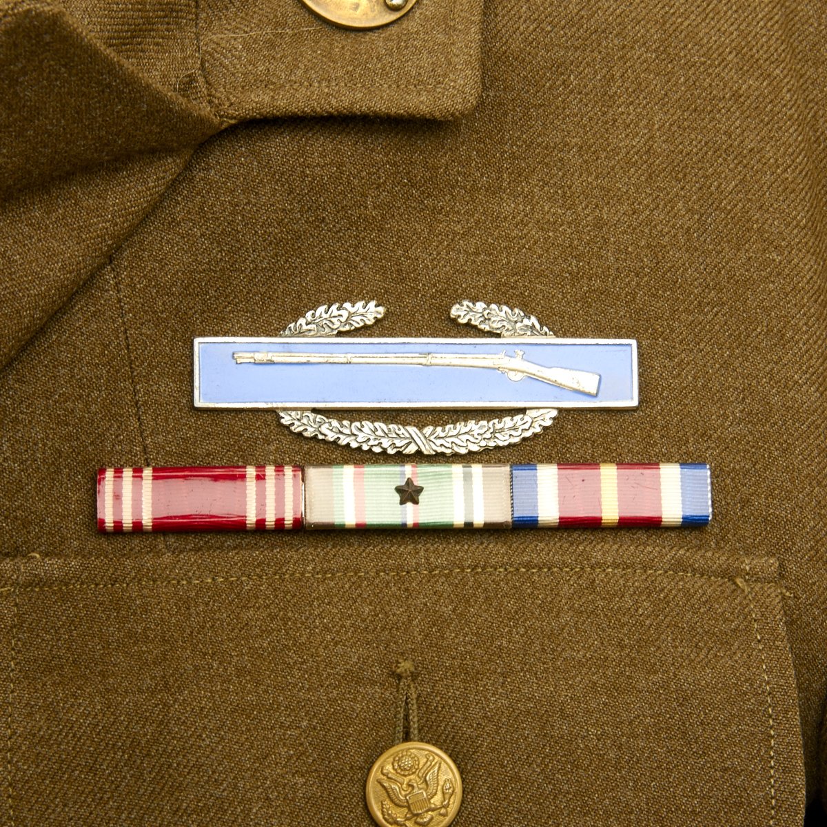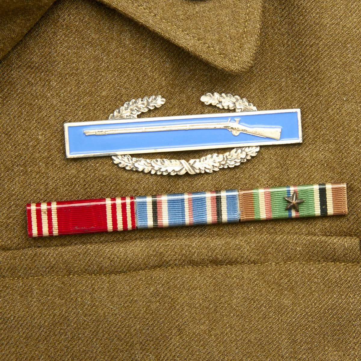 - OD wool Ike jacket with all original insignia including 45th Infantry Division, sterling CIB, 3 ribbon bars including ETO with 1 campaign star.