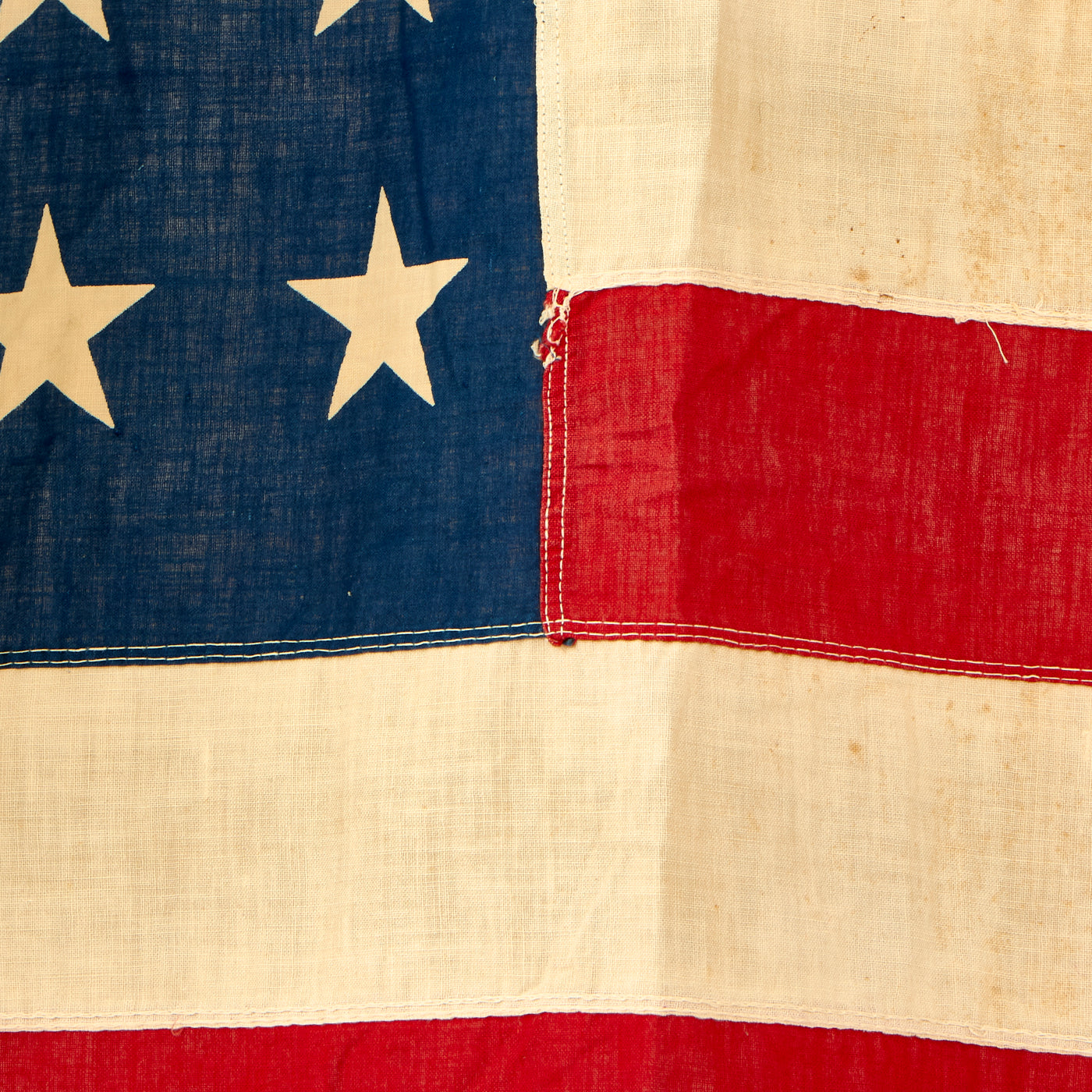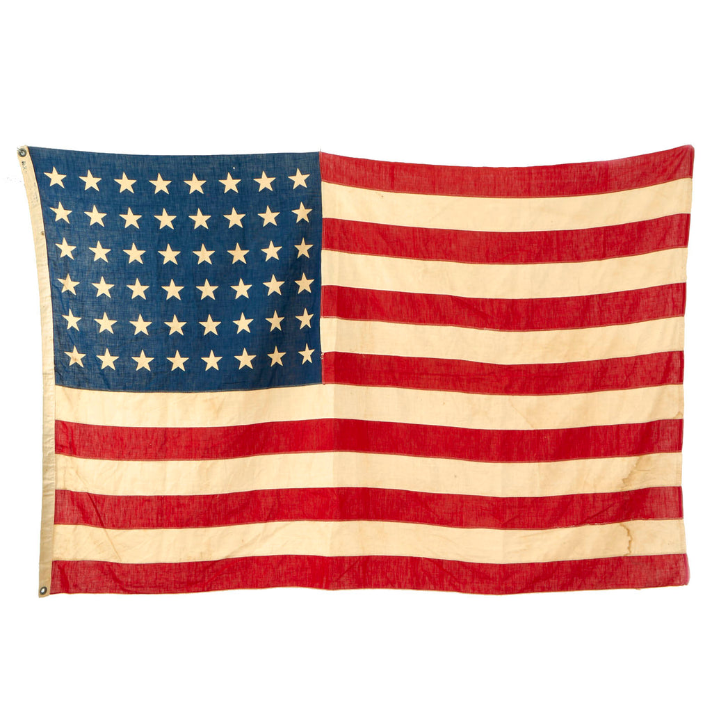Original Item: Only One Available. This is a very nice World War Two Era 48 Star American Flag, in a nice displayable 46" x 68" size. The flag body is of multi-piece cotton bunting construction, with the stars printed on, with a sturdy 1 1/4 inch canvas header. There is a maker's label on the header, but they are too faded and worn to read. It has the standard grommets at either end of the header for flying the flag.