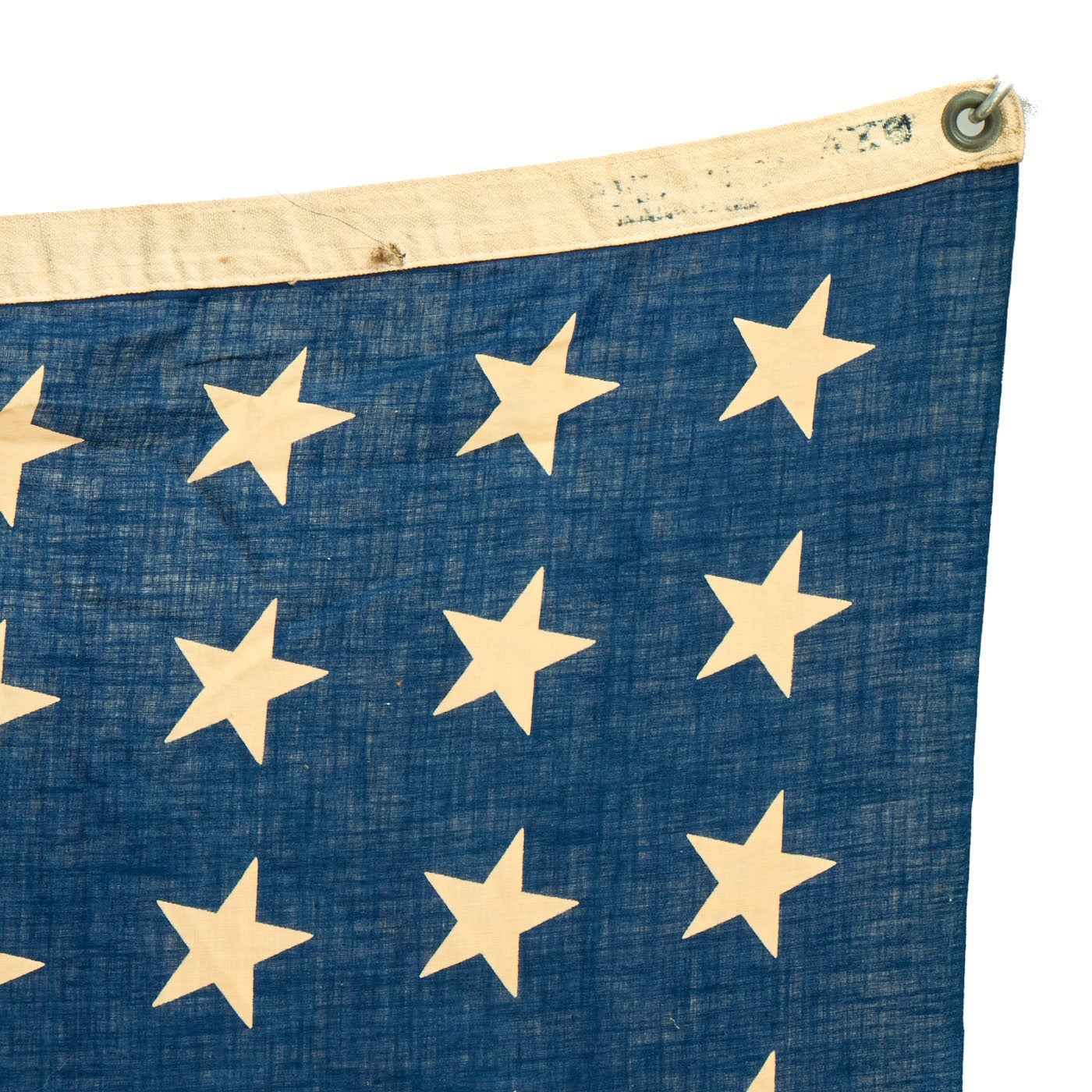 The general rule of thumb is that cotton flags were issued during WWII and nylon flags were issued during the Korean War. Flags made prior to WWII were made of a wool blend. This flag is made from multiple pieces of fabric, with sewn on white stars and zinc grommets. Condition is very good, with the expected age toning and wear from service, as shown.