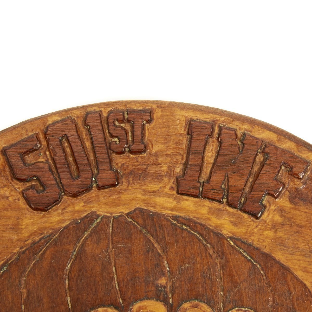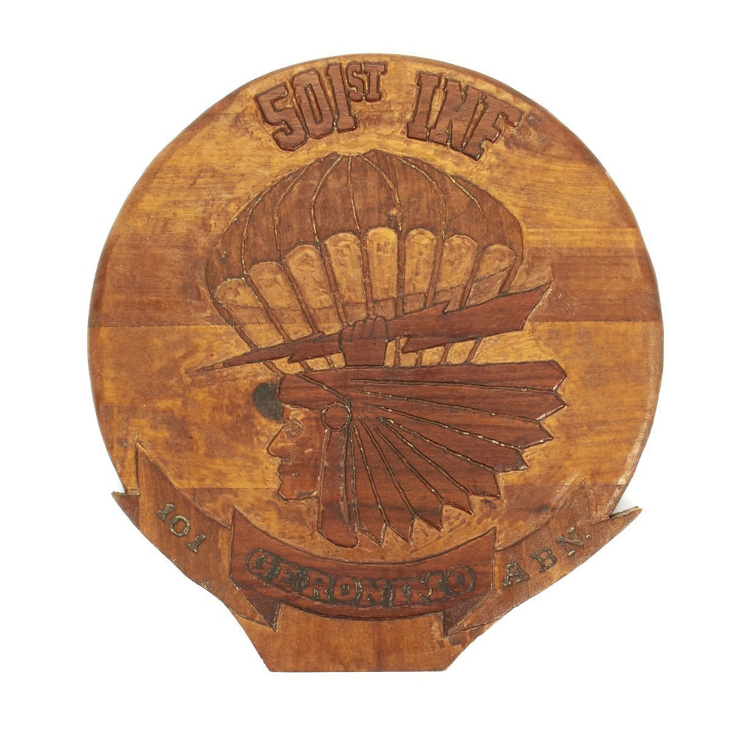 Original Item: Only One Available. This is a wood plaque hand carved with the 501st WWII Pocket Patch GERONIMO insignia. The top read 5-1st INF and the bottom read 101 ABN. The plaque measures 16 inches round and is 3/4 inch think. It is offered in excellent condition. We are not 100% sure of the date of manufacture, certainly the insignia is the WWII version, bu the term 501st Infantry is post war, there is no definitive way to know. Regardless it is a fantastic display piece for any U.S. Airborne collection.