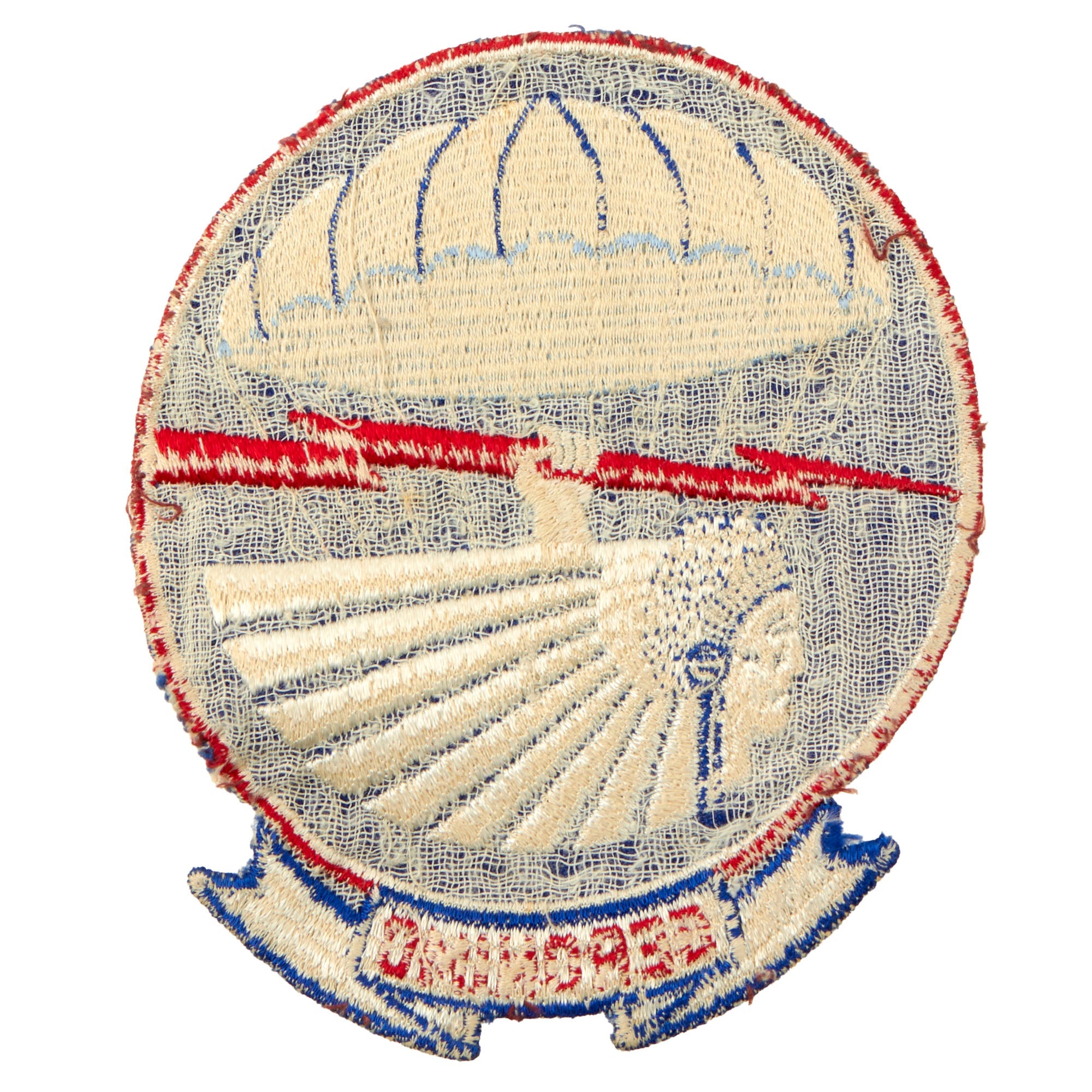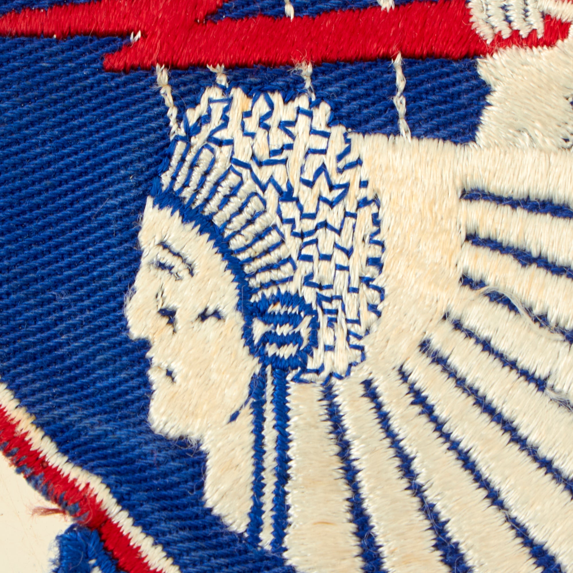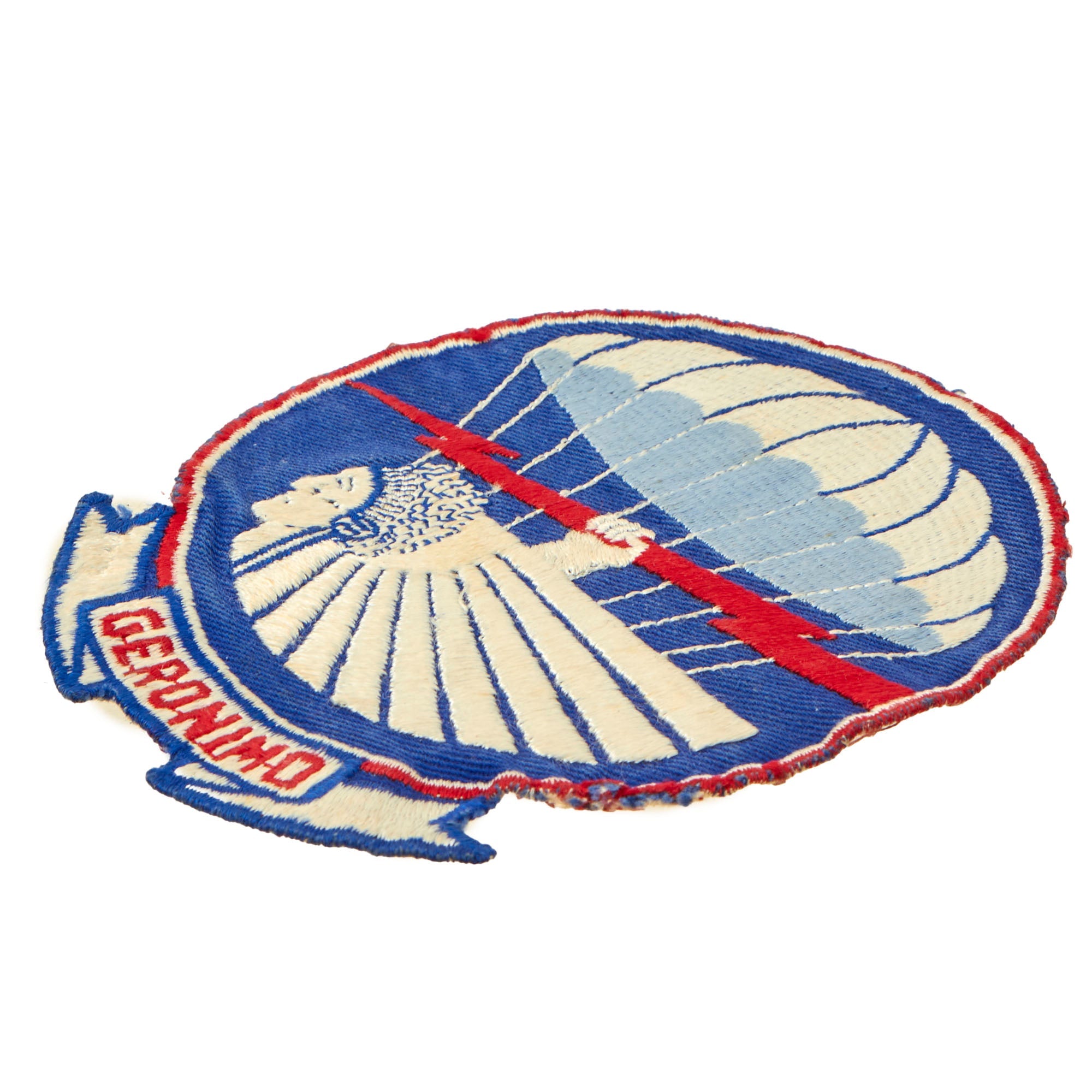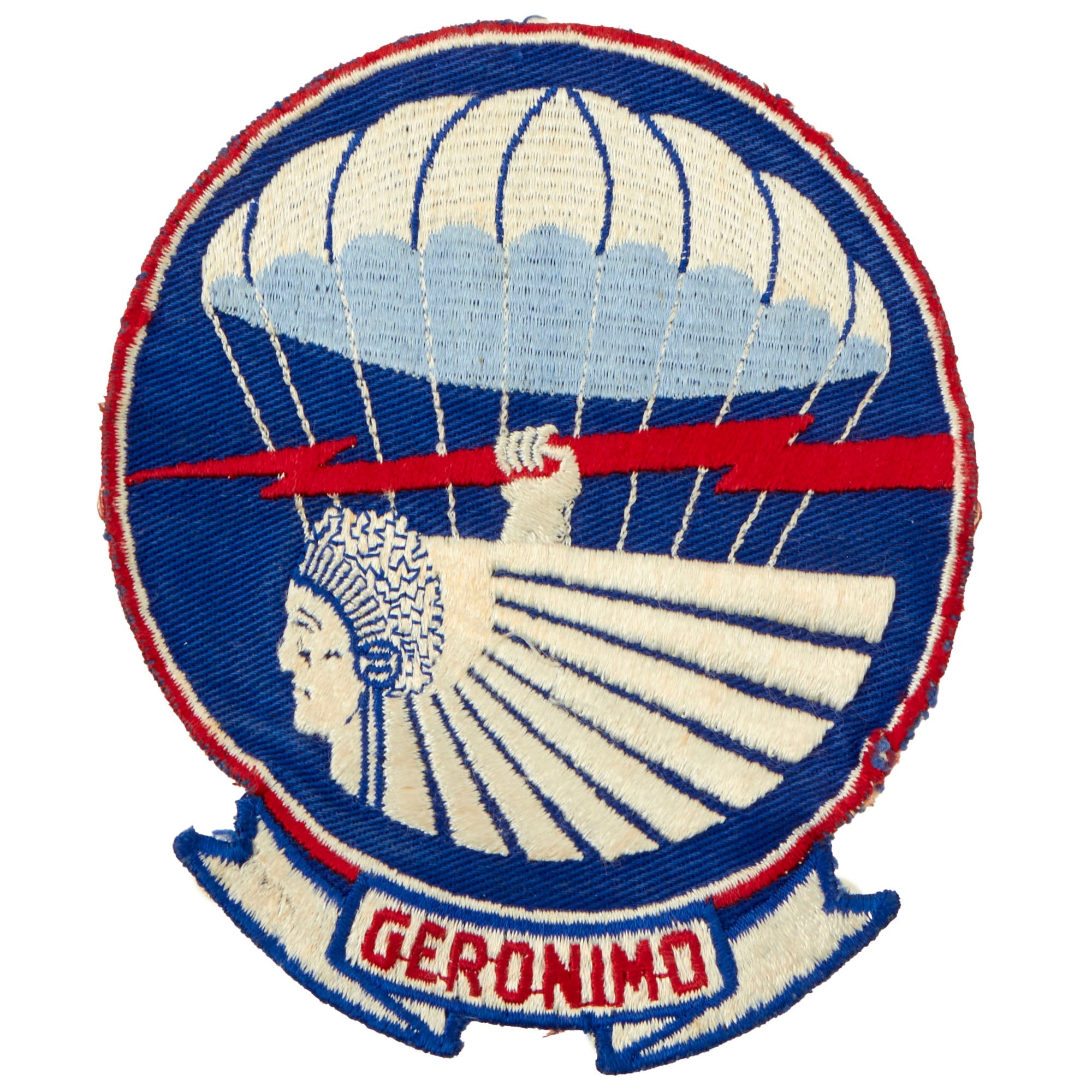 This is an extraordinarily scarce Geronimo pocket patch, which was worn on the chest of jump jackets and field jackets (and occasionally as a shoulder patch), but it was never worn on the dress uniform. It measures approximately 4½ x 5⅜” and is in fantastic condition, with some minor fraying of the material, but otherwise it is in stellar shape. The construction of the back is entirely period correct, and this is the first original example we have ever offered.