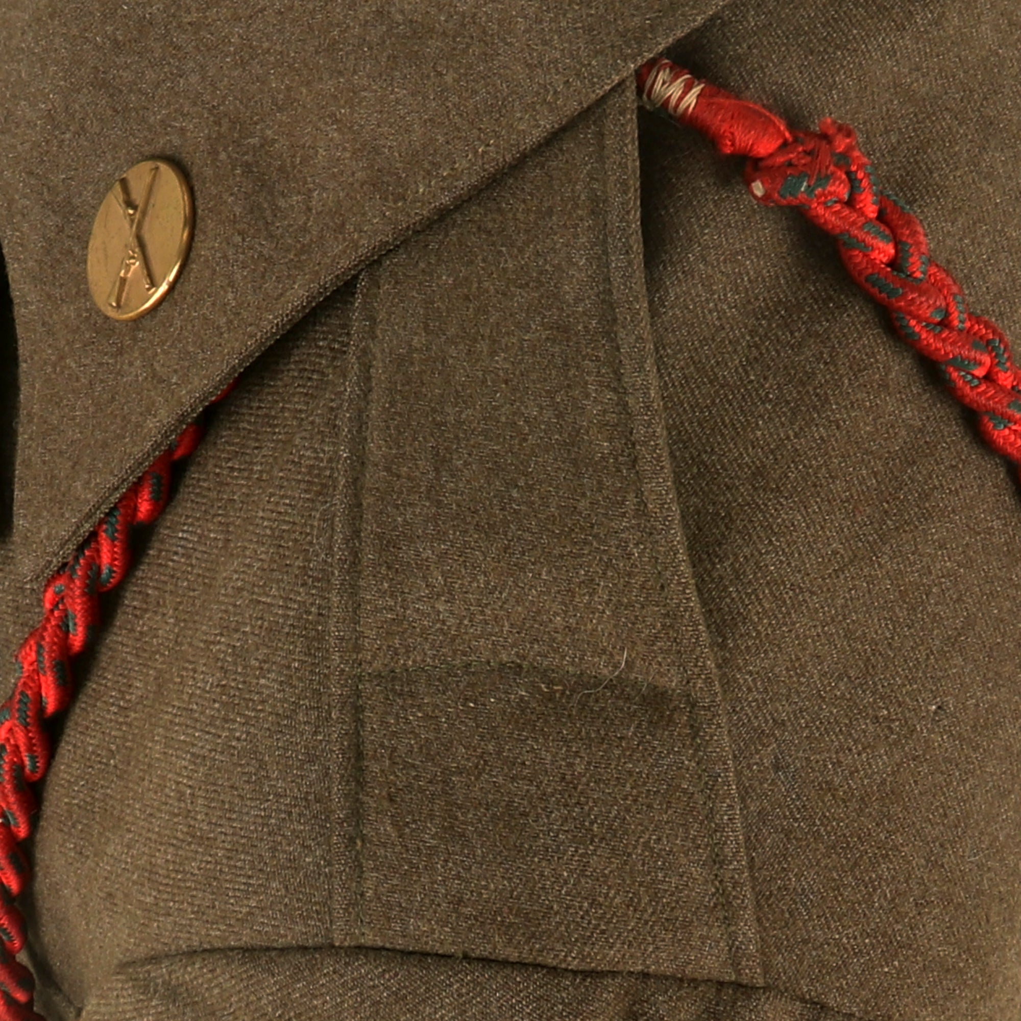 - The "Belgian Fourragère 1940"- composed of one round smooth cord, partially braided, and of TWO other cords, of which one is terminated by a knot and a brass ferret - it is made of wool and cotton for NCOs and EM, and of silk for Officers - all threads are tinted in colors resembling the ribbon of the Belgian Croix de Guerre 1940 (i.e. basic red, dotted with green threads) - the Fourragère encircles the LEFT shoulder and passes under the armpit, and is fixed by 2 tiny loops onto the button of the shoulder loop.