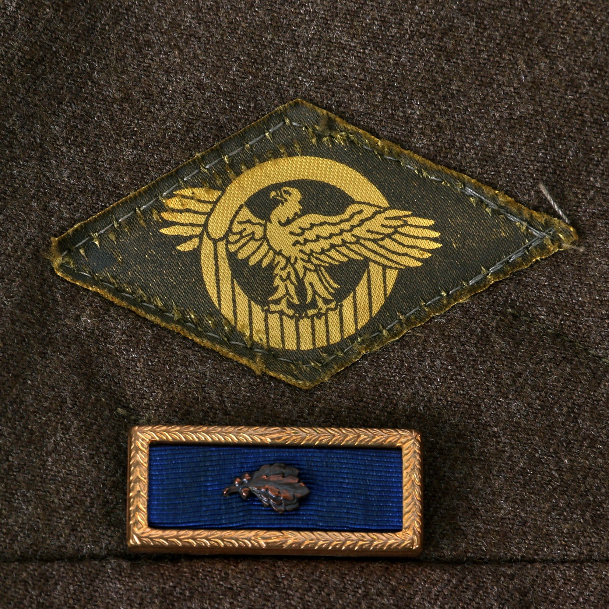- The right breast pocket has a Ruptured Duck patch and a Presidential Unit Citation badge with Oak Leaf Cluster.