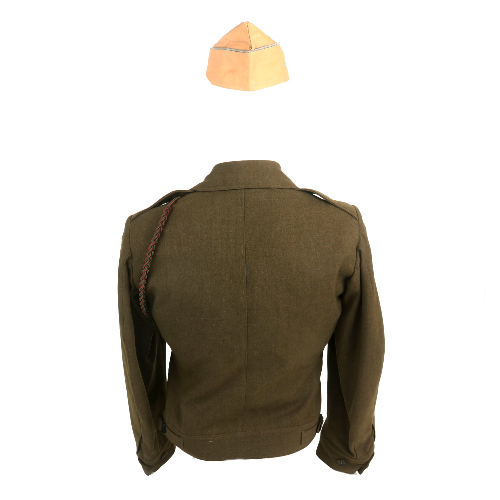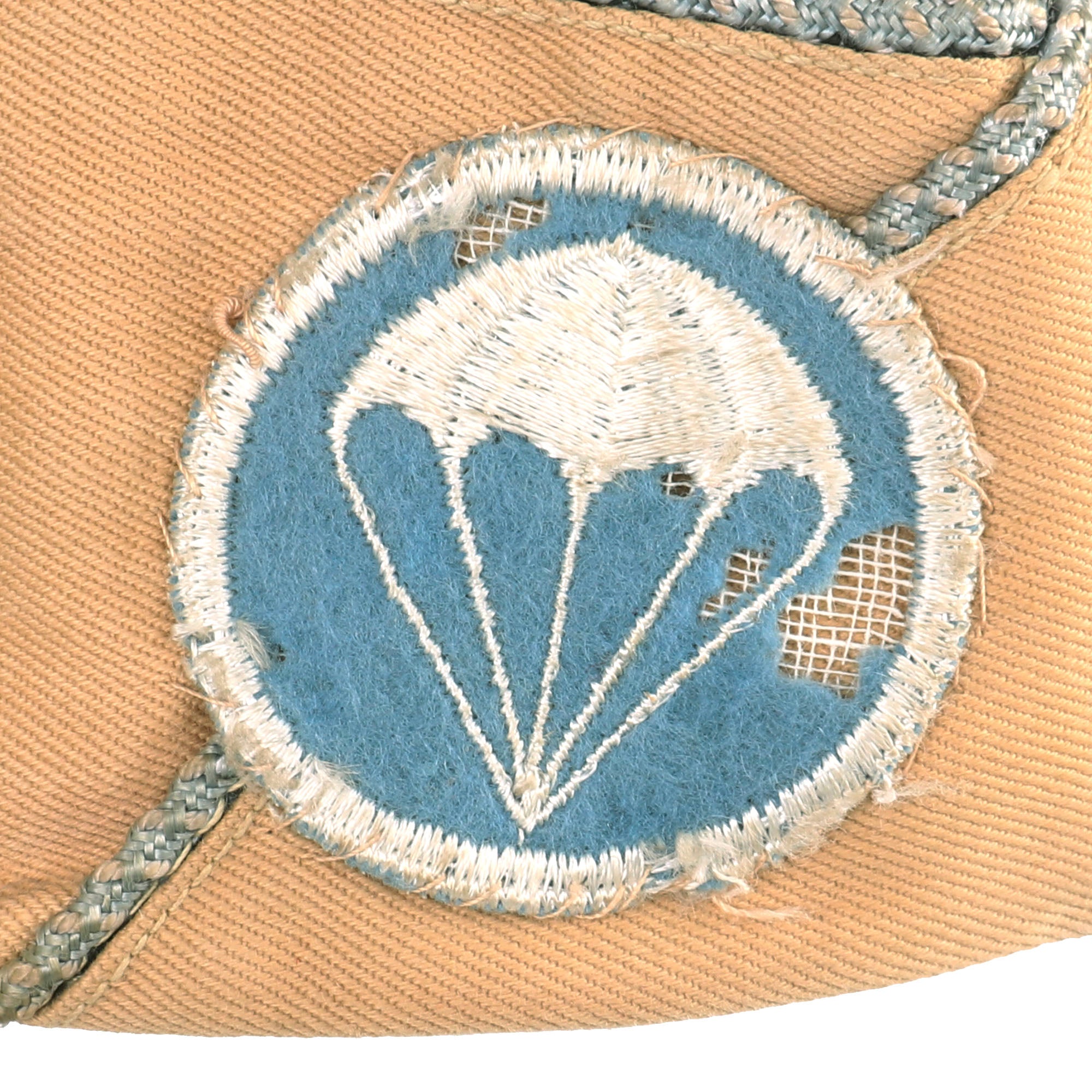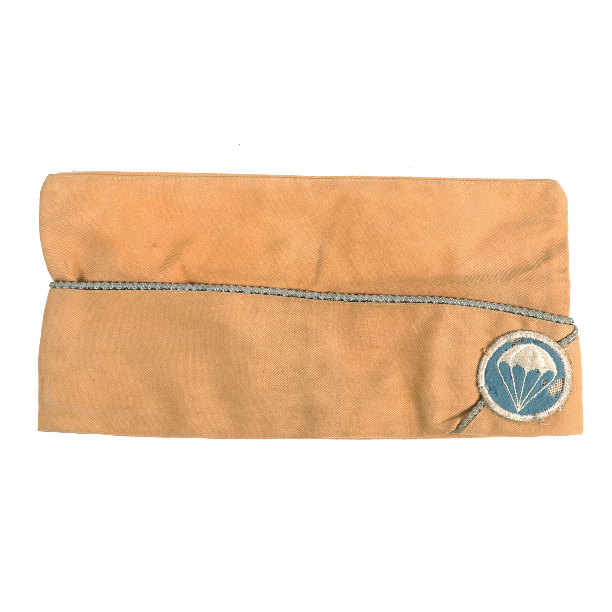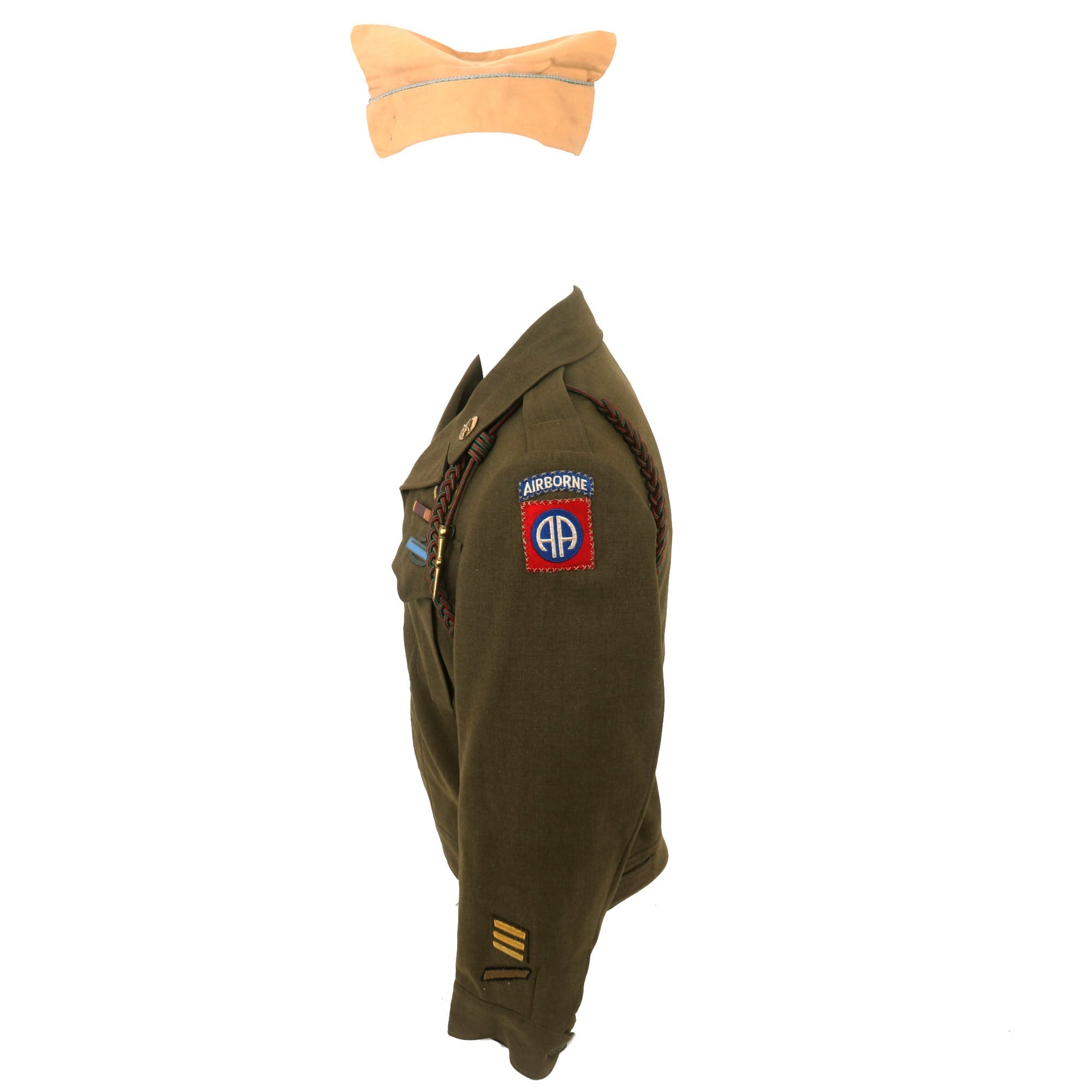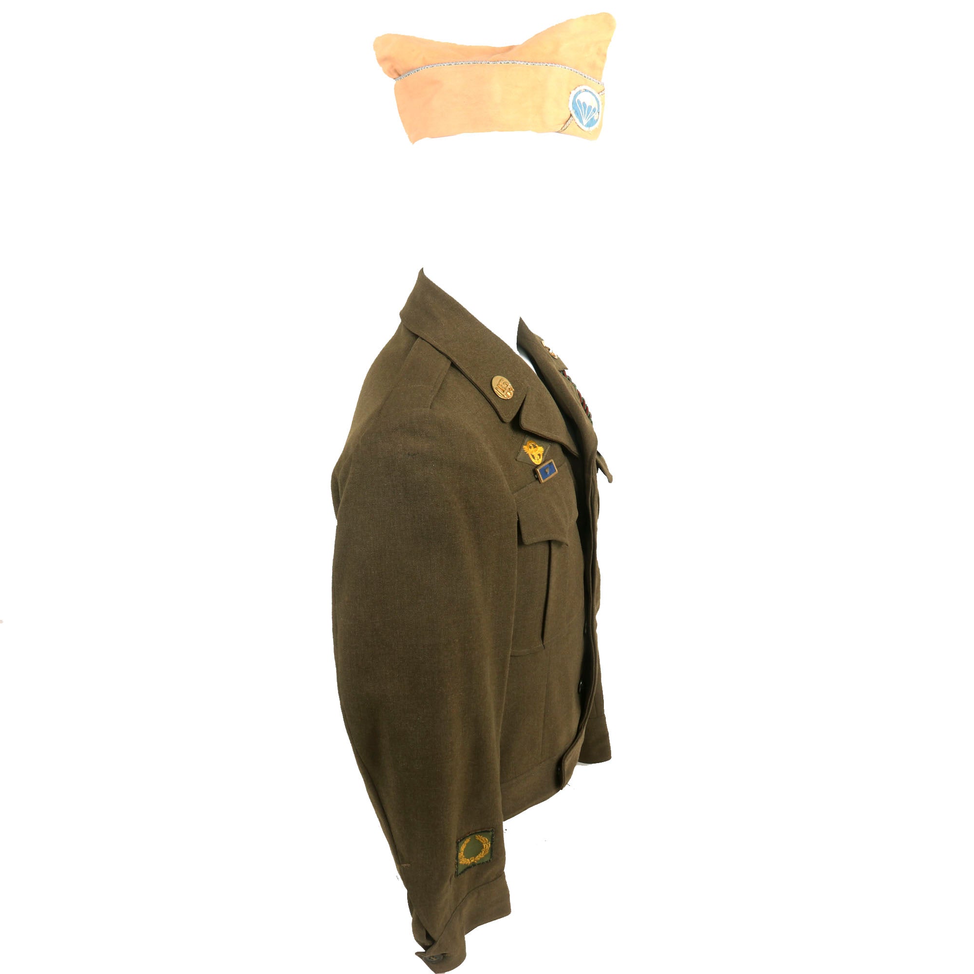 Also included is a US Army Infantry Khaki Overseas Cap with blue and white parachute regiment patch. The cap is approximately a size 6 1/2 US.