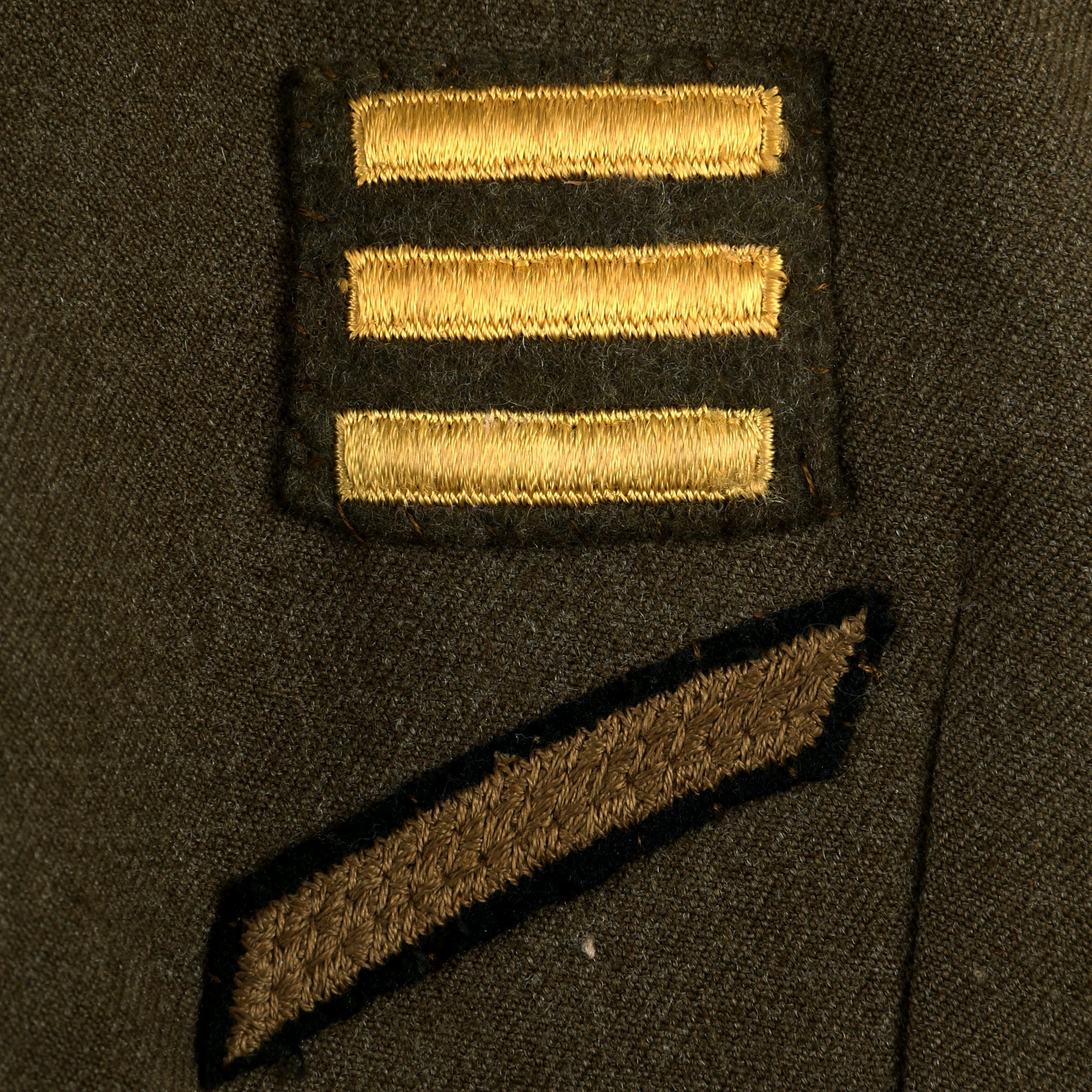 - Three overseas service bars (on left sleeve cuff) 18+ months of combat service along with a Three Year Service stripe.