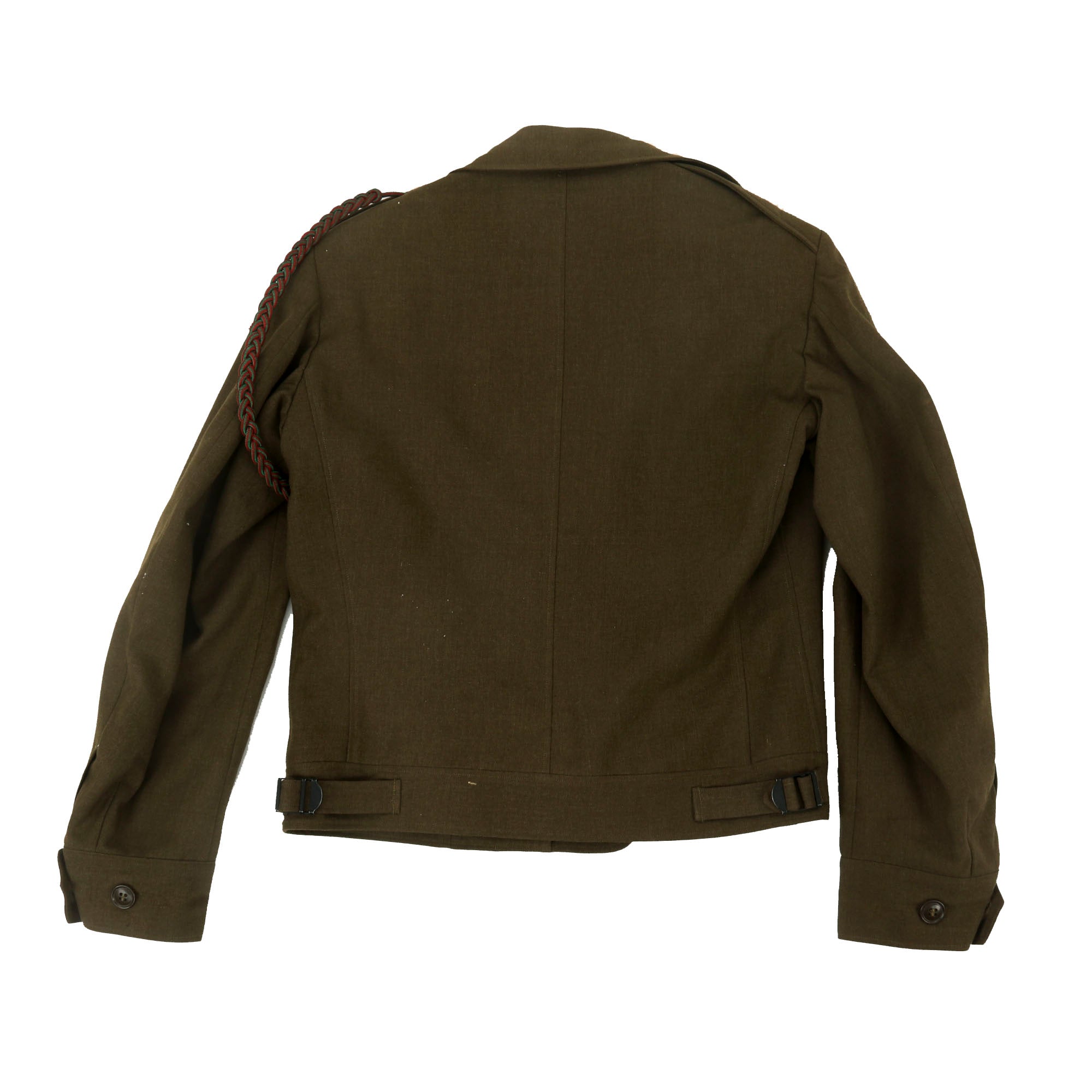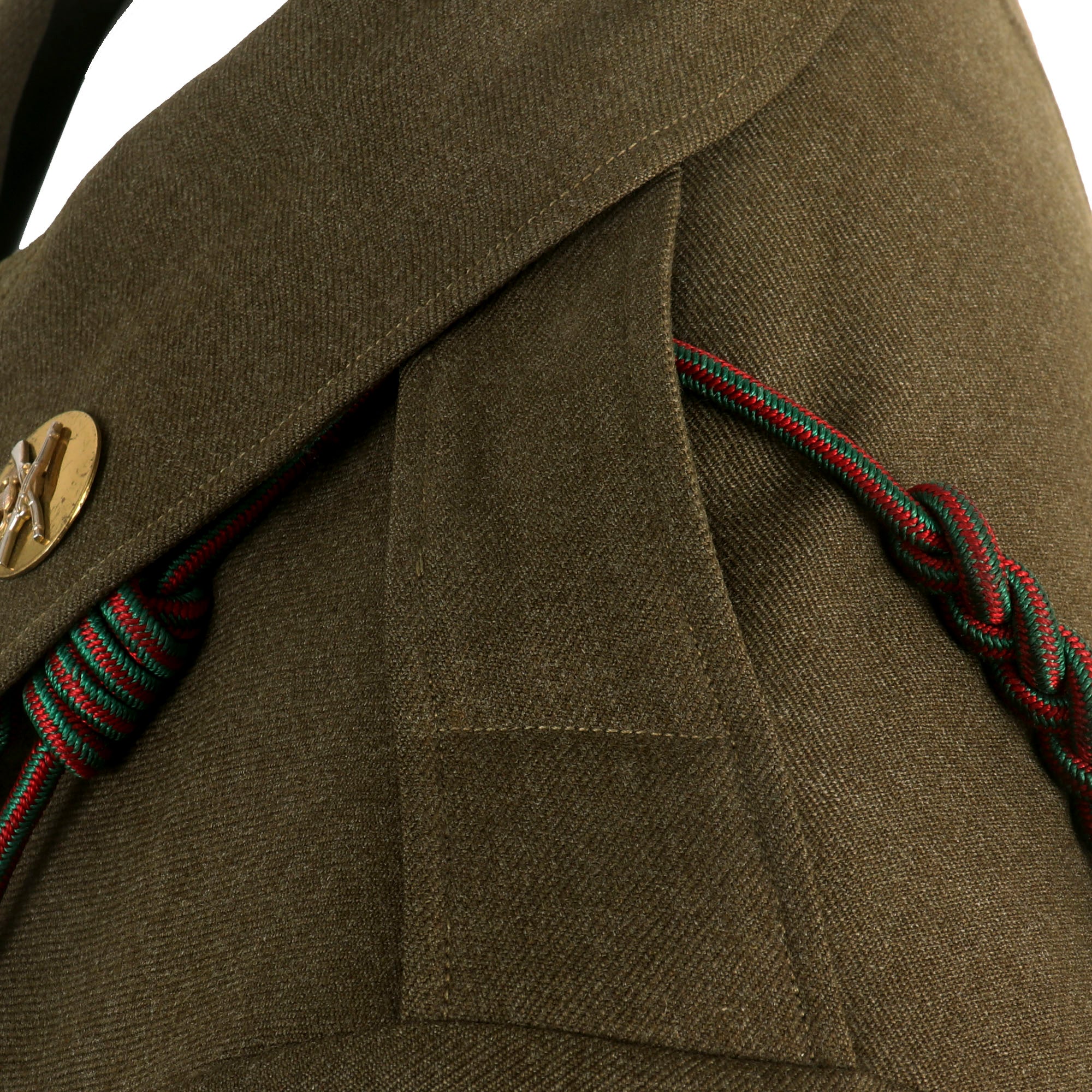 - The "Belgian Fourragère 1940"- composed of one round smooth cord, partially braided, and of TWO other cords, of which one is terminated by a knot and a brass ferret - it is made of wool and cotton for NCOs and EM, and of silk for Officers - all threads are tinted in colors resembling the ribbon of the Belgian Croix de Guerre 1940 (i.e. basic red, dotted with green threads) - the Fourragère encircles the LEFT shoulder and passes under the armpit, and is fixed by 2 tiny loops onto the button of the shoulder loop.