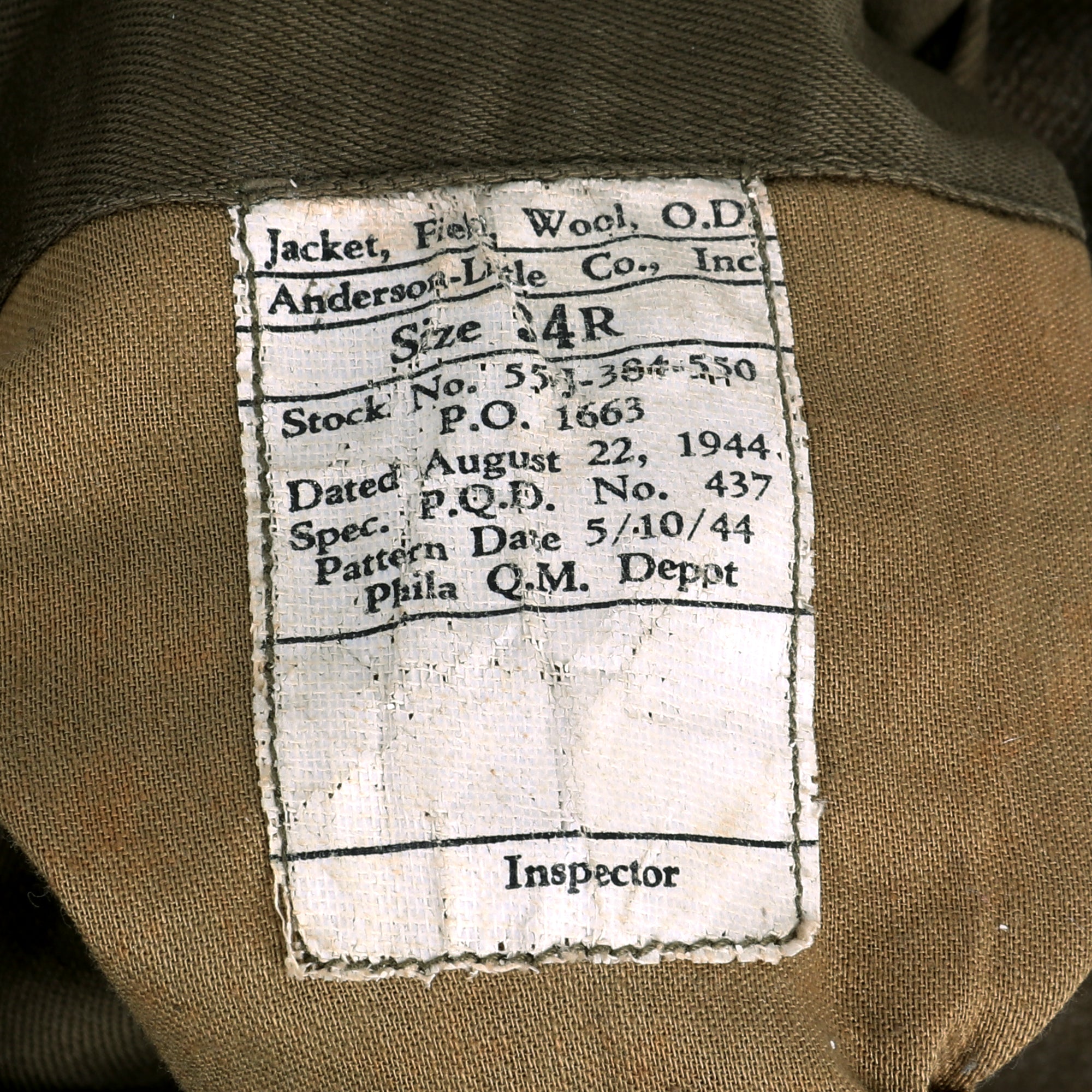 - The jacket has an original data label from and is dated August22nd 16th, 1944.