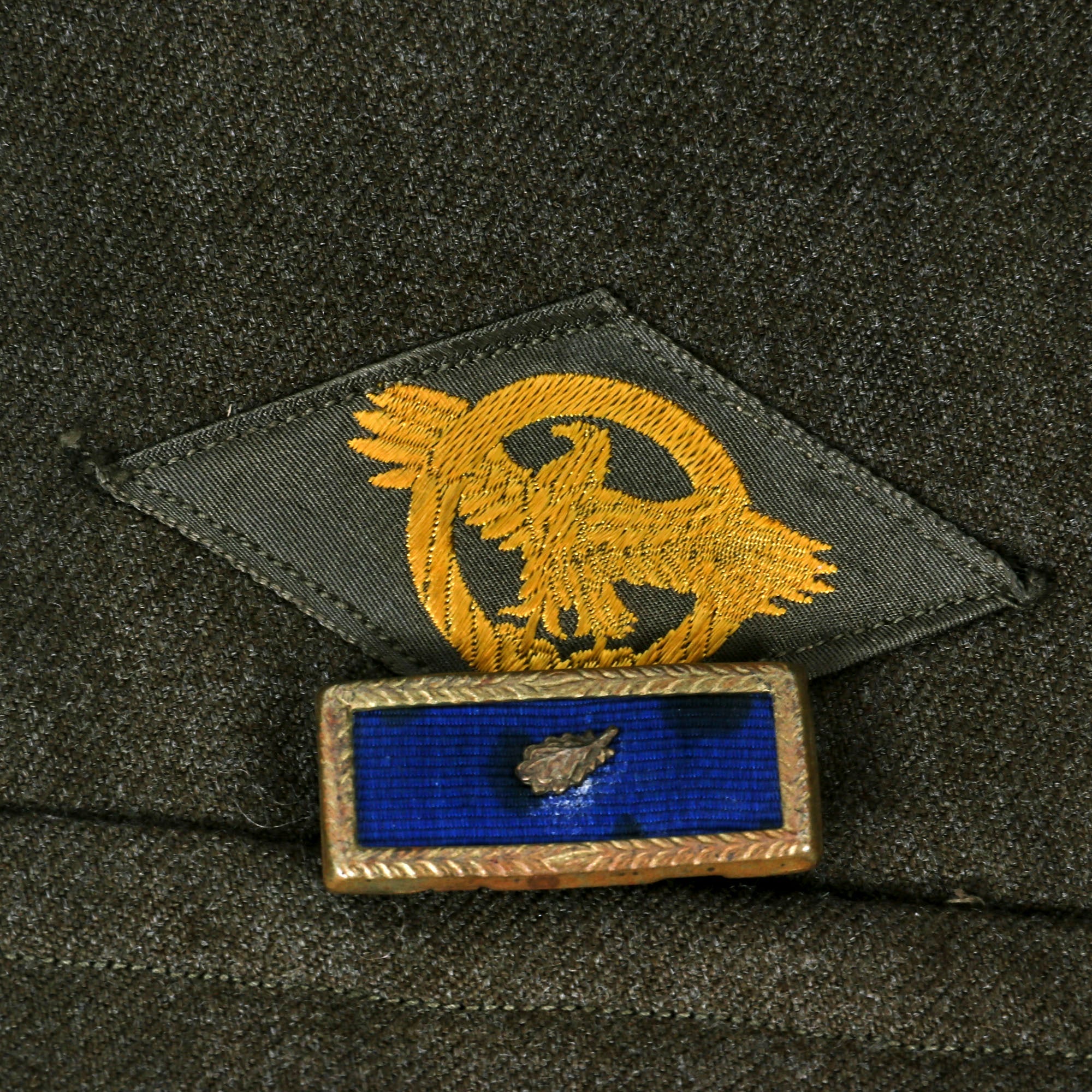 - The right breast pocket has a Ruptured Duck patch and a Presidential Unit Citation badge with Oak Leaf Cluster.