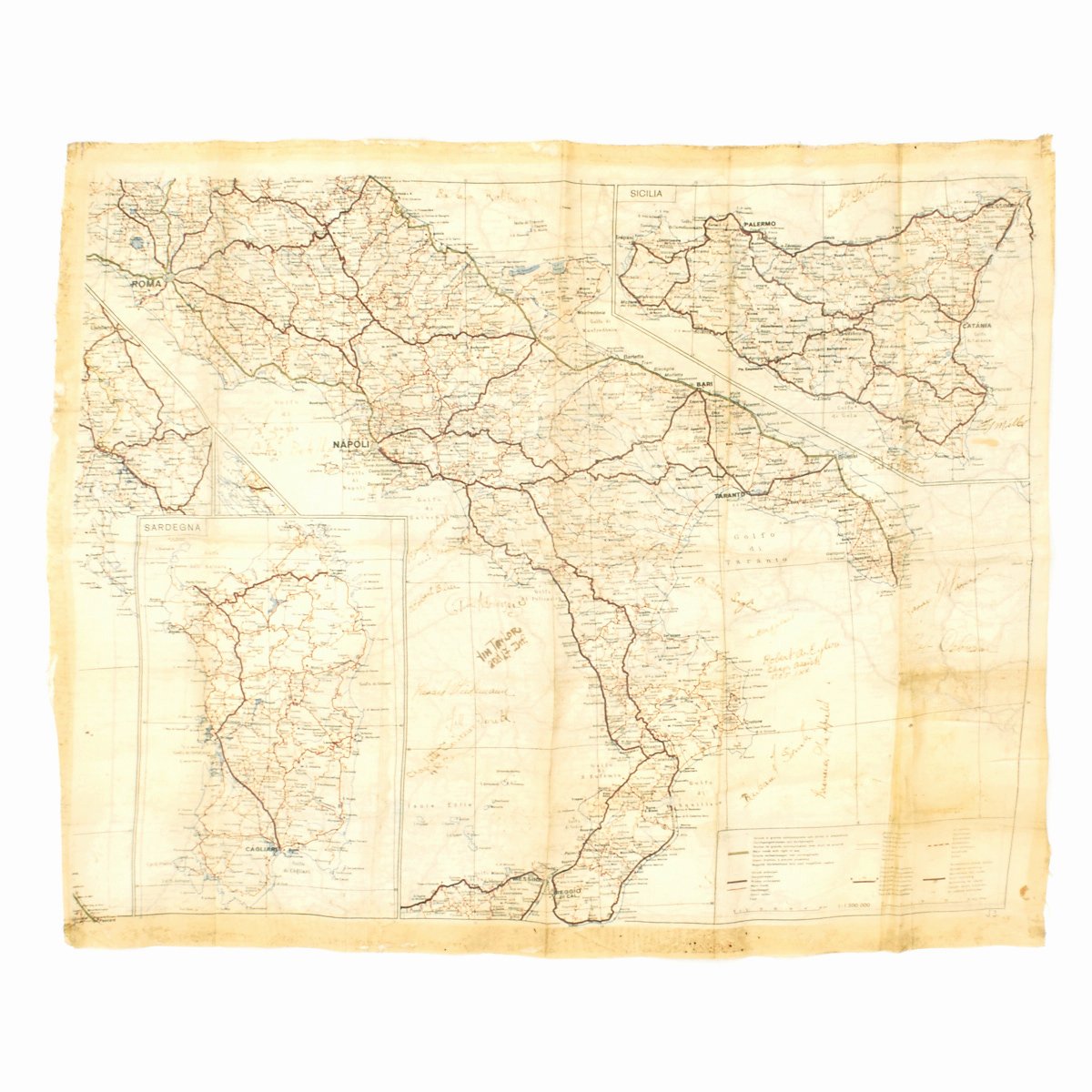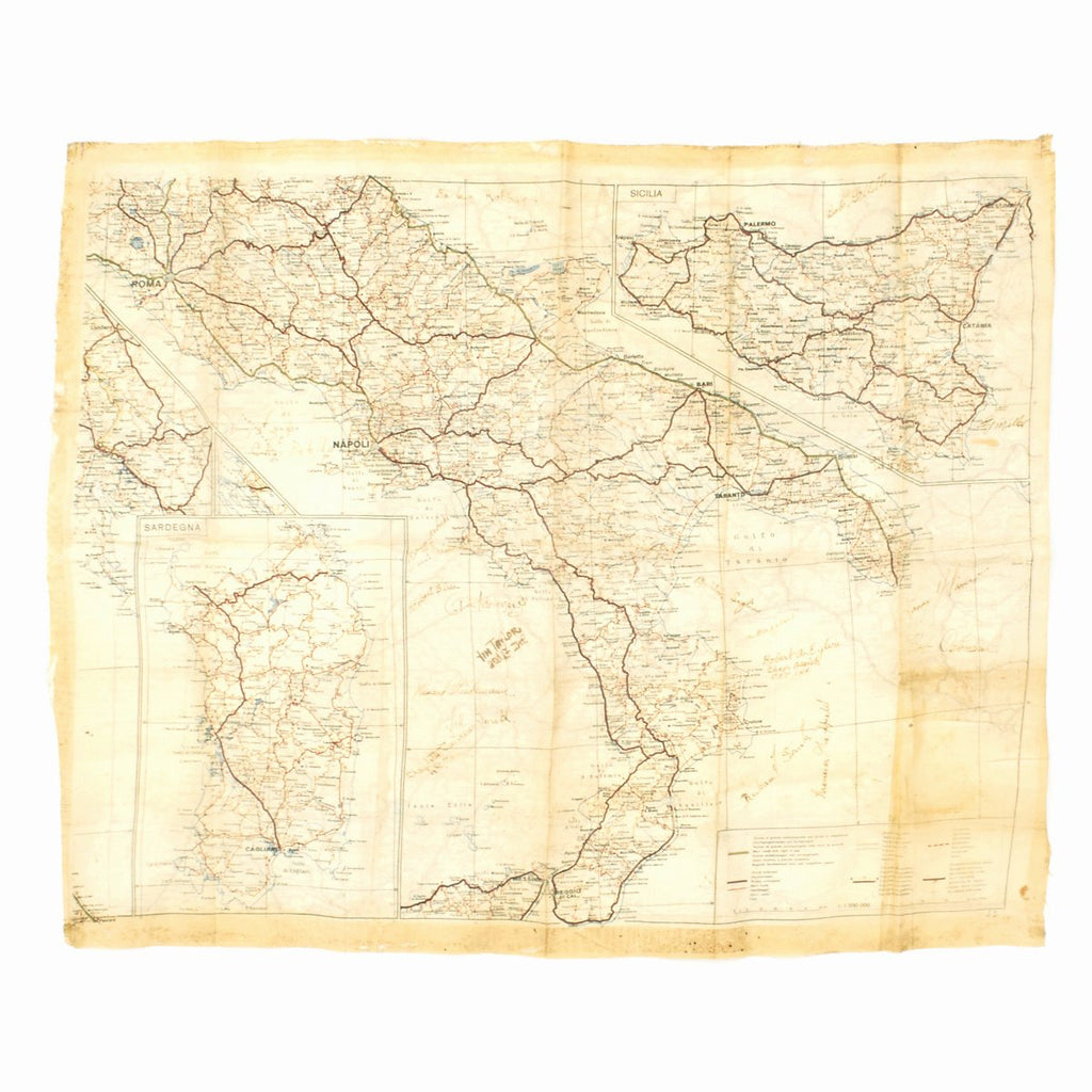 Original Items: One-of-a-kind. This is an artificial silk map sheet J3 and J4 Italian map which is an unusual in that it is based on native Italian maps and not a Bartholomew map. The key/legend is also unusual as it is in Italian, German, French, English, Dutch and we think Hungarian and Yugoslavian. Records show that it was printed in 1942.