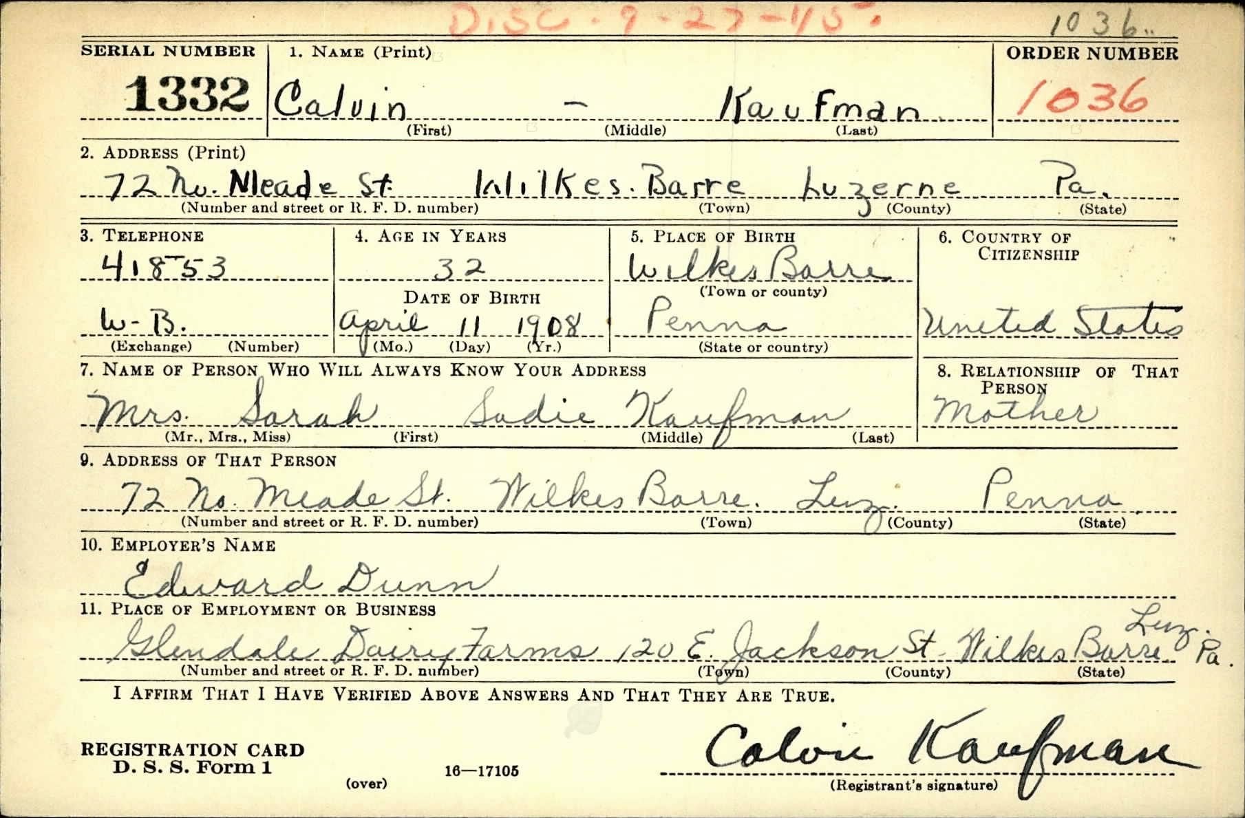 - Copy of orders awarding Kaufman his Combat Medic Badge, printed photos of Kaufman in uniform, copy of his draft registration card and pages of additional research are all included.