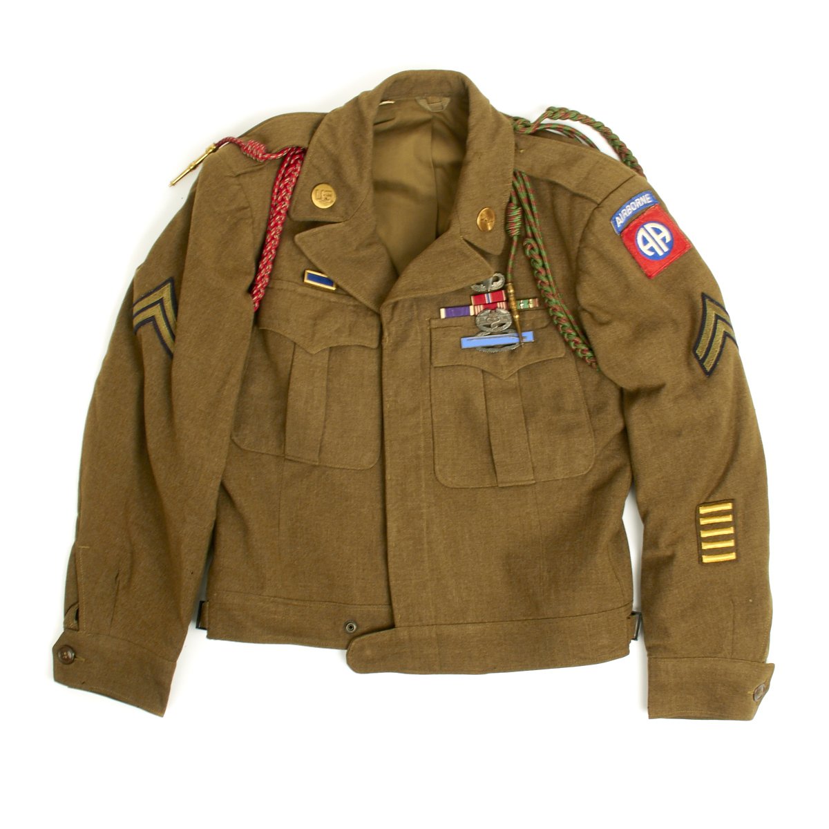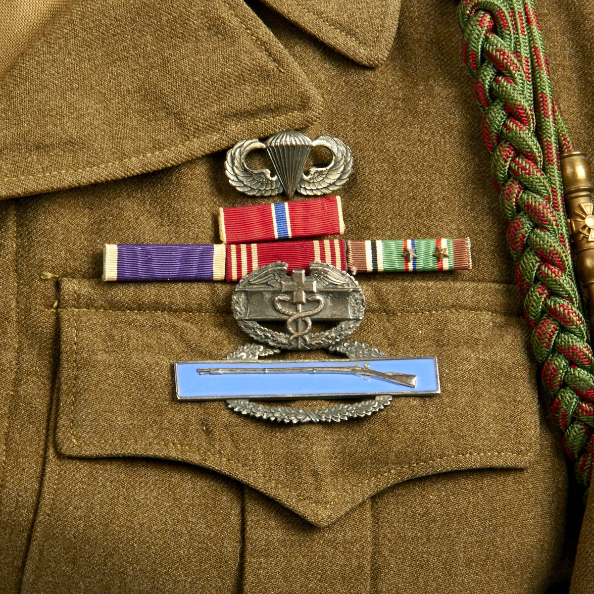 - Wonderful condition size 38R WW2 Ike jacket with Sterling Silver Combat Medic Badge, Sterling Silver Paratrooper Jump Wings, the following medal ribbons: Bronze Star, Purple Heart, Good Conduct, European–African–Middle Eastern Campaign Medal with Arrow Head with two battle stars. Sterling Silver Combat Infantry Man (CBI) badge, 82nd Airborne Patch on left shoulder, Presidential Unit Citation with Oak Leaf, Belgian Red and Green Fourragère shoulder cord, as well as the French Croix De Guerre Fourragère shoulder cord. Left sleeve has 5 overseas bars indication 30+ months in overseas service. Inside lining of the jacket has laundry number in ink in armpit.