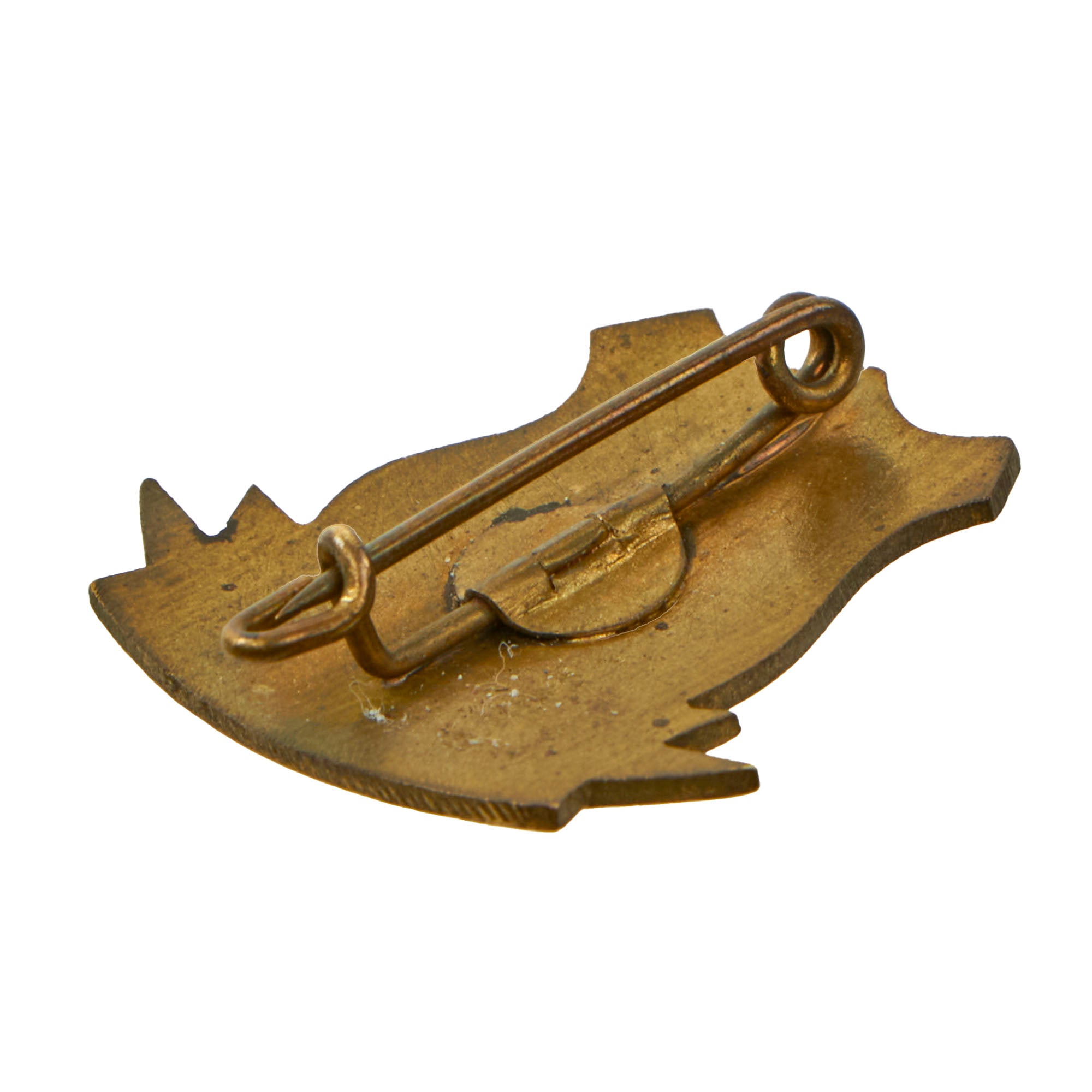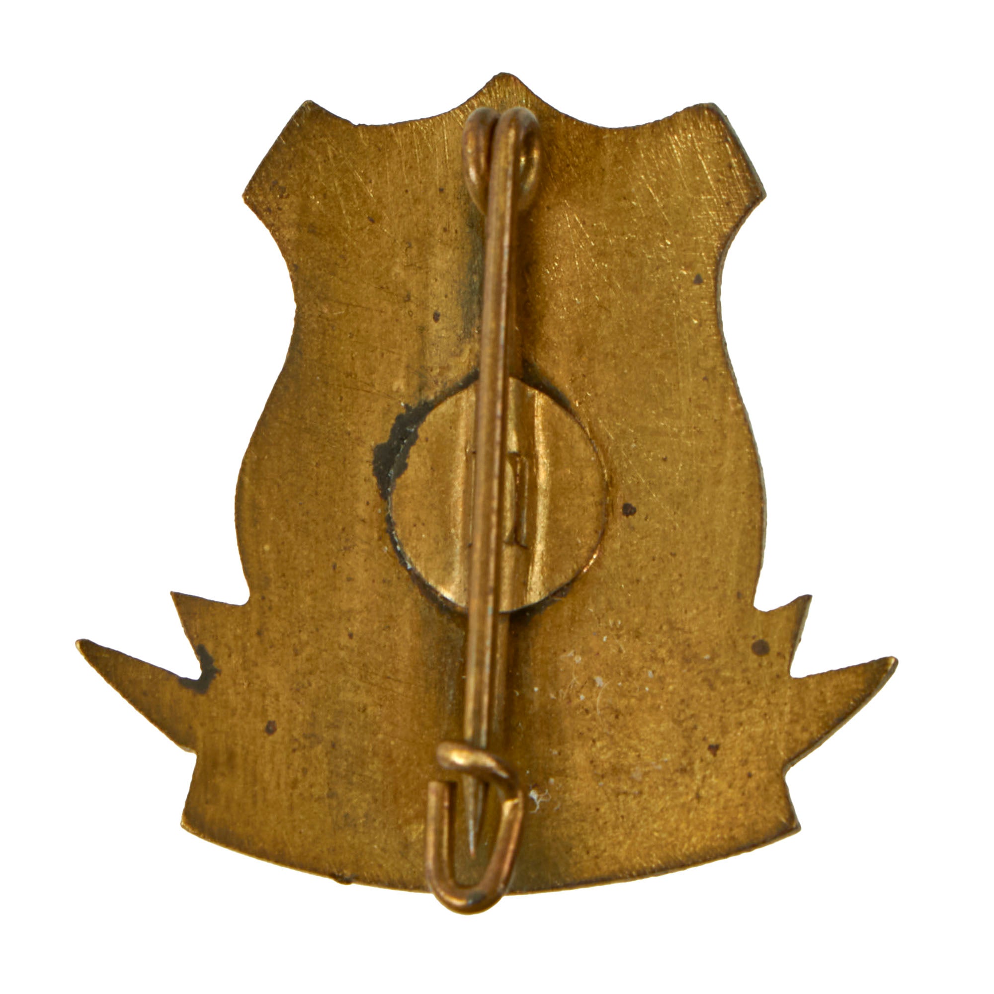 This is a very scarce original WWII example of a Distinctive Insignia for the 506th Parachute Infantry Regiment. This is certainly a Wartime example, as the post-war variants had the shield mirrored, with the lightning bolt facing the other way and the parachutes on the other side. It measures roughly 1 1/16 x 15/16”. This example has heavy wear and loss to the enamel in the center as shown.