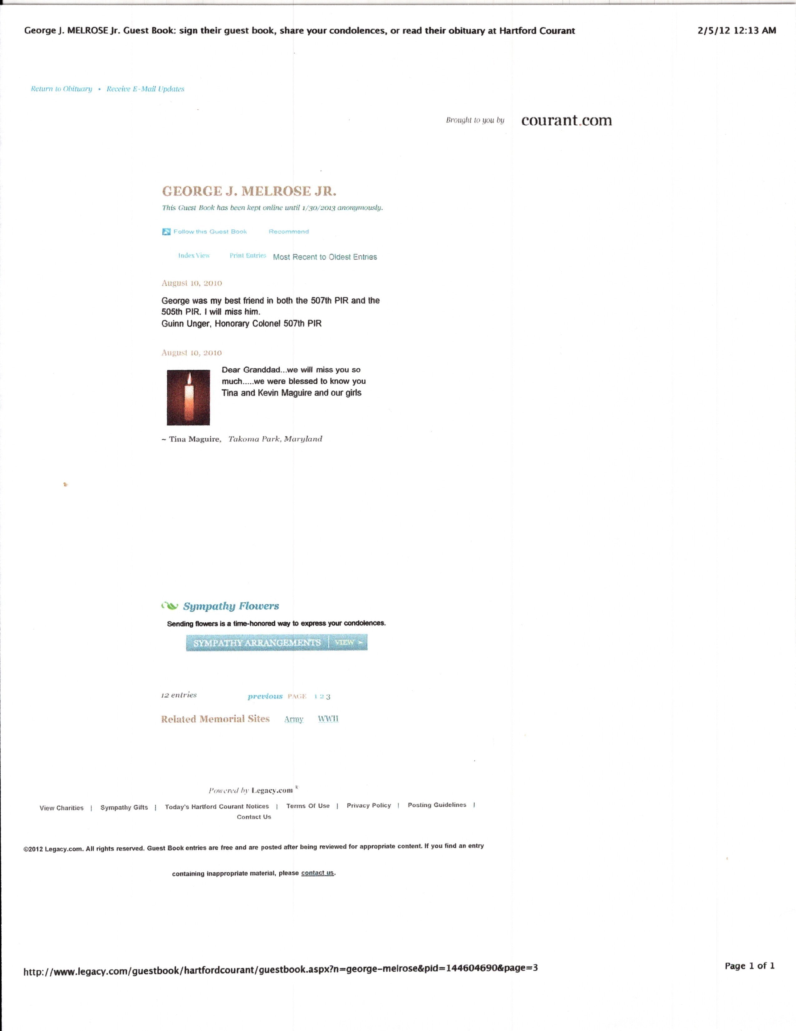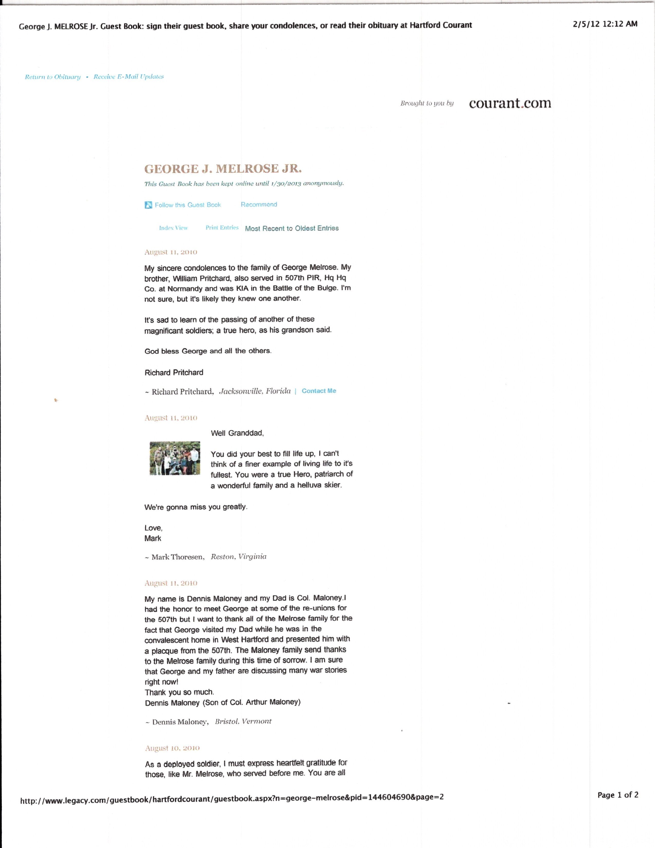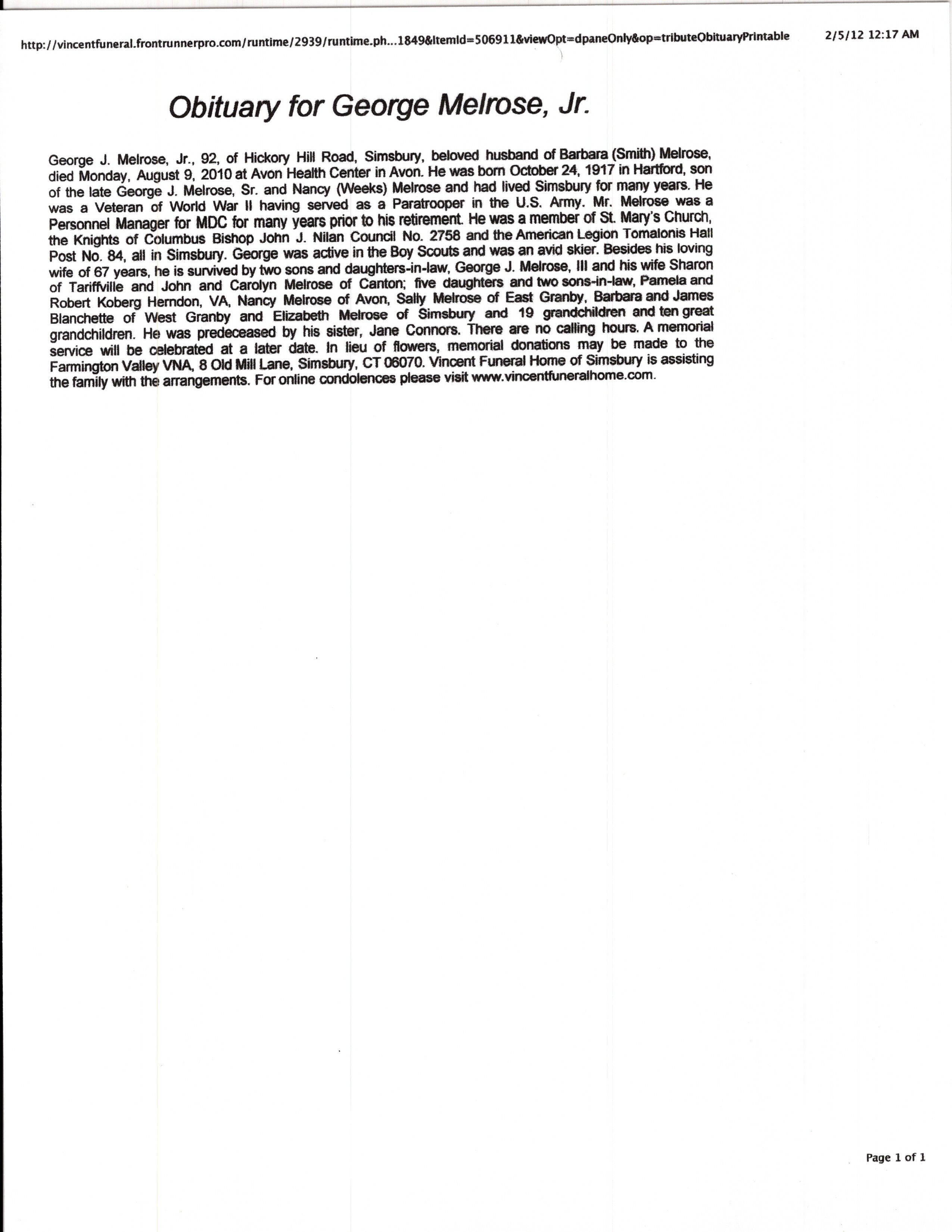 - Research binder with historical information about George J. Melrose Jr.