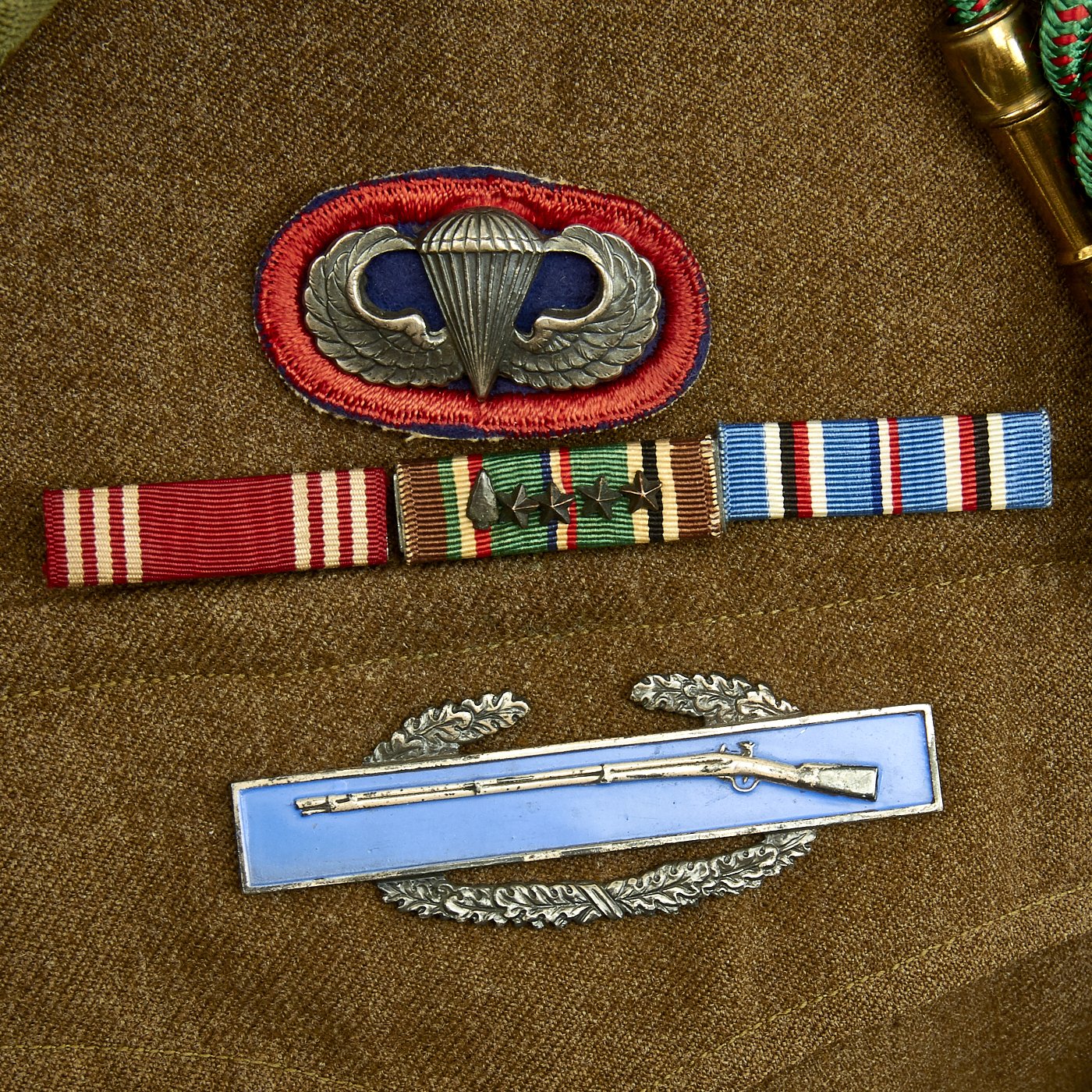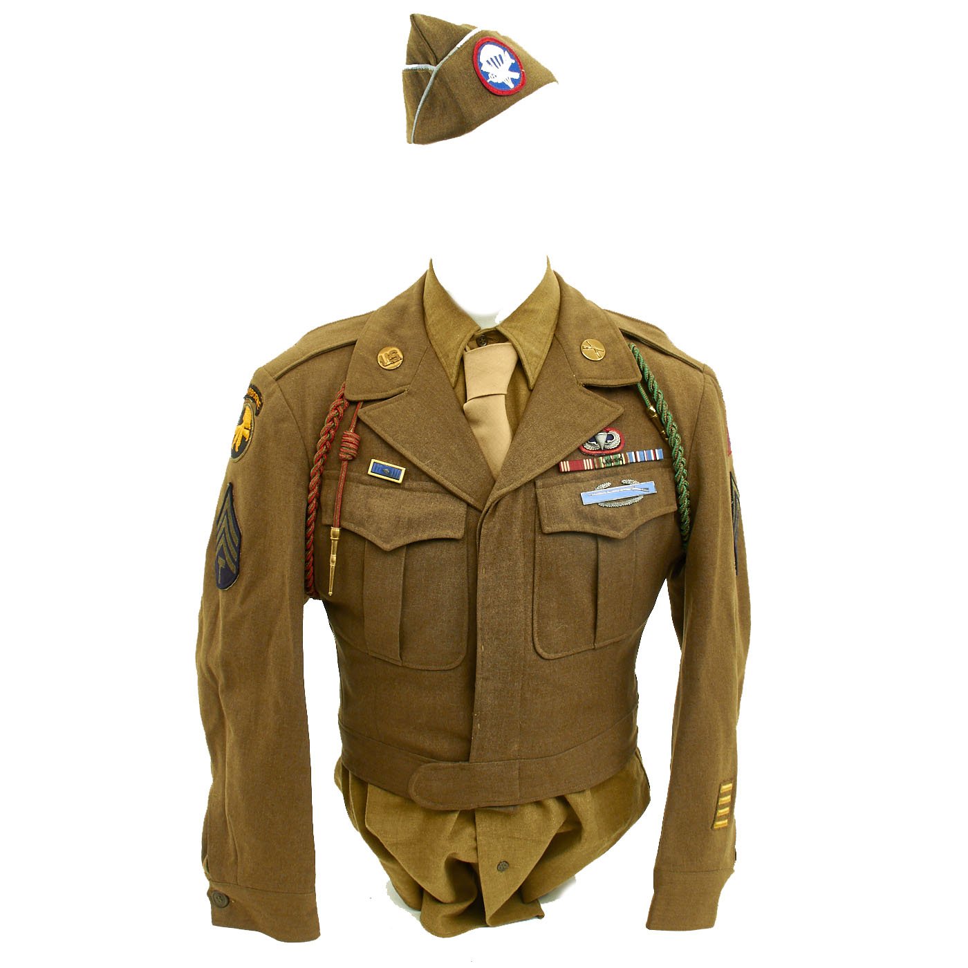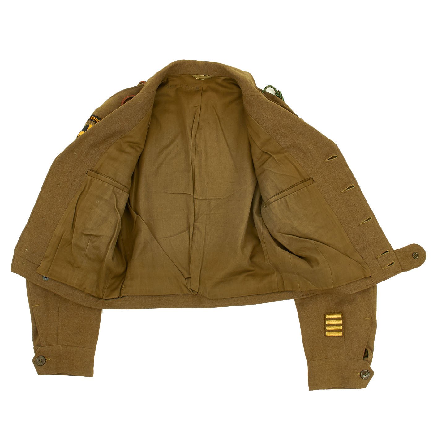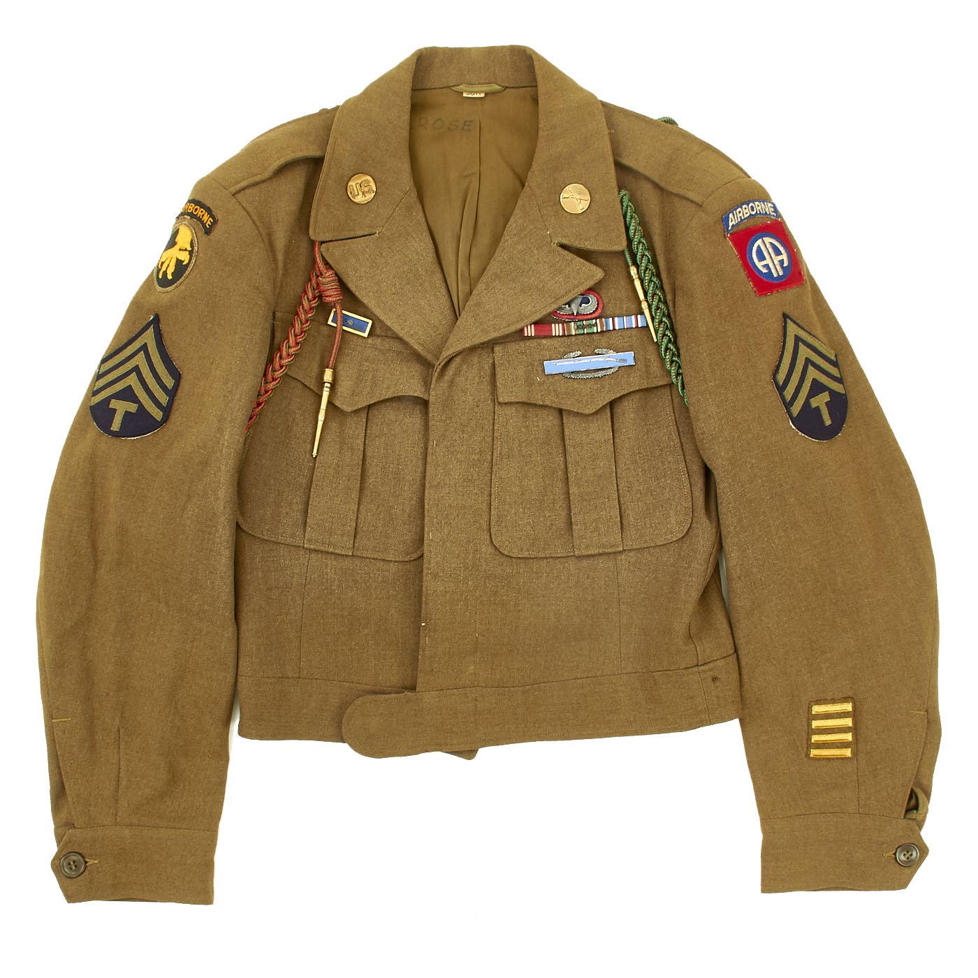 - Ike Jacket offered in very good condition in size 38R. Named on the interior to MELROSE. Features sterling Parachute Jump Wings backed with an oval of blue felt with a red embroidered surround. 82nd Airborne patch on left shoulder, 17th Airborne patch on right shoulder. Army Good Conduct Medal Ribbon, European-African-Middle East Campaign Ribbon with One Invasion Arrowhead and 4 campaign stars, American Campaign Medal ribbon, Presidential Unit Citation. Sterling Silver Combat Infantryman Badge (CBI). The "Belgian Fourragère 1940"- composed of one round smooth cord, partially braided, and of TWO other cords, of which one is terminated by a knot and a brass ferret - it is made of wool and cotton for NCOs and EM, and of silk for Officers - all threads are tinted in colors resembling the ribbon of the Belgian Croix de Guerre 1940 (i.e. basic red, dotted with green threads) - the Fourragère encircles the LEFT shoulder and passes under the armpit, and is fixed by 2 tiny loops onto the button of the shoulder loop. Right should has the French Fourragère.