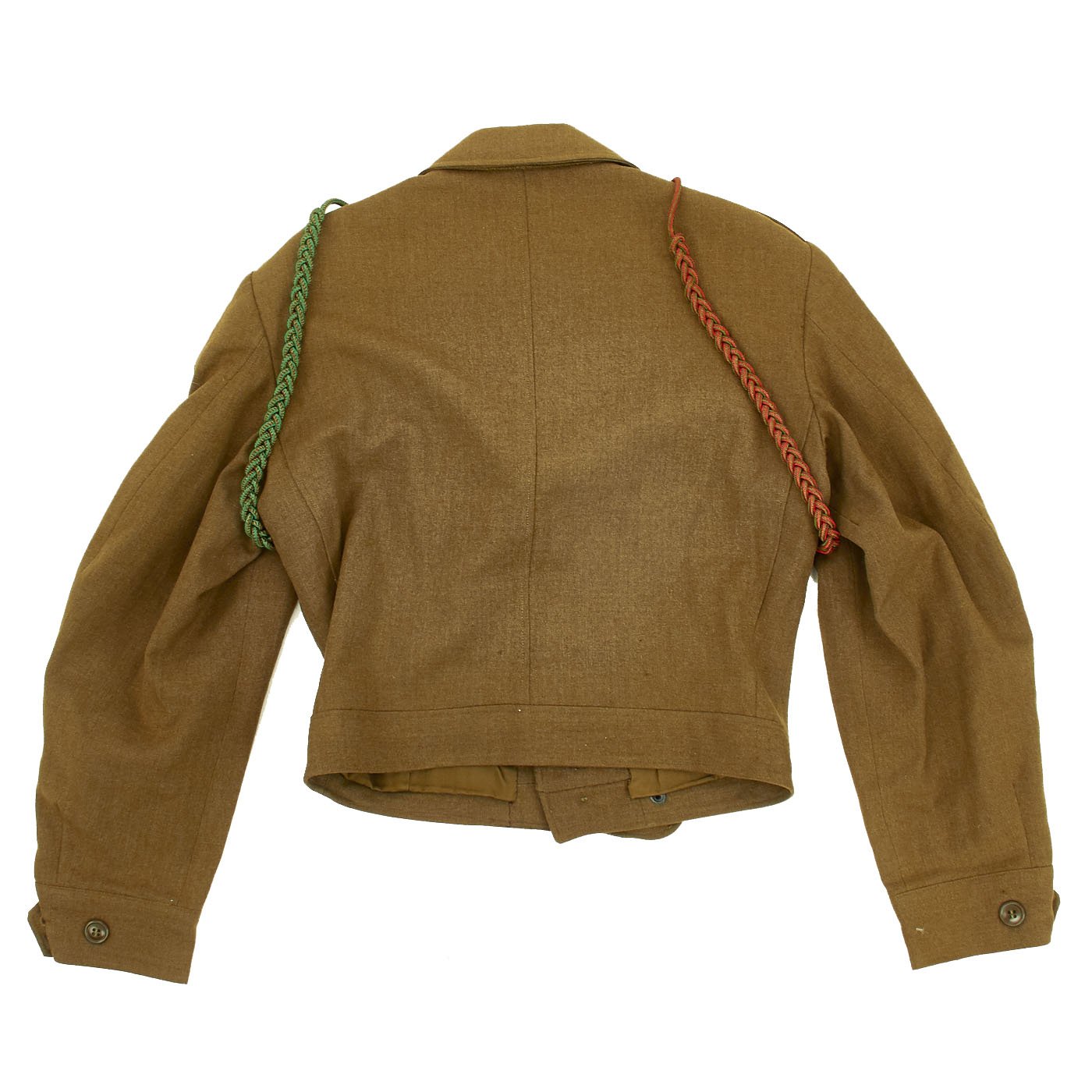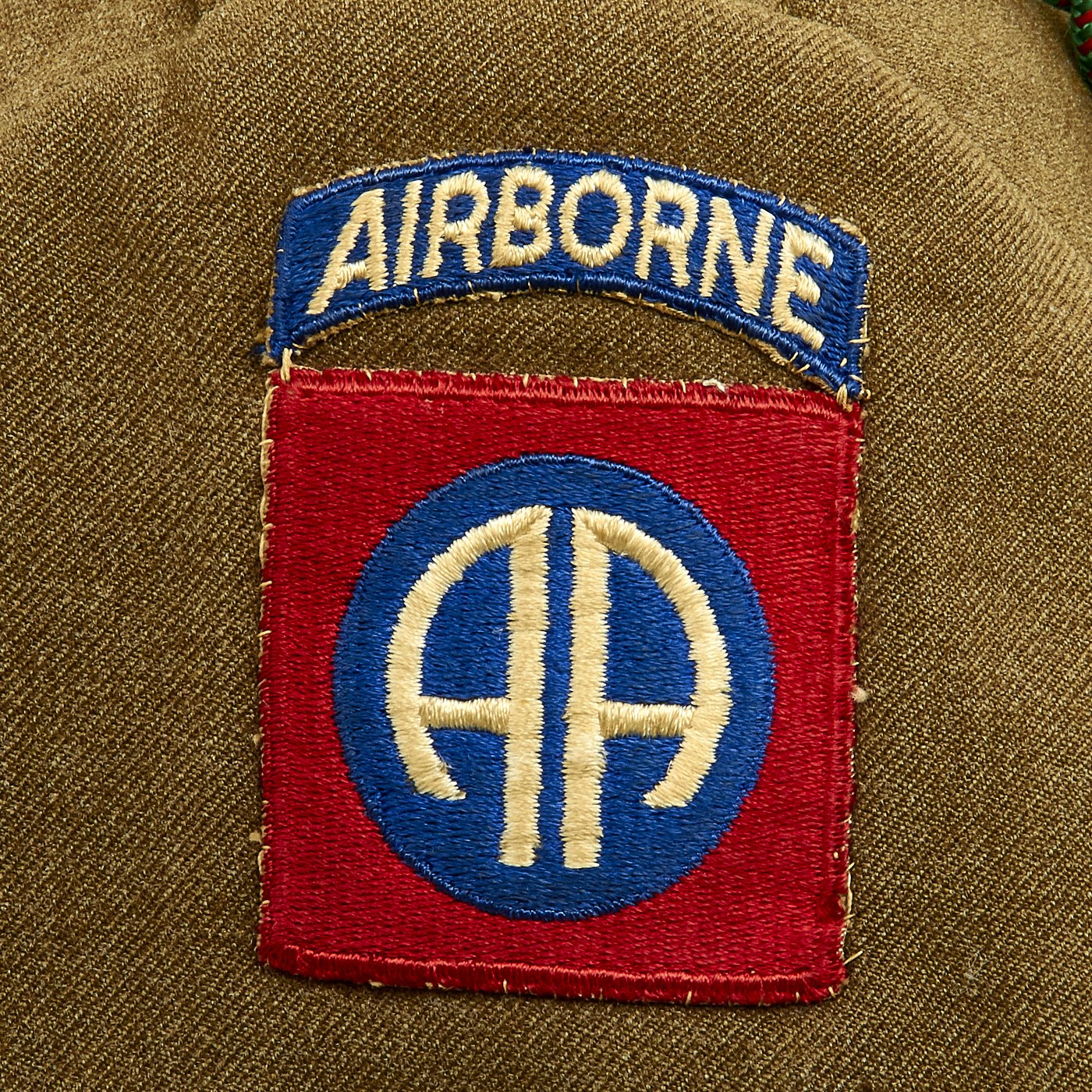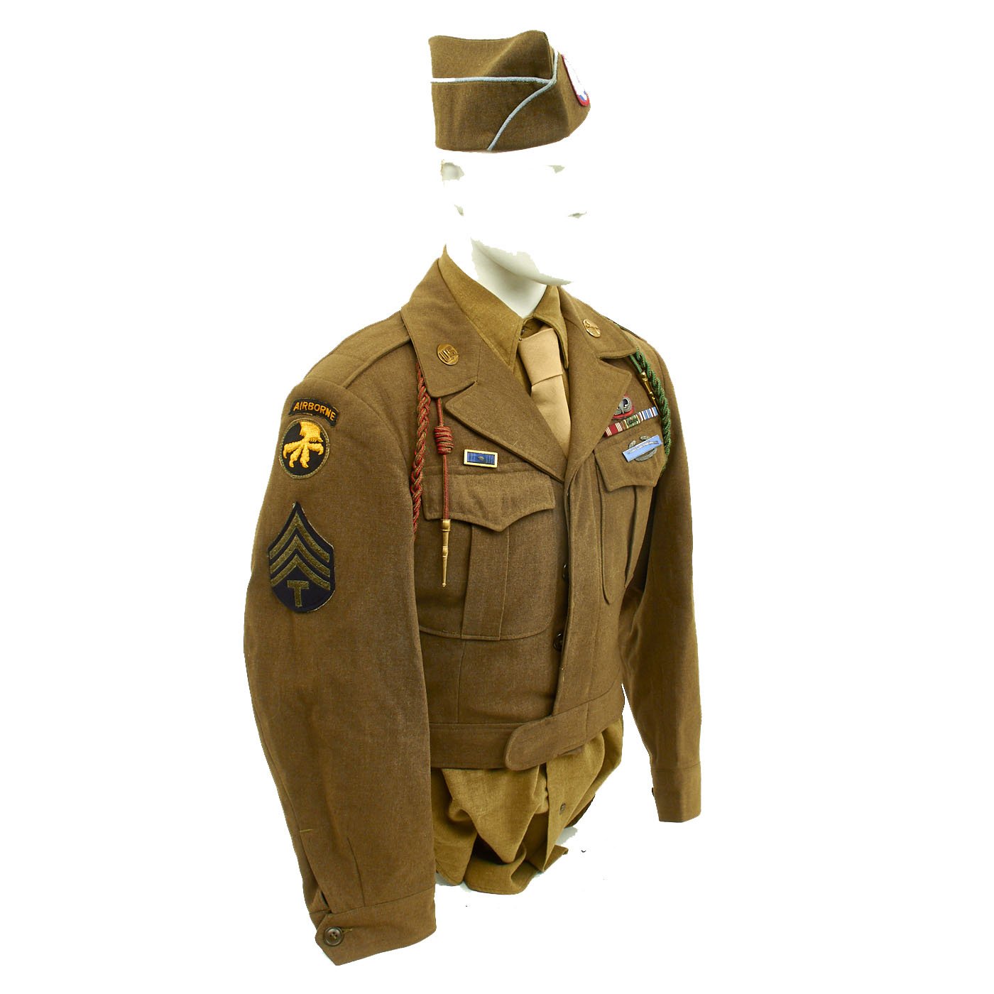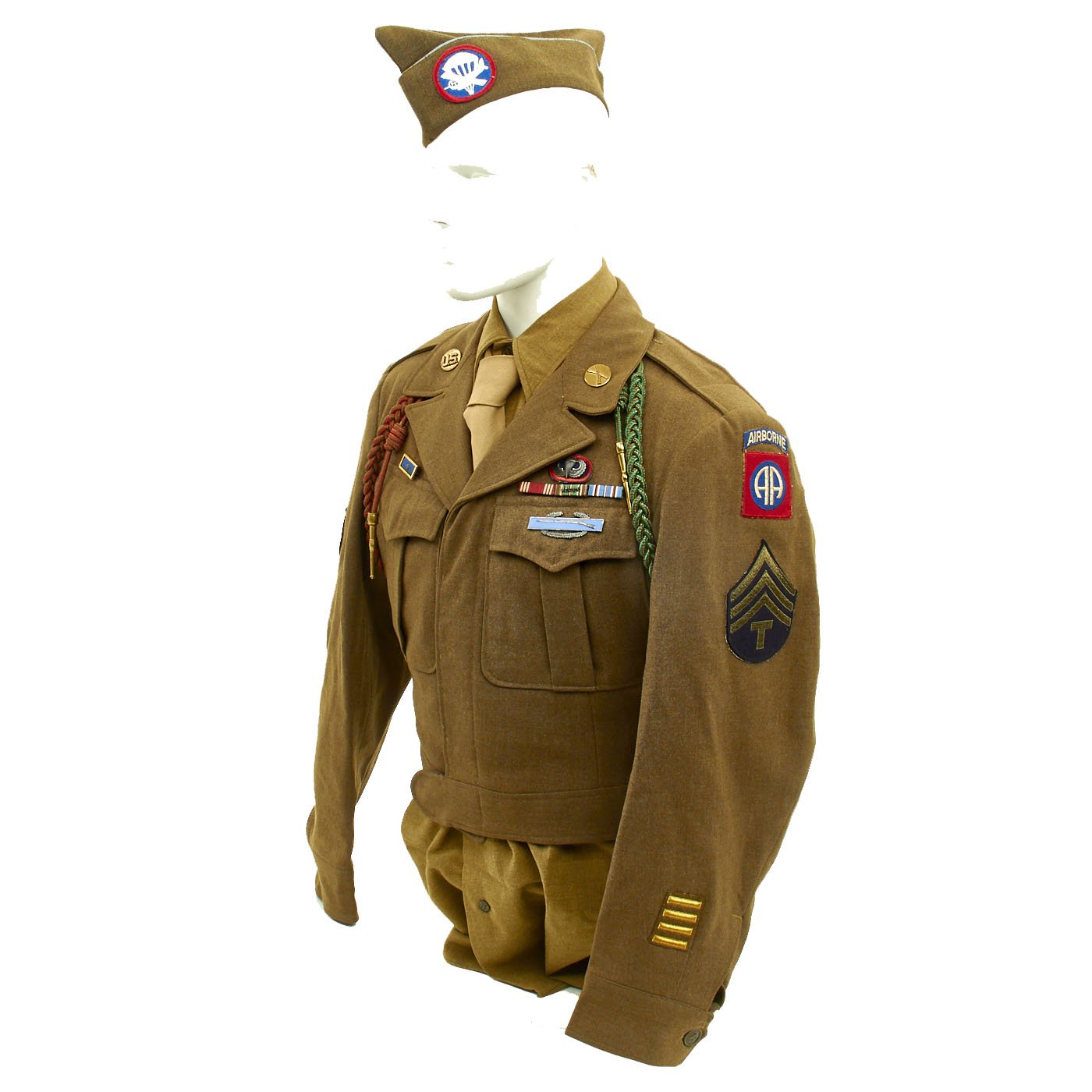 - Ike Jacket offered in very good condition in size 38R. Named on the interior to MELROSE. Features sterling Parachute Jump Wings backed with an oval of blue felt with a red embroidered surround. 82nd Airborne patch on left shoulder, 17th Airborne patch on right shoulder. Army Good Conduct Medal Ribbon, European-African-Middle East Campaign Ribbon with One Invasion Arrowhead and 4 campaign stars, American Campaign Medal ribbon, Presidential Unit Citation. Sterling Silver Combat Infantryman Badge (CBI). The "Belgian Fourragère 1940"- composed of one round smooth cord, partially braided, and of TWO other cords, of which one is terminated by a knot and a brass ferret - it is made of wool and cotton for NCOs and EM, and of silk for Officers - all threads are tinted in colors resembling the ribbon of the Belgian Croix de Guerre 1940 (i.e. basic red, dotted with green threads) - the Fourragère encircles the LEFT shoulder and passes under the armpit, and is fixed by 2 tiny loops onto the button of the shoulder loop. Right should has the French Fourragère.