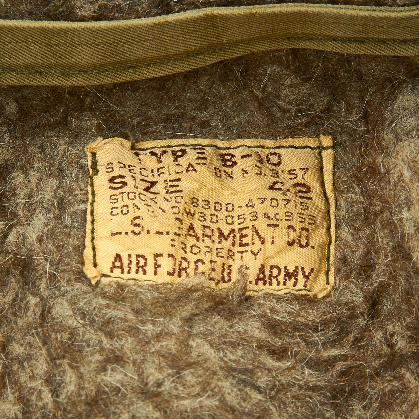 The U. S. Army Air Force Type B-10 Intermediate Flight Jacket was developed as a replacement for both the leather A-2 and sheepskin B-6 Flight Jackets. The B-10 Flight Jacket was the first cloth-shelled, alpaca fur-lined flying jacket of the USAAF, being standardized for service in July 1943. However, actual combat issue did not take place until March 1944, with the 8th Air Force in England receiving an initial issue of B-10 Flight Jackets with the corresponding A-9 Trousers. By the spring of 1944, the B-10 Flight Jacket was appearing in much greater quantities, as evidenced by the many 8th and 9th Air Force aircrews outfitted in