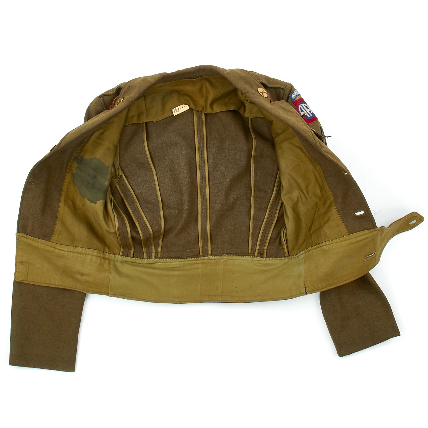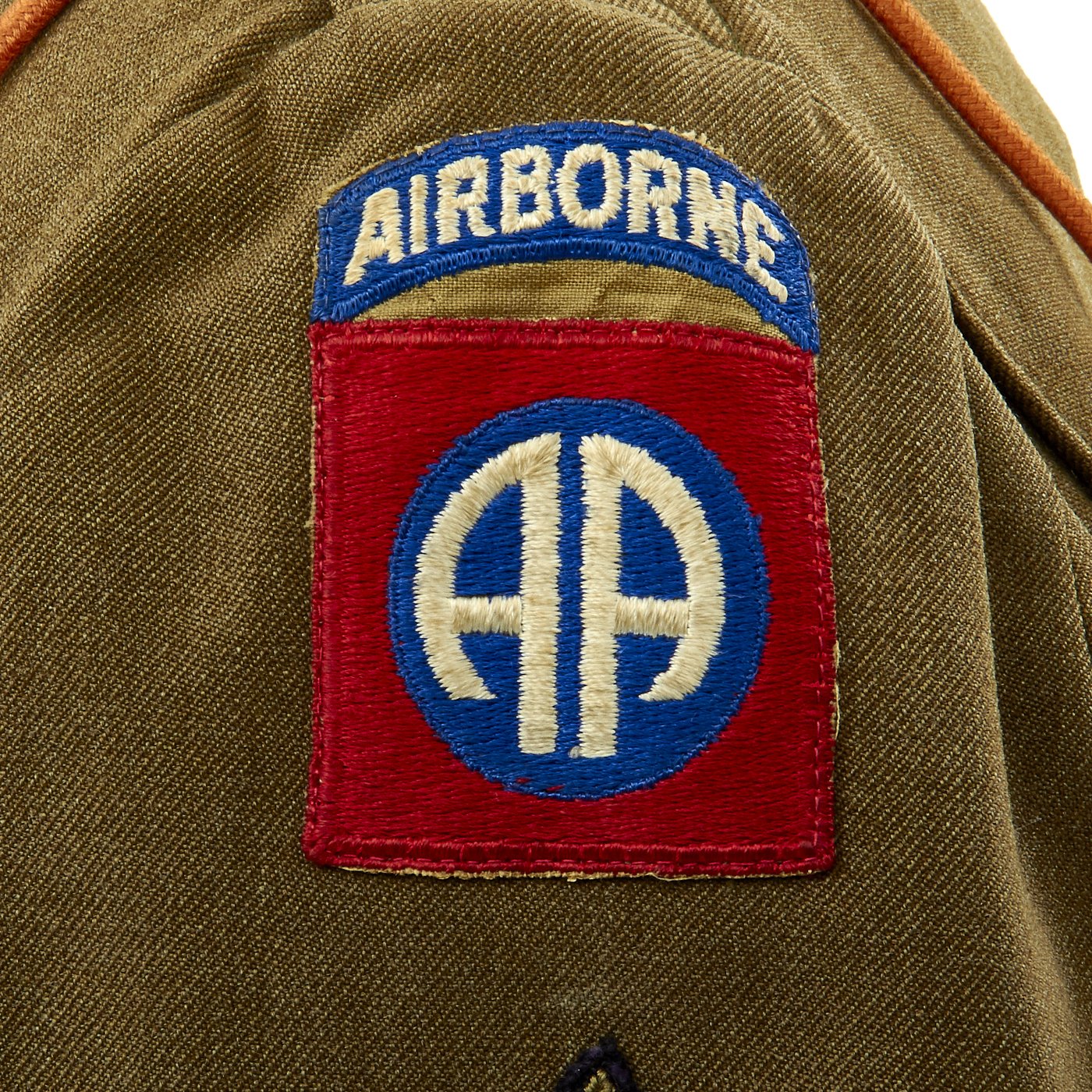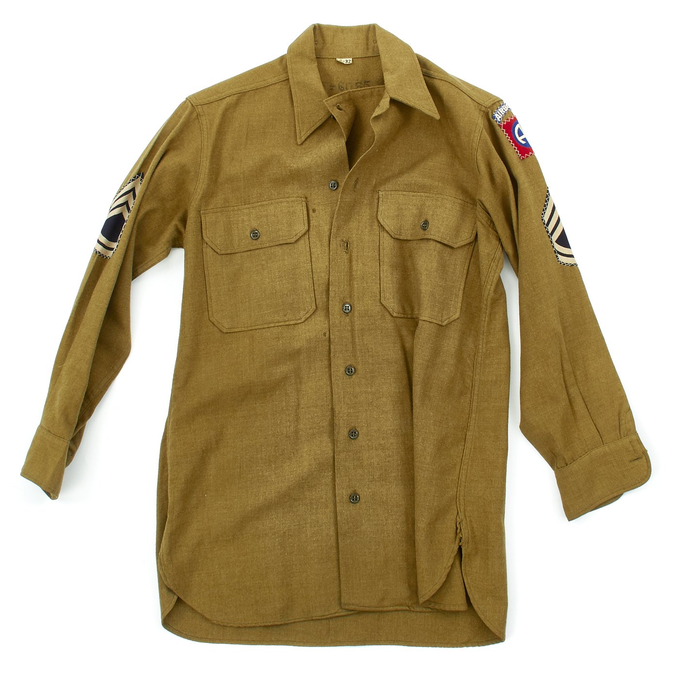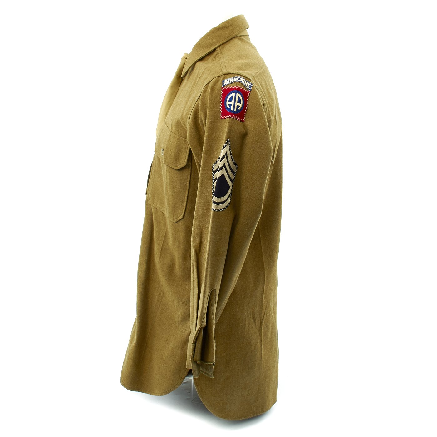 - Army issue wool shirt with 82nd Airborne Division patch to left shoulder and Technical Sergeant Chevrons, all patches stitched with attractive white cross stitching.