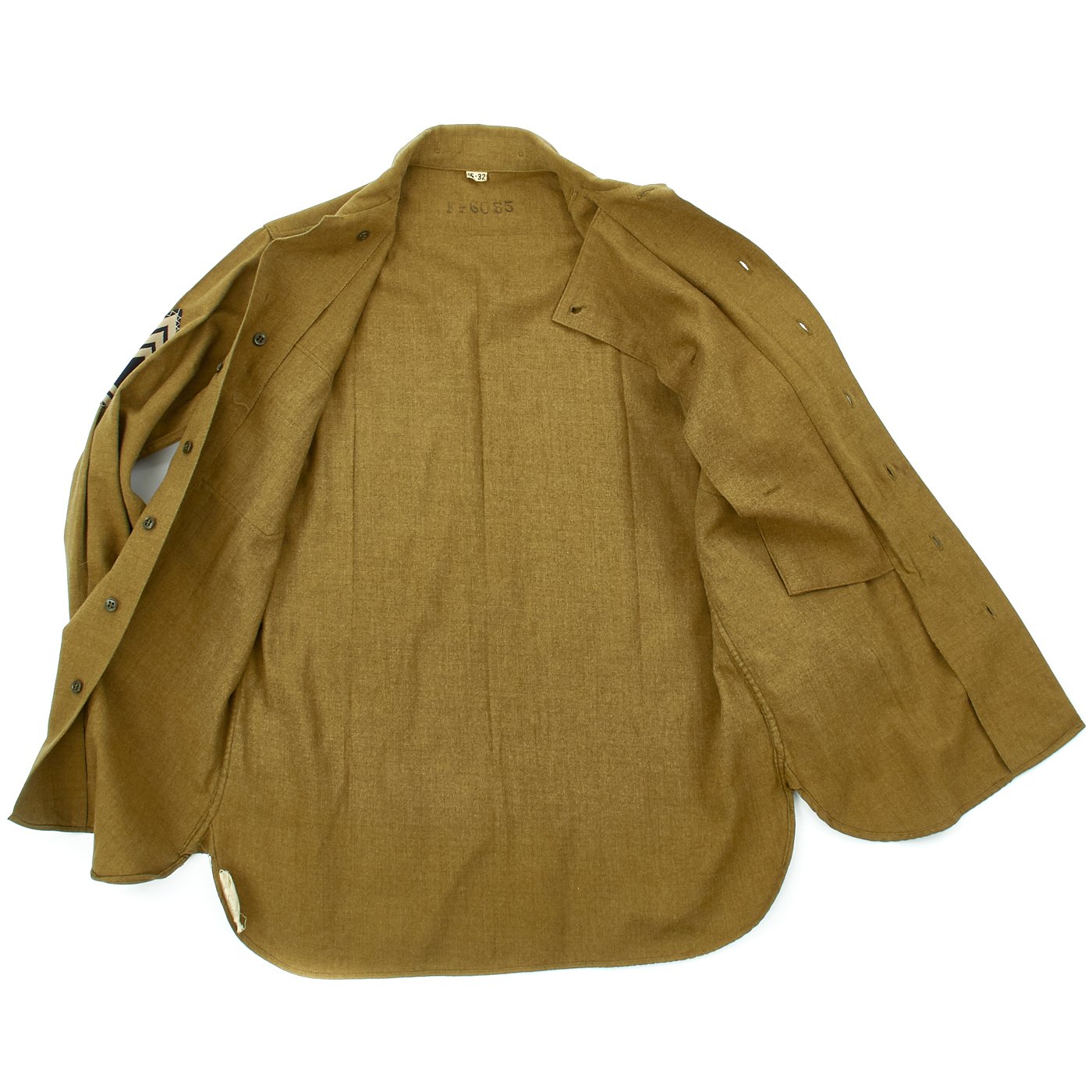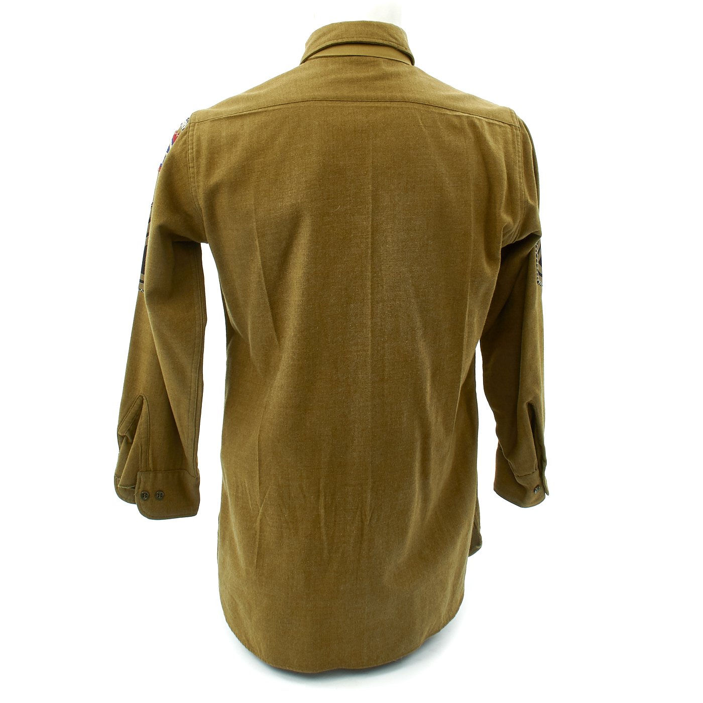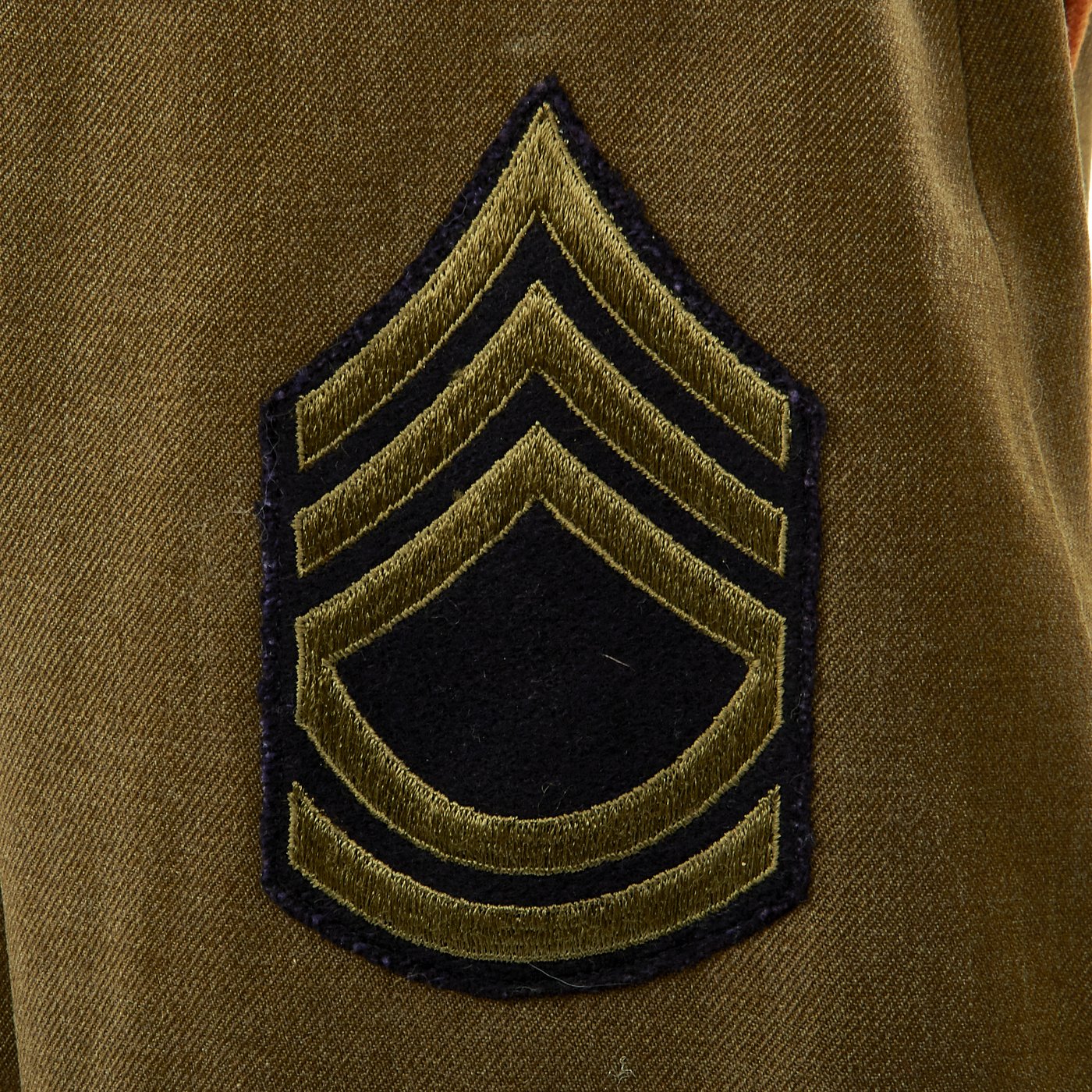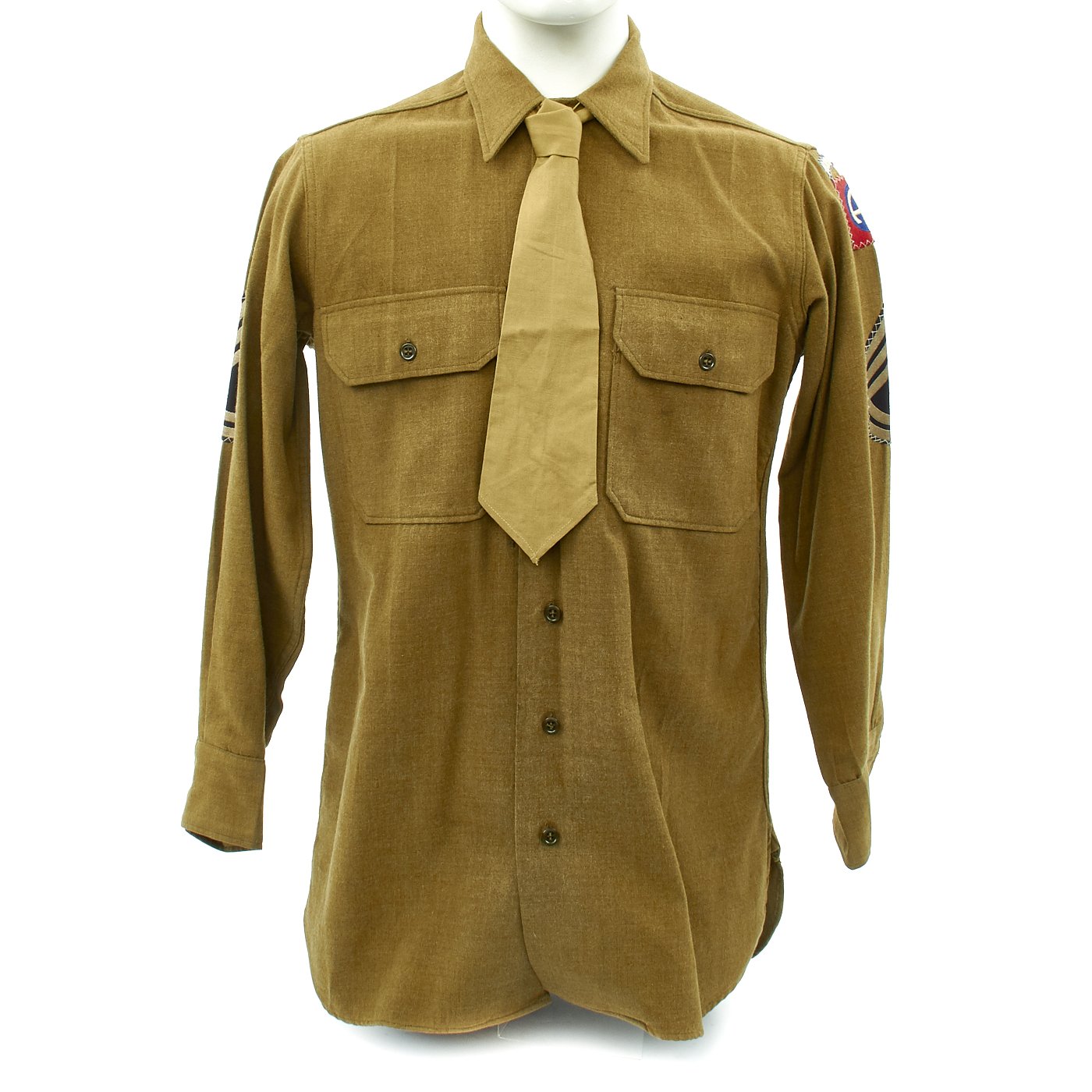 - Army issue wool shirt with 82nd Airborne Division patch to left shoulder and Technical Sergeant Chevrons, all patches stitched with attractive white cross stitching.