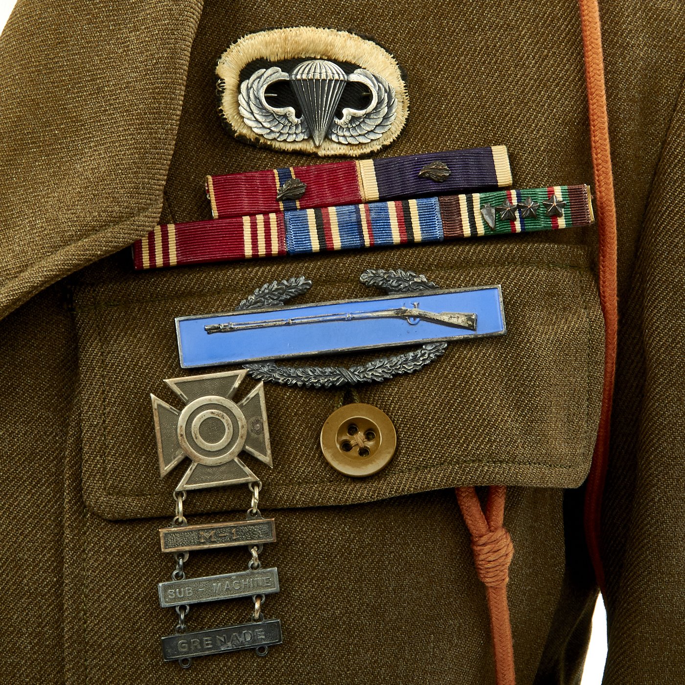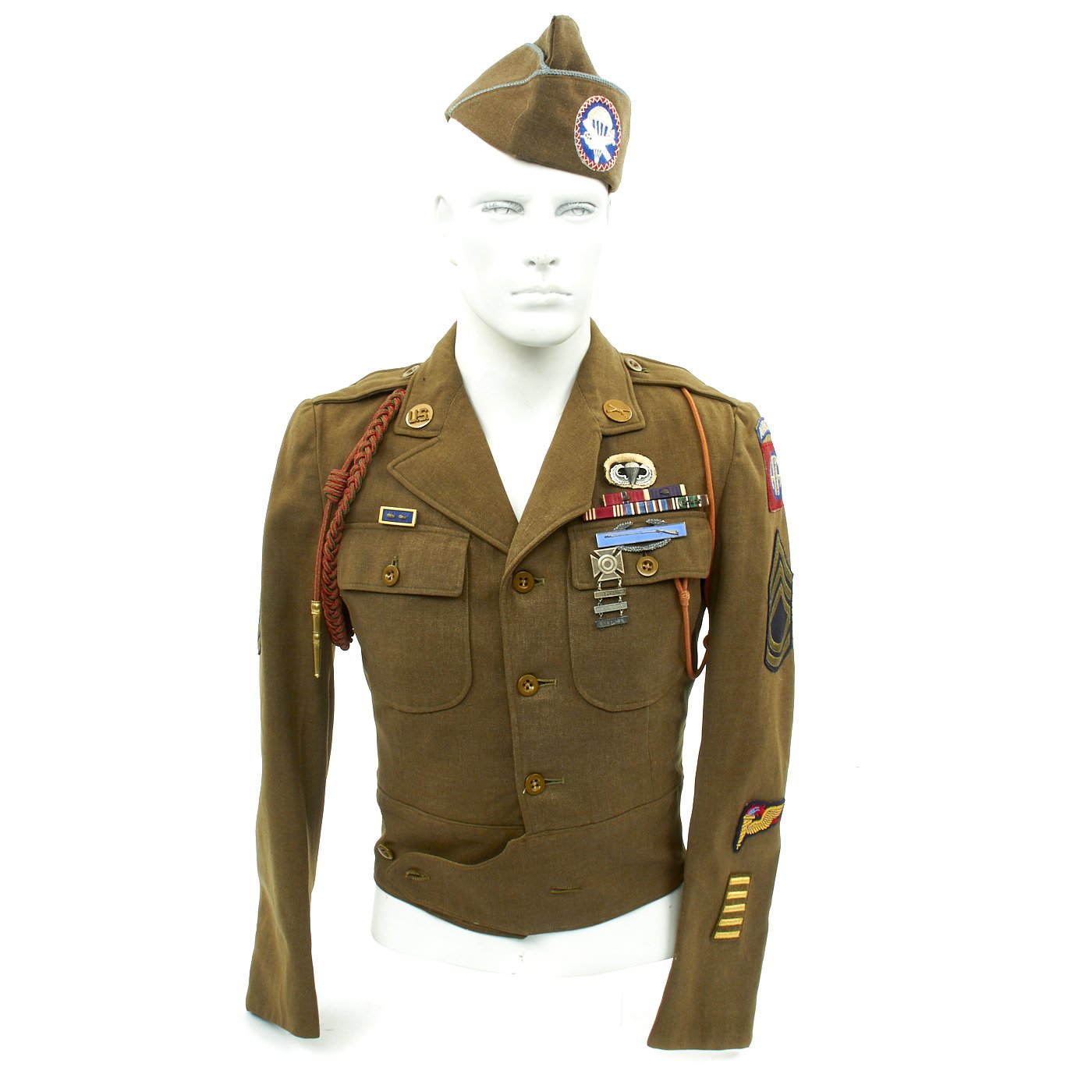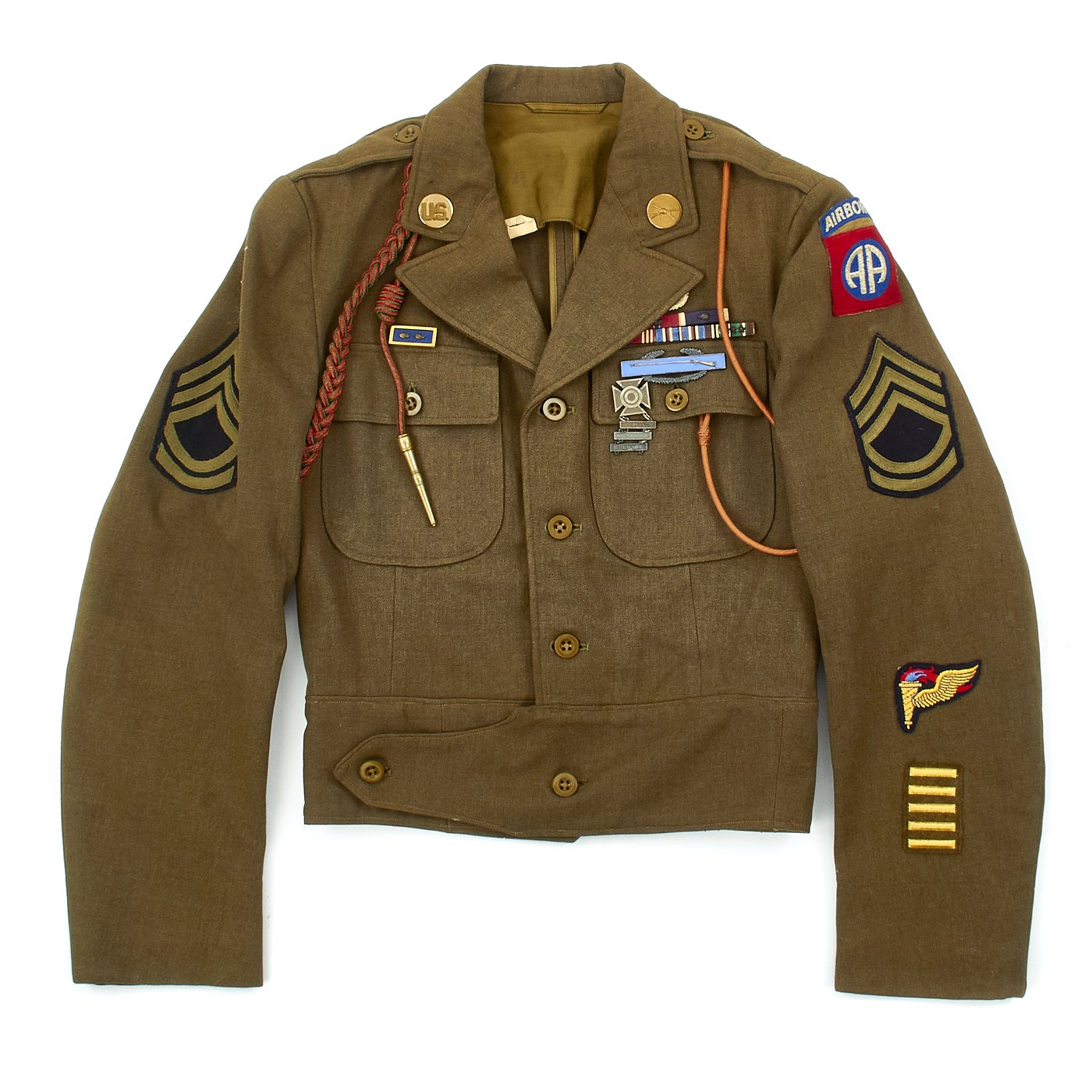 - Technical Sergeant's Savage Ike jacket in size 36R. The interior is ink stamped S-8814 which represents the first letter of his last name (Savage) and the final four digits of his Army Serial Number. The patches, ribbons, awards are as follows: Paratrooper Sterling Silver Wings with English made twill black with white border 508th PIR Jump Oval, Bronze Star Medal Ribbon with oak leaf cluster, Purple Heart Medal Ribbon with oak leaf cluster, Army Good Conduct, American Campaign Medal, European-African-Middle East Campaign Medal Ribbon with Invasion Arrowhead (Operation Market Garden) and 3 Battle Campaign Stars. 82nd Airborne Patch to left shoulder, Sterling Silver Combat Infantry Man's Badge, Presidential Unit Citation with two oak leaf clusters, Pathfinder patch on left cuff, five overseas combat service bars (on left sleeve cuff) meaning 30+ months of combat service. The "Belgian Fourragère 1940" which is comprised of one round smooth cord, partially braided, and of TWO other cords, of which one is terminated by a knot and a brass ferret - it is made of wool and cotton for NCOs and EM - all threads are tinted in colors resembling the ribbon of the Belgian Croix de Guerre 1940 (i.e. basic red, dotted with green threads) - the Fourragère encircles the LEFT shoulder and passes under the armpit, and is fixed by 2 tiny loops onto the button of the shoulder loop. "Order of the Orange" shoulder cord awarded by the Dutch government for surviving Operation Market Garden.