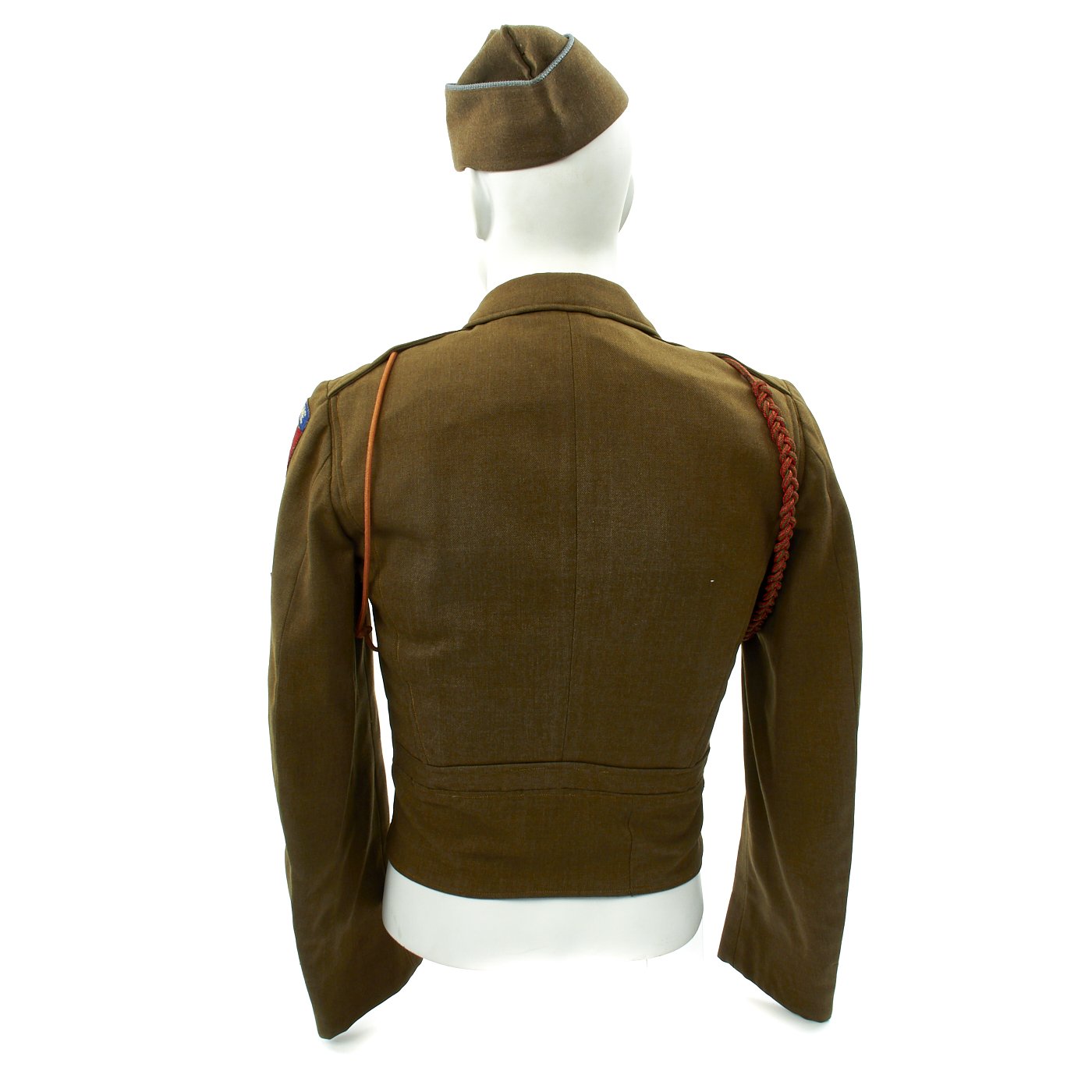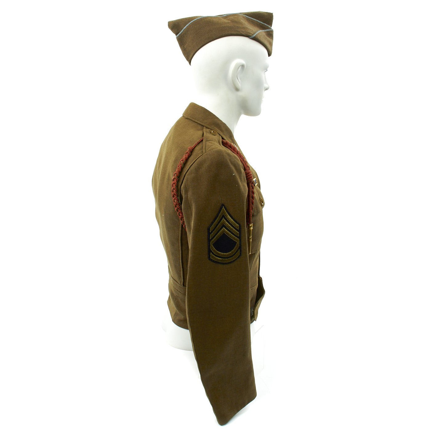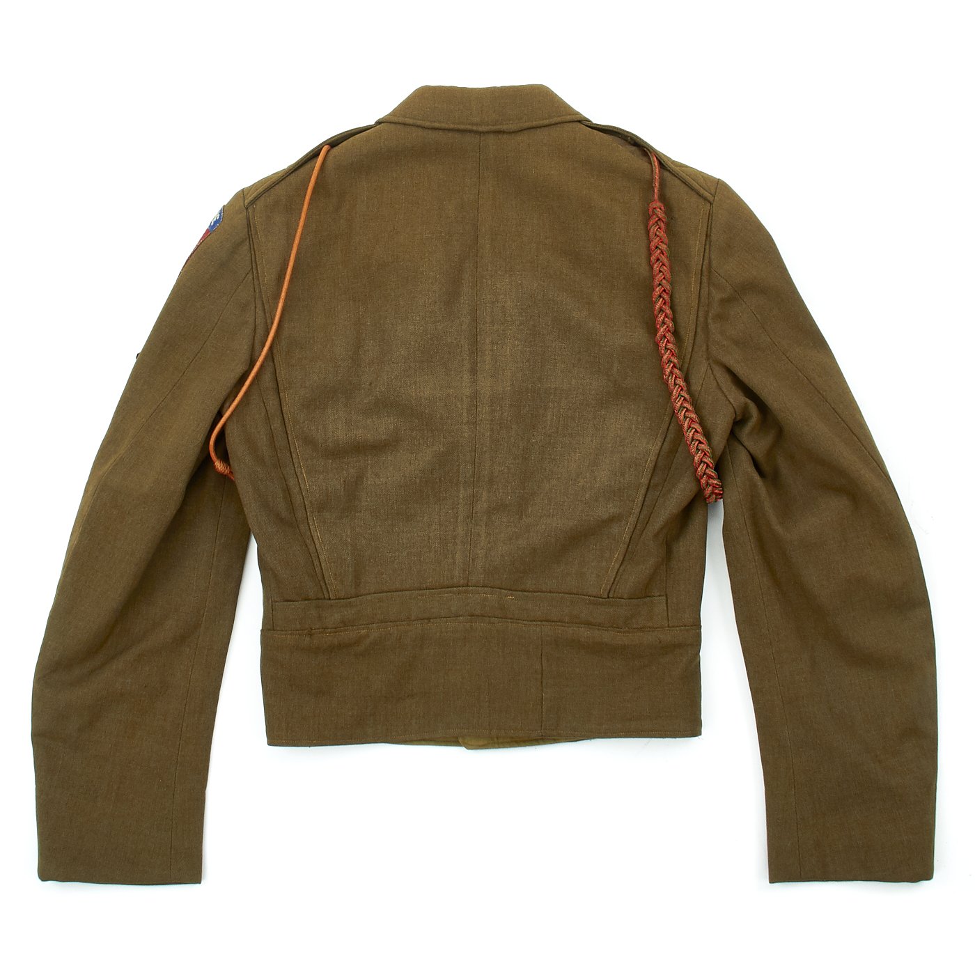- Technical Sergeant's Savage Ike jacket in size 36R. The interior is ink stamped S-8814 which represents the first letter of his last name (Savage) and the final four digits of his Army Serial Number. The patches, ribbons, awards are as follows: Paratrooper Sterling Silver Wings with English made twill black with white border 508th PIR Jump Oval, Bronze Star Medal Ribbon with oak leaf cluster, Purple Heart Medal Ribbon with oak leaf cluster, Army Good Conduct, American Campaign Medal, European-African-Middle East Campaign Medal Ribbon with Invasion Arrowhead (Operation Market Garden) and 3 Battle Campaign Stars. 82nd Airborne Patch to left shoulder, Sterling Silver Combat Infantry Man's Badge, Presidential Unit Citation with two oak leaf clusters, Pathfinder patch on left cuff, five overseas combat service bars (on left sleeve cuff) meaning 30+ months of combat service. The "Belgian Fourragère 1940" which is comprised of one round smooth cord, partially braided, and of TWO other cords, of which one is terminated by a knot and a brass ferret - it is made of wool and cotton for NCOs and EM - all threads are tinted in colors resembling the ribbon of the Belgian Croix de Guerre 1940 (i.e. basic red, dotted with green threads) - the Fourragère encircles the LEFT shoulder and passes under the armpit, and is fixed by 2 tiny loops onto the button of the shoulder loop. "Order of the Orange" shoulder cord awarded by the Dutch government for surviving Operation Market Garden.
