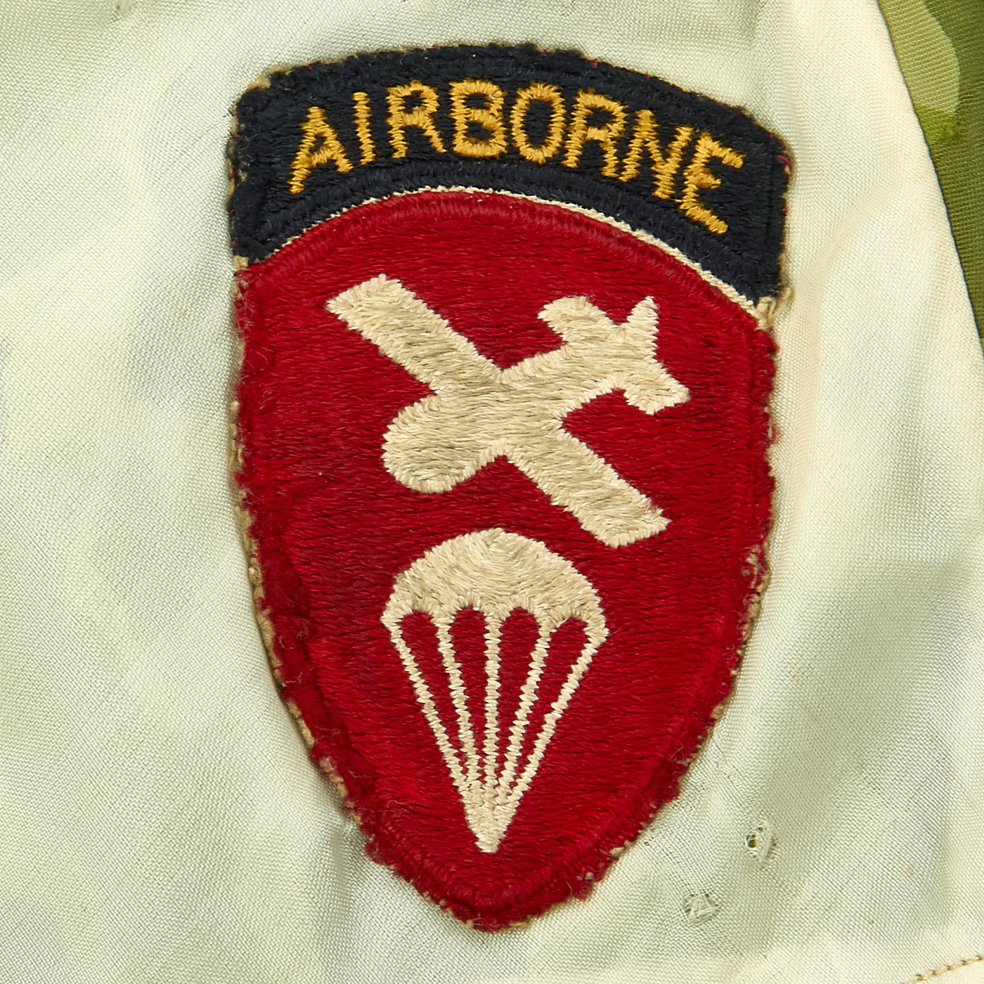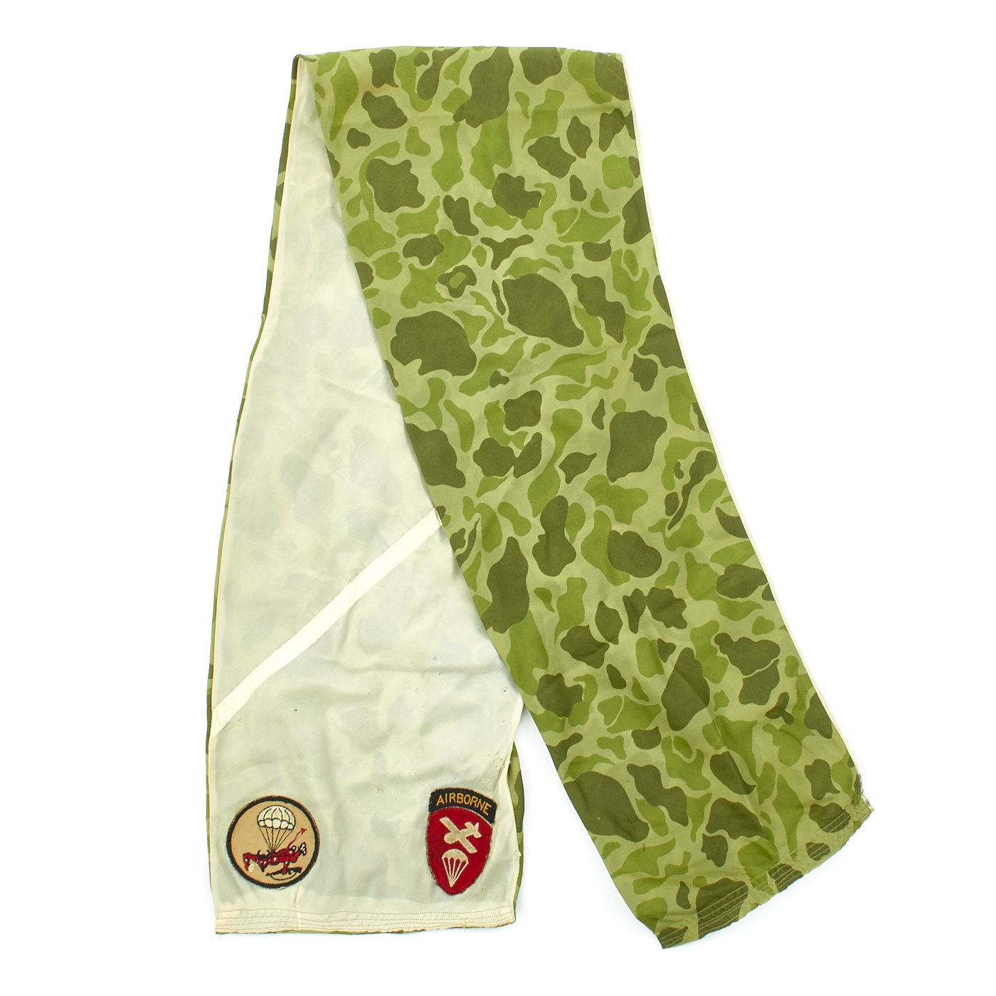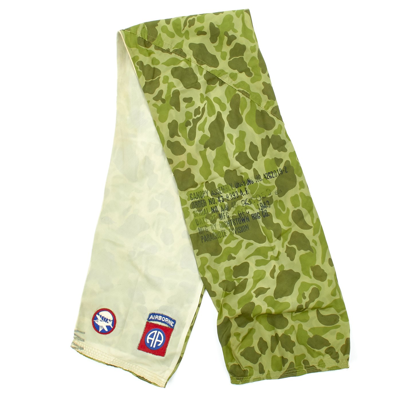 - Original airborne scarf constructed from a WWII paratrooper parachute with 508th PIR embroidered patch, 82nd Airborne Patch, Glider Parachute Cap badge, and Airborne Command Patch all stitched to the ends of the scarf. Scarf is camouflage on one side and white on the other. The section of parachute includes the manufacturer stamping which is dated December 1943!