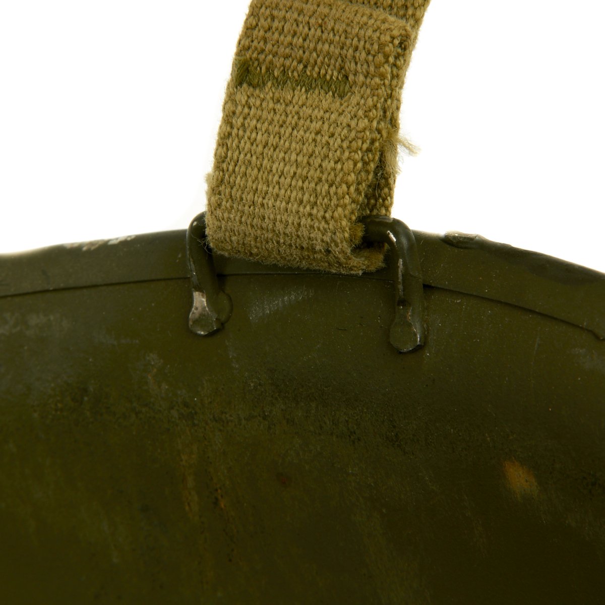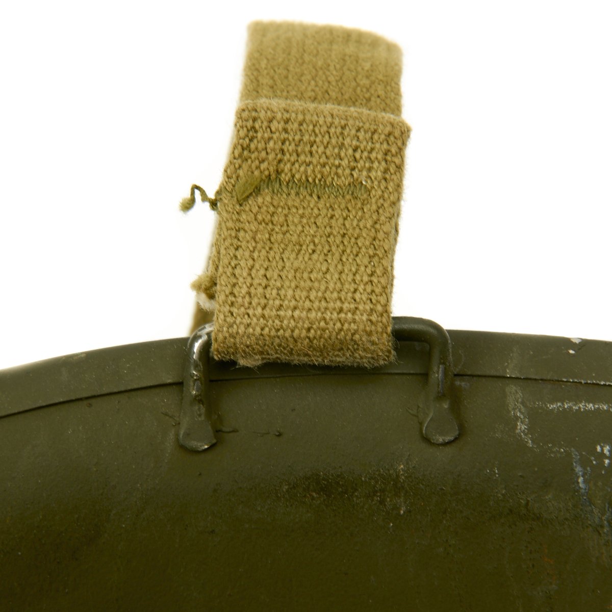 This helmet is a fine example and still retains all of its original WW2 parts and the shell has all original "corked" grain paint with front seam and fixed bails.