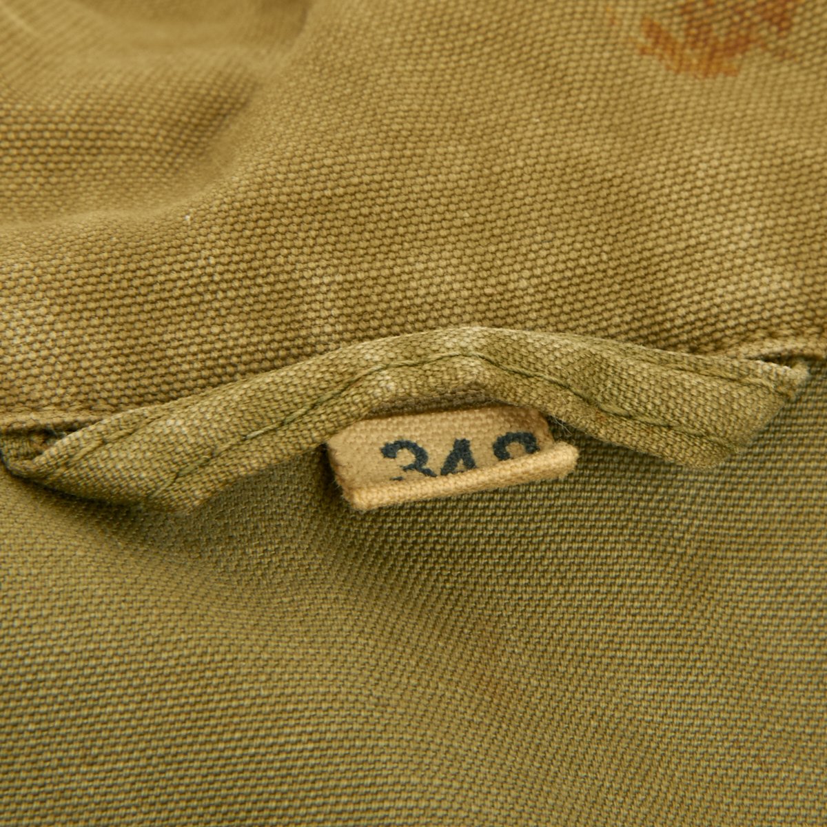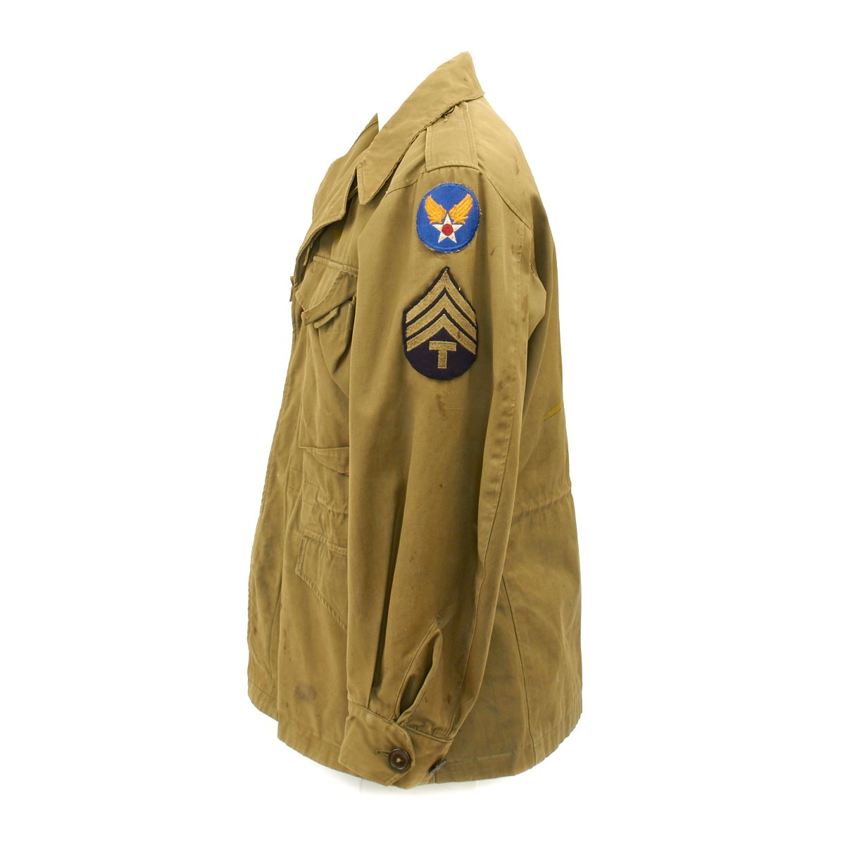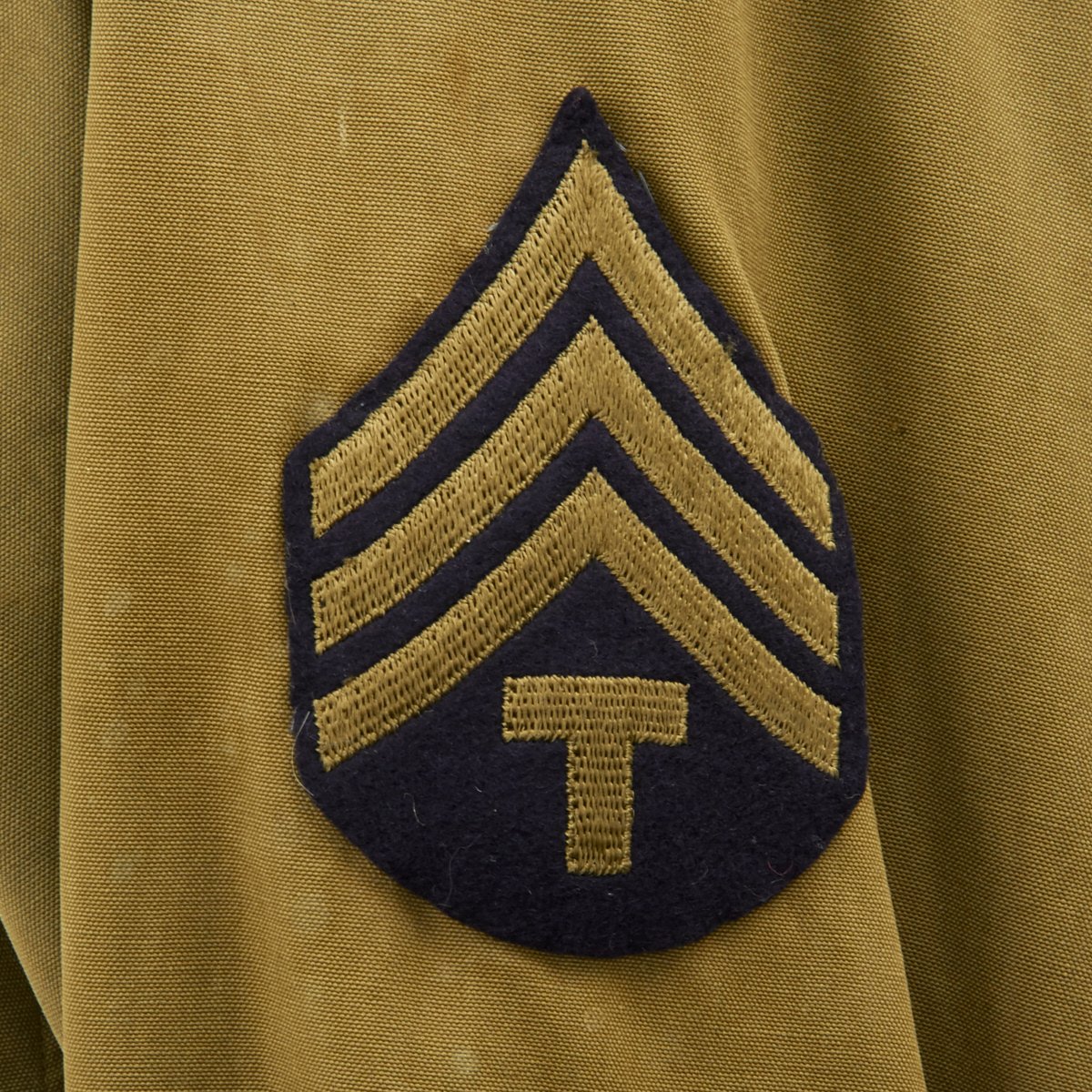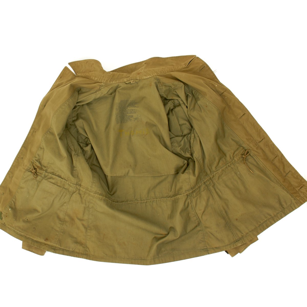This is a genuine M43 Field Jacket used by member of the 61st Fighter Squadron during World War Two. It is in excellent condition and approximately a size 36. All buttons are present and the internal drawstring is complete. It has technical sergeant chevrons on each sleeve and an allied air force insignia patch on the left shoulder.