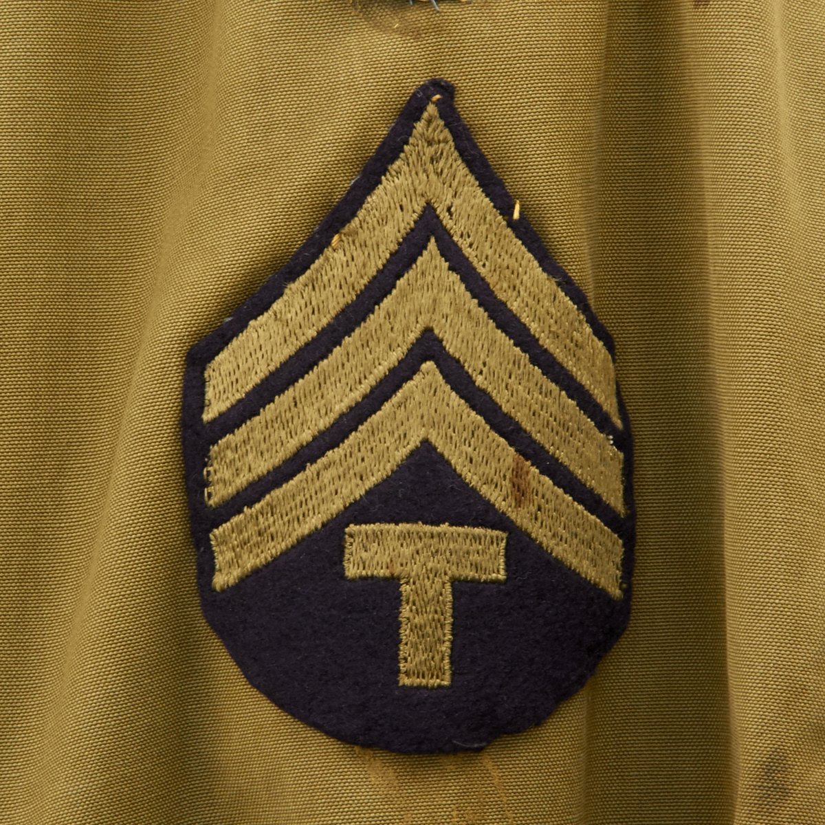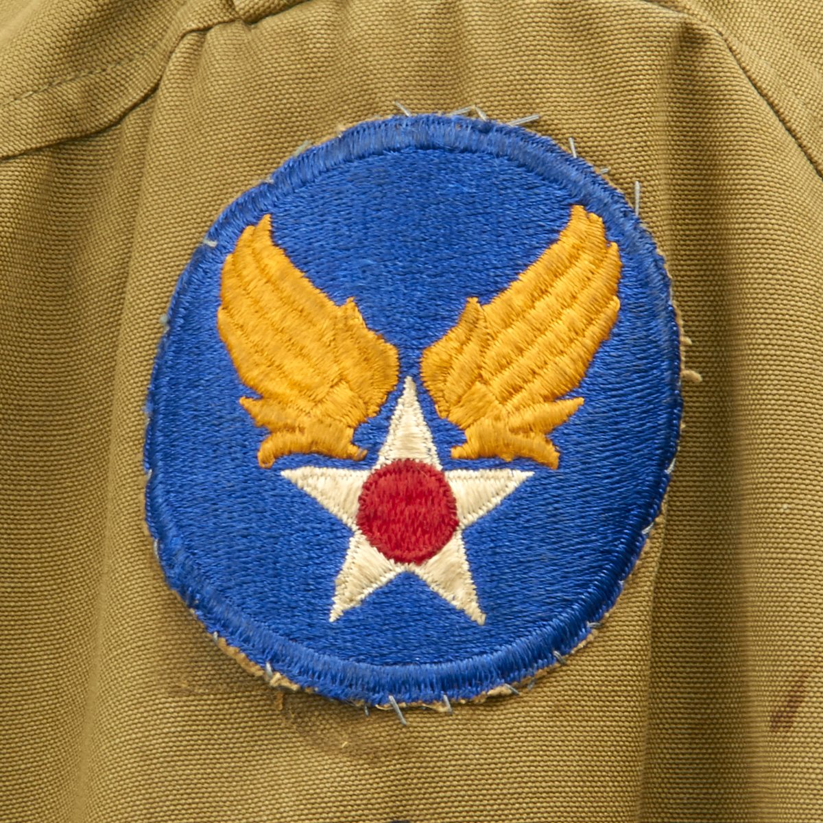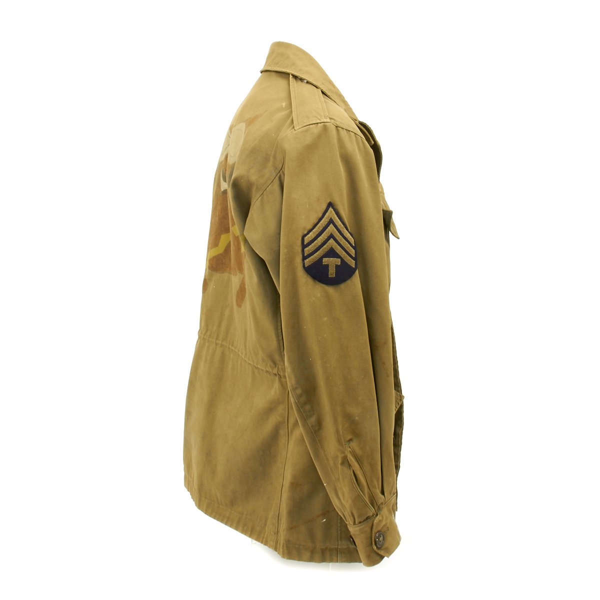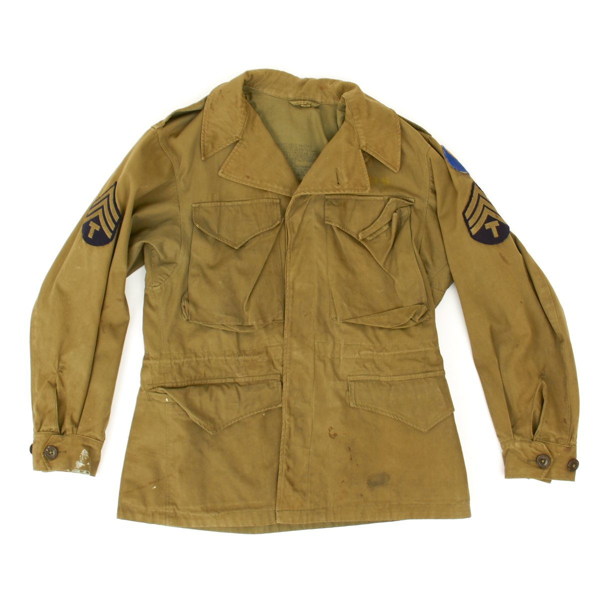 This is a genuine M43 Field Jacket used by member of the 61st Fighter Squadron during World War Two. It is in excellent condition and approximately a size 36. All buttons are present and the internal drawstring is complete. It has technical sergeant chevrons on each sleeve and an allied air force insignia patch on the left shoulder.